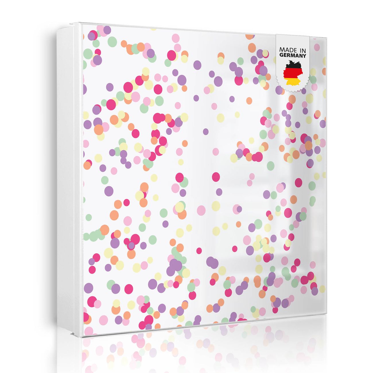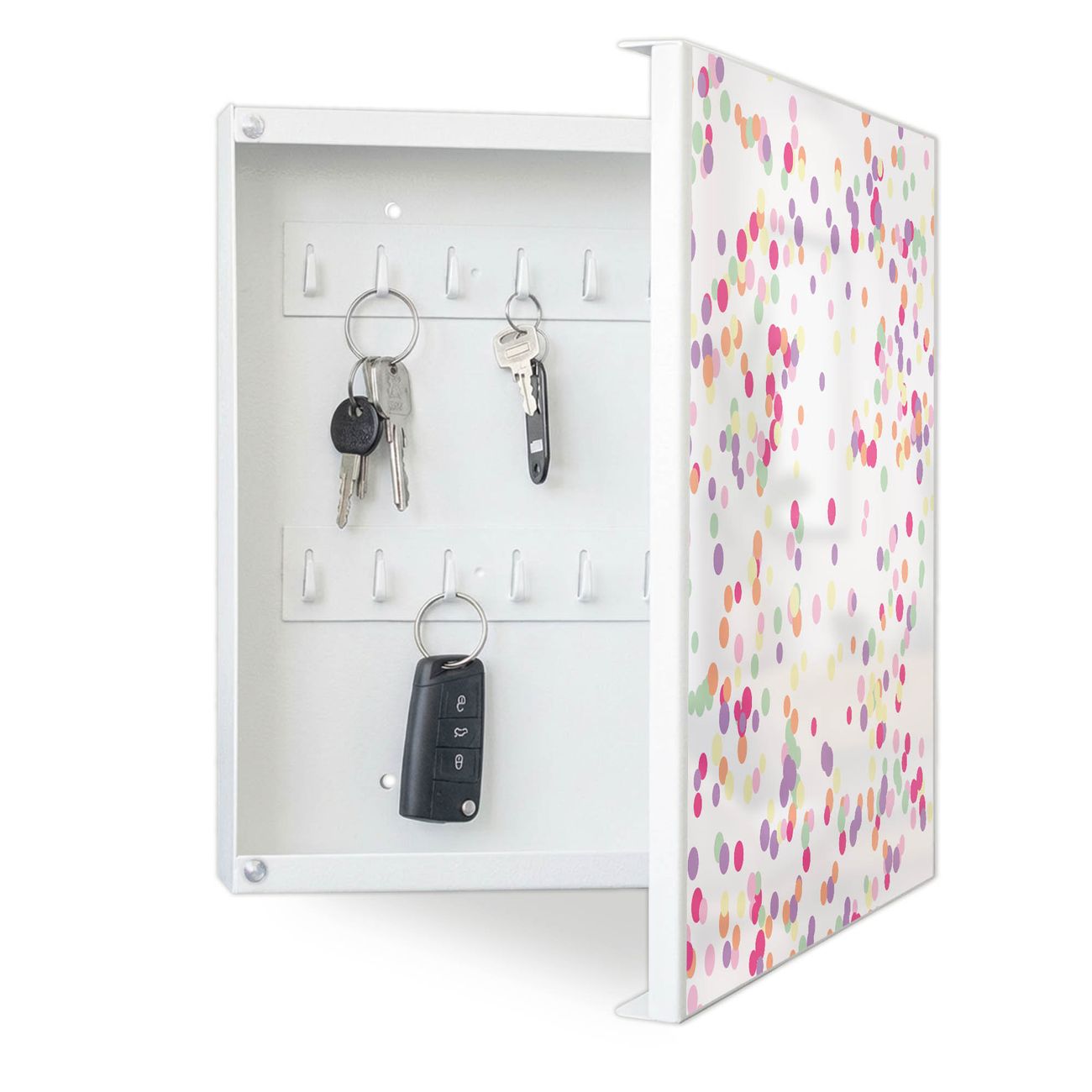 Bringe Ordnung und Eleganz in deinen Eingangsbereich mit dem banjado Schlüsselkasten Motiv Motiv Konfettiregen. Die moderne Schlüsselbox kombiniert funktionales Design mit hochwertiger Verarbeitung und wird so zu einem echten Hingucker in Flur, Büro oder Ferienwohnung. ✅ Stilvolle Schlüsselaufbewahrung mit Motiv Motiv Konfettiregen Der Design-Schlüsselkasten Motiv Motiv Konfettiregen bietet Platz für bis zu 32 Schlüssel, die auf 4 stabilen Reihen mit je 8 Haken übersichtlich verstaut werden. Mit seinen kompakten Maßen von 30 x 30 x 5 cm passt die Schlüsselbox perfekt auch in kleinere Räume. Der weiß lackierte Stahlkorpus mit rechts angeschlagenem Türscharnier harmoniert mit gedruckten Folie auf der Front und fügt sich nahtlos in jedes Wohnambiente ein. Ob als Schlüsselorganizer für Zuhause oder als praktische Lösung für Büros, Praxen und Gewerbe, der banjado Schlüsselkasten sorgt für Ordnung und Übersicht. Dank der magnetischen, mit Kreidestiften beschreibbaren Folie auf der Front kannst du Notizen anheften oder Termine direkt auf der Oberfläche festhalten. Die Schlüsselbox Motiv Motiv Konfettiregen zur Wandmontage wird inklusive Befestigungsmaterial geliefert und ist schnell angebracht. So hast du deine Schlüssel jederzeit griffbereit und zugleich stilvoll verstaut. Mit diesem banjado Schlüsselkasten Motiv Motiv Konfettiregen kombinierst du praktische Aufbewahrung mit stilvollem Wohndesign. Ob privat oder geschäftlich, die Schlüsselbox sorgt für mehr Ordnung, Übersicht und ein wohnliches Ambiente.Vorteile im Überblick