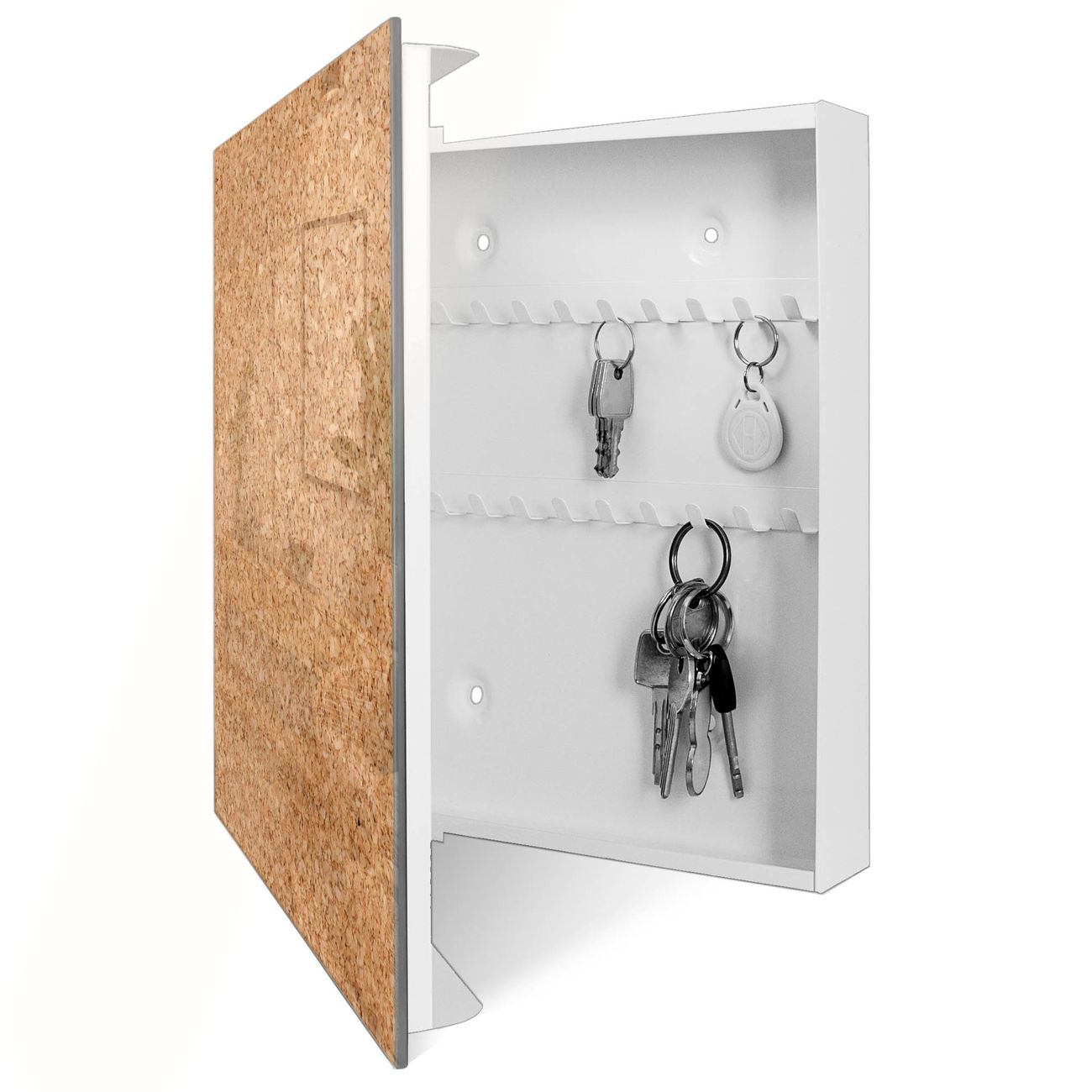 Bringe Ordnung und Eleganz in deinen Eingangsbereich mit dem banjado Schlüsselkasten Motiv Motiv Kork. Die moderne Schlüsselbox kombiniert funktionales Design mit hochwertiger Verarbeitung und wird so zu einem echten Hingucker in Flur, Büro oder Ferienwohnung. ✅ Stilvolle Schlüsselaufbewahrung mit Glasfront im Motiv Motiv Kork Der Design-Schlüsselkasten Motiv Motiv Kork bietet Platz für bis zu 50 Schlüssel, die auf 5 stabilen Reihen mit je 10 Haken übersichtlich verstaut werden. Mit seinen kompakten Maßen von 30 x 30 x 5 cm passt die Schlüsselbox perfekt auch in kleinere Räume. Der weiß lackierte Stahlkorpus mit rechts angeschlagenem Türscharnier harmoniert mit der Glasfront und fügt sich nahtlos in jedes Wohnambiente ein. Ob als Schlüsselorganizer für Zuhause oder als praktische Lösung für Büros, Praxen und Gewerbe, der banjado Schlüsselkasten sorgt für Ordnung und Übersicht. Dank der magnetischen, mit Kreidestiften beschreibbaren Glasfront kannst du Notizen anheften oder Termine direkt auf der Oberfläche festhalten. Die Schlüsselbox Motiv Motiv Kork zur Wandmontage wird inklusive Befestigungsmaterial geliefert und ist schnell angebracht. So hast du deine Schlüssel jederzeit griffbereit und zugleich stilvoll verstaut. Mit diesem banjado Schlüsselkasten Motiv Motiv Kork kombinierst du praktische Aufbewahrung mit stilvollem Wohndesign. Ob privat oder geschäftlich, die Schlüsselbox sorgt für mehr Ordnung, Übersicht und ein wohnliches Ambiente.Vorteile im Überblick