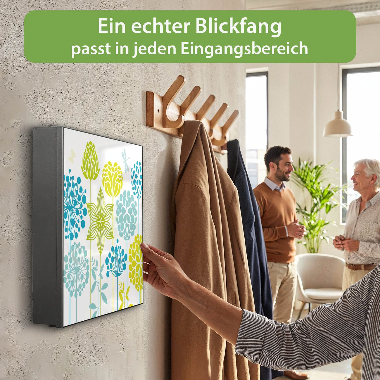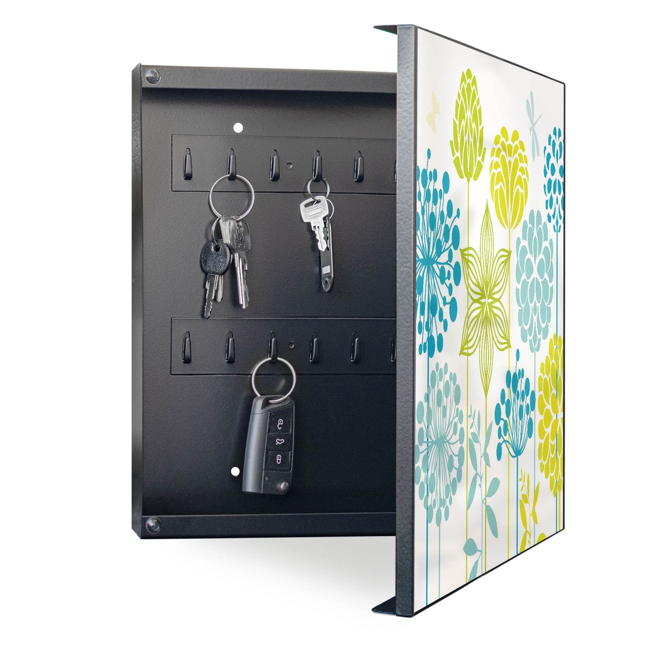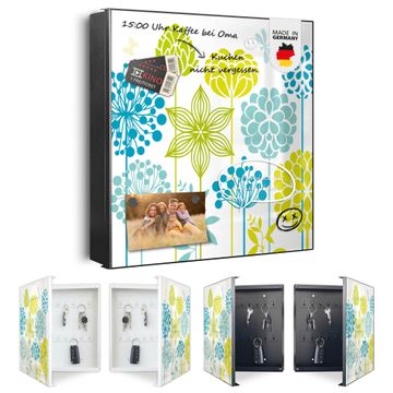 Bringe Ordnung und Eleganz in deinen Eingangsbereich mit dem banjado Schlüsselkasten Motiv Motiv Kräuterwiese. Die moderne Schlüsselbox kombiniert funktionales Design mit hochwertiger Verarbeitung und wird so zu einem echten Hingucker in Flur, Büro oder Ferienwohnung. ✅ Stilvolle Schlüsselaufbewahrung mit Motiv Motiv Kräuterwiese Der Design-Schlüsselkasten Motiv Motiv Kräuterwiese bietet Platz für bis zu 32 Schlüssel, die auf 4 stabilen Reihen mit je 8 Haken übersichtlich verstaut werden. Mit seinen kompakten Maßen von 30 x 30 x 5 cm passt die Schlüsselbox perfekt auch in kleinere Räume. Der schwarz lackierte Stahlkorpus mit rechts angeschlagenem Türscharnier harmoniert mit gedruckten Folie auf der Front und fügt sich nahtlos in jedes Wohnambiente ein. Ob als Schlüsselorganizer für Zuhause oder als praktische Lösung für Büros, Praxen und Gewerbe, der banjado Schlüsselkasten sorgt für Ordnung und Übersicht. Dank der magnetischen, mit Kreidestiften beschreibbaren Folie auf der Front kannst du Notizen anheften oder Termine direkt auf der Oberfläche festhalten. Die Schlüsselbox Motiv Motiv Kräuterwiese zur Wandmontage wird inklusive Befestigungsmaterial geliefert und ist schnell angebracht. So hast du deine Schlüssel jederzeit griffbereit und zugleich stilvoll verstaut. Mit diesem banjado Schlüsselkasten Motiv Motiv Kräuterwiese kombinierst du praktische Aufbewahrung mit stilvollem Wohndesign. Ob privat oder geschäftlich, die Schlüsselbox sorgt für mehr Ordnung, Übersicht und ein wohnliches Ambiente.Vorteile im Überblick