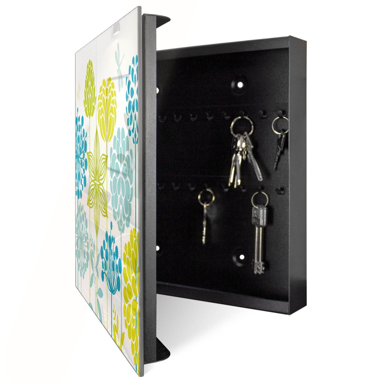 Bringe Ordnung und Eleganz in deinen Eingangsbereich mit dem banjado Schlüsselkasten Motiv Motiv Kräuterwiese. Die moderne Schlüsselbox kombiniert funktionales Design mit hochwertiger Verarbeitung und wird so zu einem echten Hingucker in Flur, Büro oder Ferienwohnung. ✅ Stilvolle Schlüsselaufbewahrung mit Glasfront im Motiv Motiv Kräuterwiese Der Design-Schlüsselkasten Motiv Motiv Kräuterwiese bietet Platz für bis zu 50 Schlüssel, die auf 5 stabilen Reihen mit je 10 Haken übersichtlich verstaut werden. Mit seinen kompakten Maßen von 30 x 30 x 5 cm passt die Schlüsselbox perfekt auch in kleinere Räume. Der schwarz lackierte Stahlkorpus mit rechts angeschlagenem Türscharnier harmoniert mit der Glasfront und fügt sich nahtlos in jedes Wohnambiente ein. Ob als Schlüsselorganizer für Zuhause oder als praktische Lösung für Büros, Praxen und Gewerbe, der banjado Schlüsselkasten sorgt für Ordnung und Übersicht. Dank der magnetischen, mit Kreidestiften beschreibbaren Glasfront kannst du Notizen anheften oder Termine direkt auf der Oberfläche festhalten. Die Schlüsselbox Motiv Motiv Kräuterwiese zur Wandmontage wird inklusive Befestigungsmaterial geliefert und ist schnell angebracht. So hast du deine Schlüssel jederzeit griffbereit und zugleich stilvoll verstaut. Mit diesem banjado Schlüsselkasten Motiv Motiv Kräuterwiese kombinierst du praktische Aufbewahrung mit stilvollem Wohndesign. Ob privat oder geschäftlich, die Schlüsselbox sorgt für mehr Ordnung, Übersicht und ein wohnliches Ambiente.Vorteile im Überblick