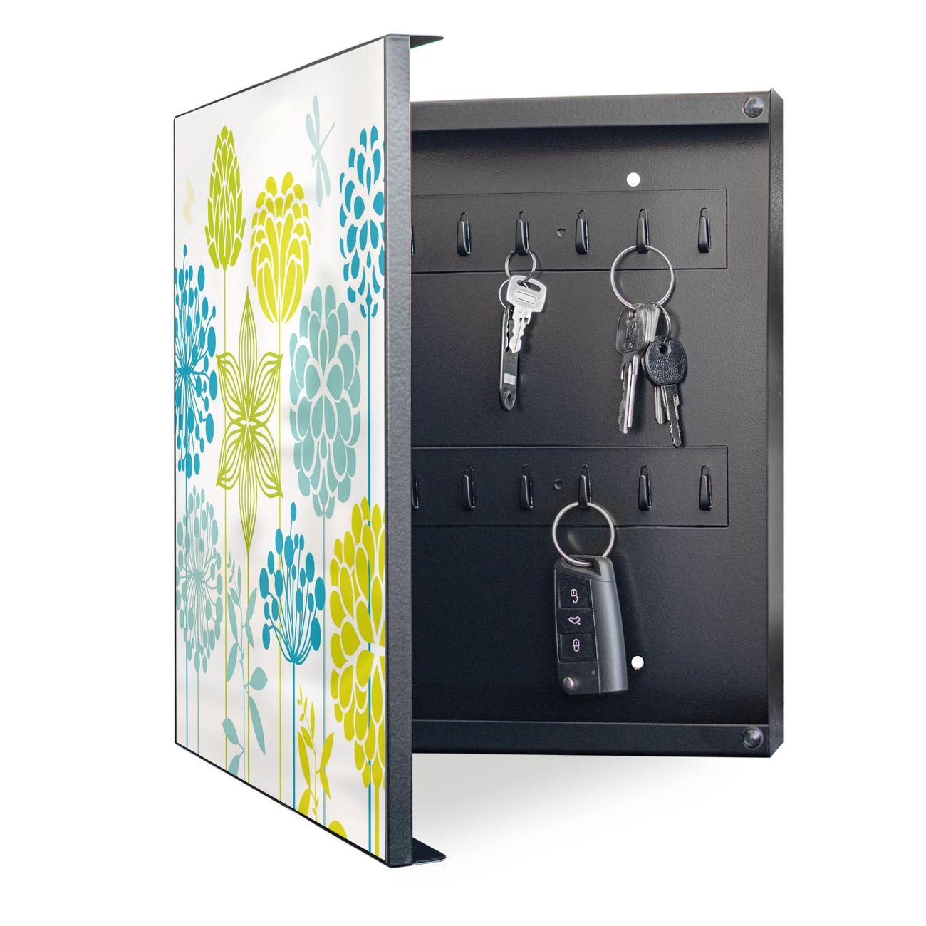 Bringe Ordnung und Eleganz in deinen Eingangsbereich mit dem banjado Schlüsselkasten Motiv Motiv Kräuterwiese. Die moderne Schlüsselbox kombiniert funktionales Design mit hochwertiger Verarbeitung und wird so zu einem echten Hingucker in Flur, Büro oder Ferienwohnung. ✅ Stilvolle Schlüsselaufbewahrung mit Motiv Motiv Kräuterwiese Der Design-Schlüsselkasten Motiv Motiv Kräuterwiese bietet Platz für bis zu 32 Schlüssel, die auf 4 stabilen Reihen mit je 8 Haken übersichtlich verstaut werden. Mit seinen kompakten Maßen von 30 x 30 x 5 cm passt die Schlüsselbox perfekt auch in kleinere Räume. Der schwarz lackierte Stahlkorpus mit links angeschlagenem Türscharnier harmoniert mit gedruckten Folie auf der Front und fügt sich nahtlos in jedes Wohnambiente ein. Ob als Schlüsselorganizer für Zuhause oder als praktische Lösung für Büros, Praxen und Gewerbe, der banjado Schlüsselkasten sorgt für Ordnung und Übersicht. Dank der magnetischen, mit Kreidestiften beschreibbaren Folie auf der Front kannst du Notizen anheften oder Termine direkt auf der Oberfläche festhalten. Die Schlüsselbox Motiv Motiv Kräuterwiese zur Wandmontage wird inklusive Befestigungsmaterial geliefert und ist schnell angebracht. So hast du deine Schlüssel jederzeit griffbereit und zugleich stilvoll verstaut. Mit diesem banjado Schlüsselkasten Motiv Motiv Kräuterwiese kombinierst du praktische Aufbewahrung mit stilvollem Wohndesign. Ob privat oder geschäftlich, die Schlüsselbox sorgt für mehr Ordnung, Übersicht und ein wohnliches Ambiente.Vorteile im Überblick