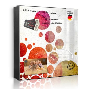 Bringe Ordnung und Eleganz in deinen Eingangsbereich mit dem banjado Schlüsselkasten Motiv Motiv Kreise. Die moderne Schlüsselbox kombiniert funktionales Design mit hochwertiger Verarbeitung und wird so zu einem echten Hingucker in Flur, Büro oder Ferienwohnung. ✅ Stilvolle Schlüsselaufbewahrung mit Motiv Motiv Kreise Der Design-Schlüsselkasten Motiv Motiv Kreise bietet Platz für bis zu 32 Schlüssel, die auf 4 stabilen Reihen mit je 8 Haken übersichtlich verstaut werden. Mit seinen kompakten Maßen von 30 x 30 x 5 cm passt die Schlüsselbox perfekt auch in kleinere Räume. Der schwarz lackierte Stahlkorpus mit links angeschlagenem Türscharnier harmoniert mit gedruckten Folie auf der Front und fügt sich nahtlos in jedes Wohnambiente ein. Ob als Schlüsselorganizer für Zuhause oder als praktische Lösung für Büros, Praxen und Gewerbe, der banjado Schlüsselkasten sorgt für Ordnung und Übersicht. Dank der magnetischen, mit Kreidestiften beschreibbaren Folie auf der Front kannst du Notizen anheften oder Termine direkt auf der Oberfläche festhalten. Die Schlüsselbox Motiv Motiv Kreise zur Wandmontage wird inklusive Befestigungsmaterial geliefert und ist schnell angebracht. So hast du deine Schlüssel jederzeit griffbereit und zugleich stilvoll verstaut. Mit diesem banjado Schlüsselkasten Motiv Motiv Kreise kombinierst du praktische Aufbewahrung mit stilvollem Wohndesign. Ob privat oder geschäftlich, die Schlüsselbox sorgt für mehr Ordnung, Übersicht und ein wohnliches Ambiente.Vorteile im Überblick