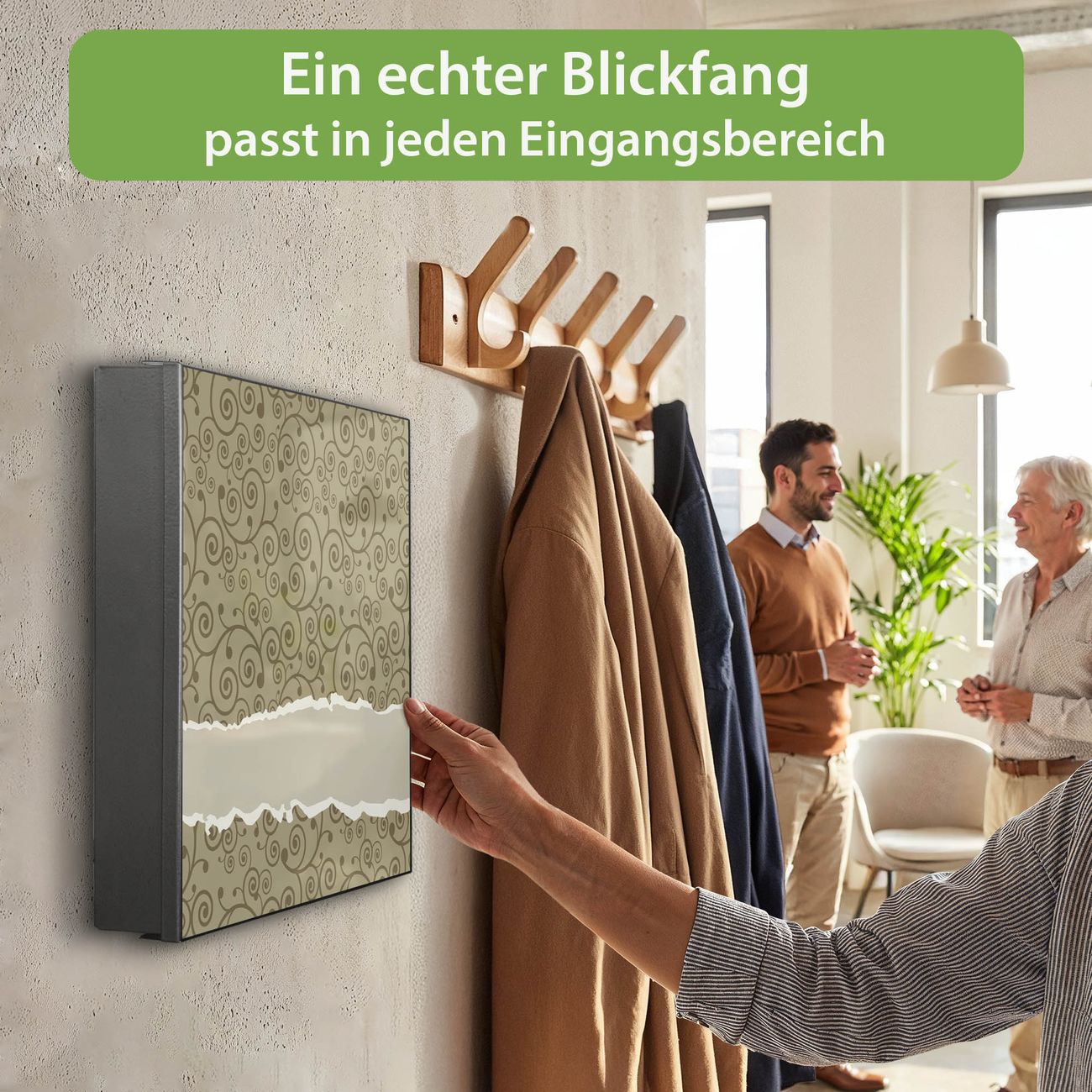 Bringe Ordnung und Eleganz in deinen Eingangsbereich mit dem banjado Schlüsselkasten Motiv Motiv Kringel. Die moderne Schlüsselbox kombiniert funktionales Design mit hochwertiger Verarbeitung und wird so zu einem echten Hingucker in Flur, Büro oder Ferienwohnung. ✅ Stilvolle Schlüsselaufbewahrung mit Motiv Motiv Kringel Der Design-Schlüsselkasten Motiv Motiv Kringel bietet Platz für bis zu 32 Schlüssel, die auf 4 stabilen Reihen mit je 8 Haken übersichtlich verstaut werden. Mit seinen kompakten Maßen von 30 x 30 x 5 cm passt die Schlüsselbox perfekt auch in kleinere Räume. Der schwarz lackierte Stahlkorpus mit links angeschlagenem Türscharnier harmoniert mit gedruckten Folie auf der Front und fügt sich nahtlos in jedes Wohnambiente ein. Ob als Schlüsselorganizer für Zuhause oder als praktische Lösung für Büros, Praxen und Gewerbe, der banjado Schlüsselkasten sorgt für Ordnung und Übersicht. Dank der magnetischen, mit Kreidestiften beschreibbaren Folie auf der Front kannst du Notizen anheften oder Termine direkt auf der Oberfläche festhalten. Die Schlüsselbox Motiv Motiv Kringel zur Wandmontage wird inklusive Befestigungsmaterial geliefert und ist schnell angebracht. So hast du deine Schlüssel jederzeit griffbereit und zugleich stilvoll verstaut. Mit diesem banjado Schlüsselkasten Motiv Motiv Kringel kombinierst du praktische Aufbewahrung mit stilvollem Wohndesign. Ob privat oder geschäftlich, die Schlüsselbox sorgt für mehr Ordnung, Übersicht und ein wohnliches Ambiente.Vorteile im Überblick