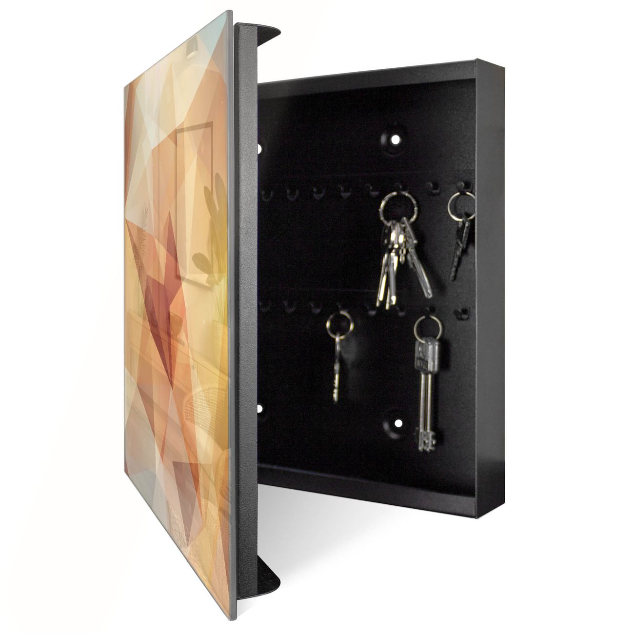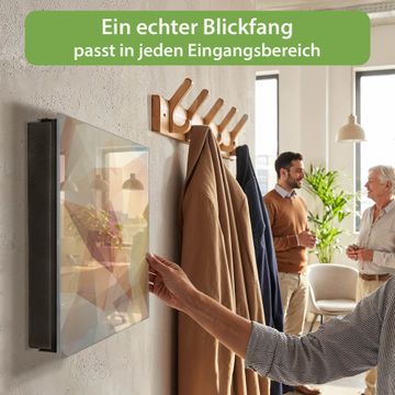 Bringe Ordnung und Eleganz in deinen Eingangsbereich mit dem banjado Schlüsselkasten Motiv Motiv Kristall. Die moderne Schlüsselbox kombiniert funktionales Design mit hochwertiger Verarbeitung und wird so zu einem echten Hingucker in Flur, Büro oder Ferienwohnung. ✅ Stilvolle Schlüsselaufbewahrung mit Glasfront im Motiv Motiv Kristall Der Design-Schlüsselkasten Motiv Motiv Kristall bietet Platz für bis zu 50 Schlüssel, die auf 5 stabilen Reihen mit je 10 Haken übersichtlich verstaut werden. Mit seinen kompakten Maßen von 30 x 30 x 5 cm passt die Schlüsselbox perfekt auch in kleinere Räume. Der schwarz lackierte Stahlkorpus mit rechts angeschlagenem Türscharnier harmoniert mit der Glasfront und fügt sich nahtlos in jedes Wohnambiente ein. Ob als Schlüsselorganizer für Zuhause oder als praktische Lösung für Büros, Praxen und Gewerbe, der banjado Schlüsselkasten sorgt für Ordnung und Übersicht. Dank der magnetischen, mit Kreidestiften beschreibbaren Glasfront kannst du Notizen anheften oder Termine direkt auf der Oberfläche festhalten. Die Schlüsselbox Motiv Motiv Kristall zur Wandmontage wird inklusive Befestigungsmaterial geliefert und ist schnell angebracht. So hast du deine Schlüssel jederzeit griffbereit und zugleich stilvoll verstaut. Mit diesem banjado Schlüsselkasten Motiv Motiv Kristall kombinierst du praktische Aufbewahrung mit stilvollem Wohndesign. Ob privat oder geschäftlich, die Schlüsselbox sorgt für mehr Ordnung, Übersicht und ein wohnliches Ambiente.Vorteile im Überblick