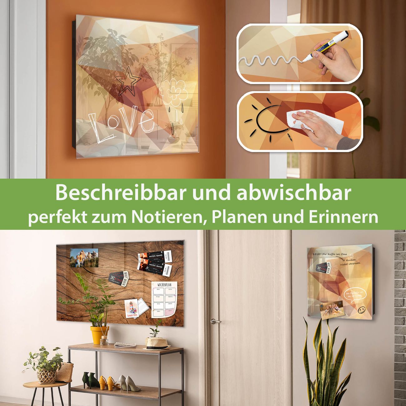 ✅ Magnetisch und mit Kreidestift beschreibbar, gehärtetes Glas, links angeschlagene TürOrdnung und Design in einem