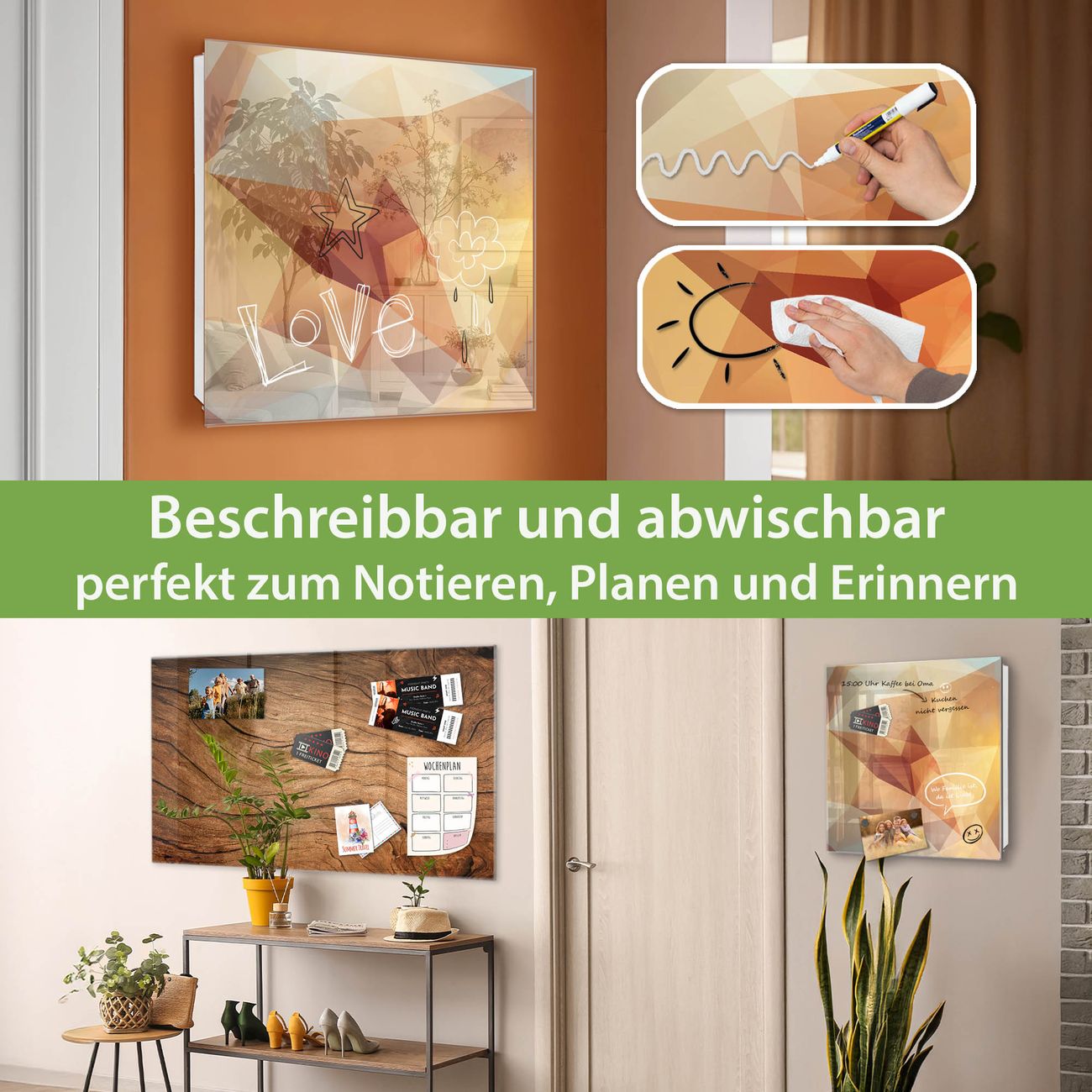 ✅ Magnetisch und mit Kreidestift beschreibbar, gehärtetes Glas, links angeschlagene TürOrdnung und Design in einem