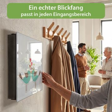 Bringe Ordnung und Eleganz in deinen Eingangsbereich mit dem banjado Schlüsselkasten Motiv Motiv Küsschen. Die moderne Schlüsselbox kombiniert funktionales Design mit hochwertiger Verarbeitung und wird so zu einem echten Hingucker in Flur, Büro oder Ferienwohnung. ✅ Stilvolle Schlüsselaufbewahrung mit Glasfront im Motiv Motiv Küsschen Der Design-Schlüsselkasten Motiv Motiv Küsschen bietet Platz für bis zu 50 Schlüssel, die auf 5 stabilen Reihen mit je 10 Haken übersichtlich verstaut werden. Mit seinen kompakten Maßen von 30 x 30 x 5 cm passt die Schlüsselbox perfekt auch in kleinere Räume. Der schwarz lackierte Stahlkorpus mit rechts angeschlagenem Türscharnier harmoniert mit der Glasfront und fügt sich nahtlos in jedes Wohnambiente ein. Ob als Schlüsselorganizer für Zuhause oder als praktische Lösung für Büros, Praxen und Gewerbe, der banjado Schlüsselkasten sorgt für Ordnung und Übersicht. Dank der magnetischen, mit Kreidestiften beschreibbaren Glasfront kannst du Notizen anheften oder Termine direkt auf der Oberfläche festhalten. Die Schlüsselbox Motiv Motiv Küsschen zur Wandmontage wird inklusive Befestigungsmaterial geliefert und ist schnell angebracht. So hast du deine Schlüssel jederzeit griffbereit und zugleich stilvoll verstaut. Mit diesem banjado Schlüsselkasten Motiv Motiv Küsschen kombinierst du praktische Aufbewahrung mit stilvollem Wohndesign. Ob privat oder geschäftlich, die Schlüsselbox sorgt für mehr Ordnung, Übersicht und ein wohnliches Ambiente.Vorteile im Überblick