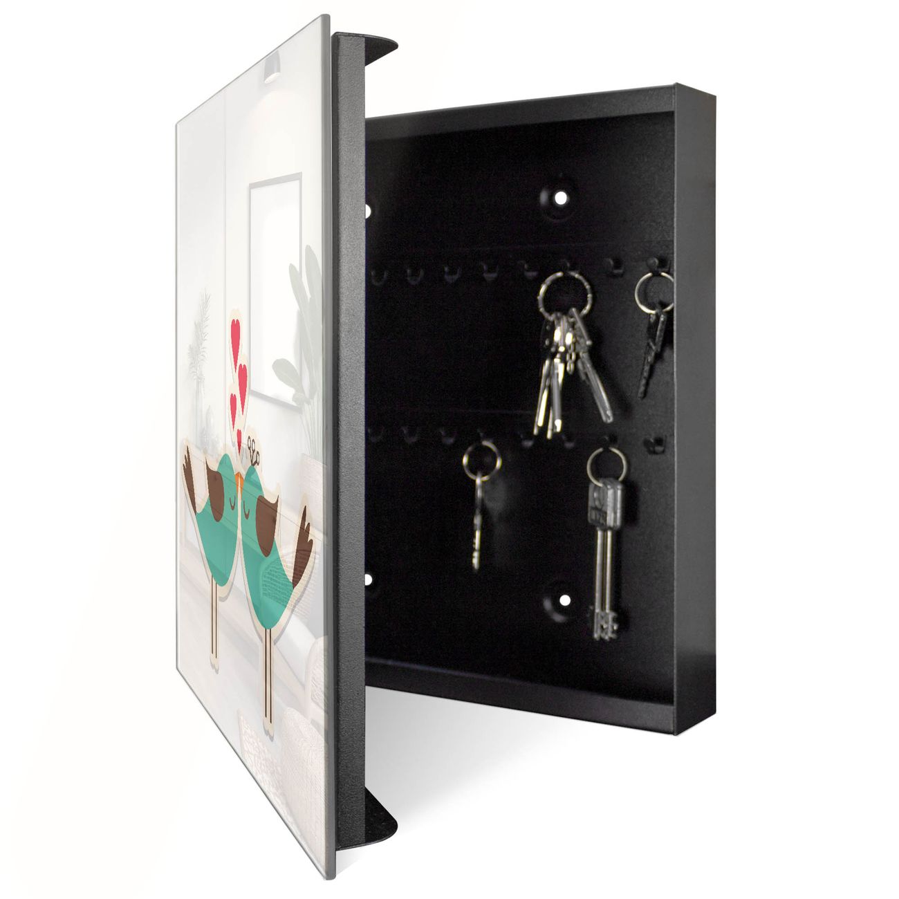 Bringe Ordnung und Eleganz in deinen Eingangsbereich mit dem banjado Schlüsselkasten Motiv Motiv Küsschen. Die moderne Schlüsselbox kombiniert funktionales Design mit hochwertiger Verarbeitung und wird so zu einem echten Hingucker in Flur, Büro oder Ferienwohnung. ✅ Stilvolle Schlüsselaufbewahrung mit Glasfront im Motiv Motiv Küsschen Der Design-Schlüsselkasten Motiv Motiv Küsschen bietet Platz für bis zu 50 Schlüssel, die auf 5 stabilen Reihen mit je 10 Haken übersichtlich verstaut werden. Mit seinen kompakten Maßen von 30 x 30 x 5 cm passt die Schlüsselbox perfekt auch in kleinere Räume. Der schwarz lackierte Stahlkorpus mit rechts angeschlagenem Türscharnier harmoniert mit der Glasfront und fügt sich nahtlos in jedes Wohnambiente ein. Ob als Schlüsselorganizer für Zuhause oder als praktische Lösung für Büros, Praxen und Gewerbe, der banjado Schlüsselkasten sorgt für Ordnung und Übersicht. Dank der magnetischen, mit Kreidestiften beschreibbaren Glasfront kannst du Notizen anheften oder Termine direkt auf der Oberfläche festhalten. Die Schlüsselbox Motiv Motiv Küsschen zur Wandmontage wird inklusive Befestigungsmaterial geliefert und ist schnell angebracht. So hast du deine Schlüssel jederzeit griffbereit und zugleich stilvoll verstaut. Mit diesem banjado Schlüsselkasten Motiv Motiv Küsschen kombinierst du praktische Aufbewahrung mit stilvollem Wohndesign. Ob privat oder geschäftlich, die Schlüsselbox sorgt für mehr Ordnung, Übersicht und ein wohnliches Ambiente.Vorteile im Überblick