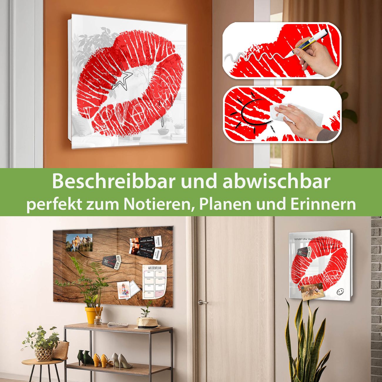 Bringe Ordnung und Eleganz in deinen Eingangsbereich mit dem banjado Schlüsselkasten Motiv Motiv Kussmund. Die moderne Schlüsselbox kombiniert funktionales Design mit hochwertiger Verarbeitung und wird so zu einem echten Hingucker in Flur, Büro oder Ferienwohnung. ✅ Stilvolle Schlüsselaufbewahrung mit Glasfront im Motiv Motiv Kussmund Der Design-Schlüsselkasten Motiv Motiv Kussmund bietet Platz für bis zu 50 Schlüssel, die auf 5 stabilen Reihen mit je 10 Haken übersichtlich verstaut werden. Mit seinen kompakten Maßen von 30 x 30 x 5 cm passt die Schlüsselbox perfekt auch in kleinere Räume. Der weiß lackierte Stahlkorpus mit rechts angeschlagenem Türscharnier harmoniert mit der Glasfront und fügt sich nahtlos in jedes Wohnambiente ein. Ob als Schlüsselorganizer für Zuhause oder als praktische Lösung für Büros, Praxen und Gewerbe, der banjado Schlüsselkasten sorgt für Ordnung und Übersicht. Dank der magnetischen, mit Kreidestiften beschreibbaren Glasfront kannst du Notizen anheften oder Termine direkt auf der Oberfläche festhalten. Die Schlüsselbox Motiv Motiv Kussmund zur Wandmontage wird inklusive Befestigungsmaterial geliefert und ist schnell angebracht. So hast du deine Schlüssel jederzeit griffbereit und zugleich stilvoll verstaut. Mit diesem banjado Schlüsselkasten Motiv Motiv Kussmund kombinierst du praktische Aufbewahrung mit stilvollem Wohndesign. Ob privat oder geschäftlich, die Schlüsselbox sorgt für mehr Ordnung, Übersicht und ein wohnliches Ambiente.Vorteile im Überblick