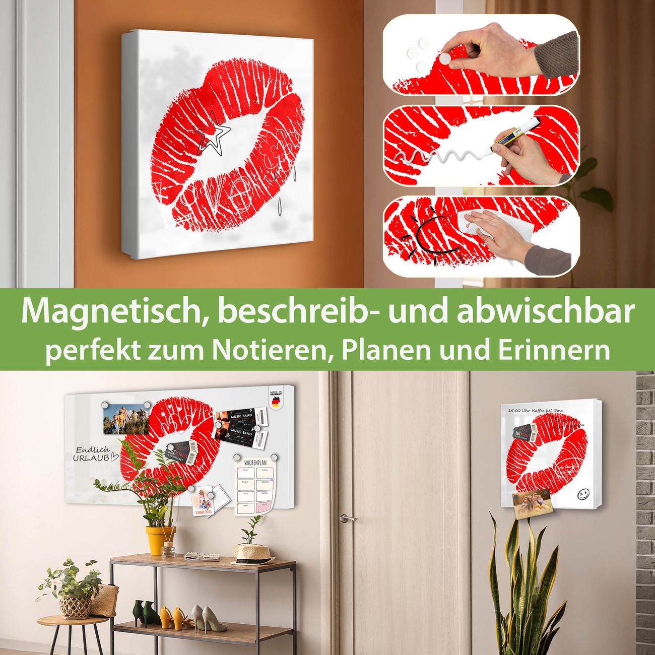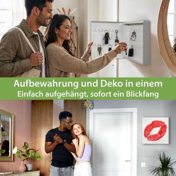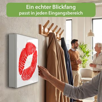 Bringe Ordnung und Eleganz in deinen Eingangsbereich mit dem banjado Schlüsselkasten Motiv Motiv Kussmund. Die moderne Schlüsselbox kombiniert funktionales Design mit hochwertiger Verarbeitung und wird so zu einem echten Hingucker in Flur, Büro oder Ferienwohnung. ✅ Stilvolle Schlüsselaufbewahrung mit Motiv Motiv Kussmund Der Design-Schlüsselkasten Motiv Motiv Kussmund bietet Platz für bis zu 32 Schlüssel, die auf 4 stabilen Reihen mit je 8 Haken übersichtlich verstaut werden. Mit seinen kompakten Maßen von 30 x 30 x 5 cm passt die Schlüsselbox perfekt auch in kleinere Räume. Der weiß lackierte Stahlkorpus mit rechts angeschlagenem Türscharnier harmoniert mit gedruckten Folie auf der Front und fügt sich nahtlos in jedes Wohnambiente ein. Ob als Schlüsselorganizer für Zuhause oder als praktische Lösung für Büros, Praxen und Gewerbe, der banjado Schlüsselkasten sorgt für Ordnung und Übersicht. Dank der magnetischen, mit Kreidestiften beschreibbaren Folie auf der Front kannst du Notizen anheften oder Termine direkt auf der Oberfläche festhalten. Die Schlüsselbox Motiv Motiv Kussmund zur Wandmontage wird inklusive Befestigungsmaterial geliefert und ist schnell angebracht. So hast du deine Schlüssel jederzeit griffbereit und zugleich stilvoll verstaut. Mit diesem banjado Schlüsselkasten Motiv Motiv Kussmund kombinierst du praktische Aufbewahrung mit stilvollem Wohndesign. Ob privat oder geschäftlich, die Schlüsselbox sorgt für mehr Ordnung, Übersicht und ein wohnliches Ambiente.Vorteile im Überblick