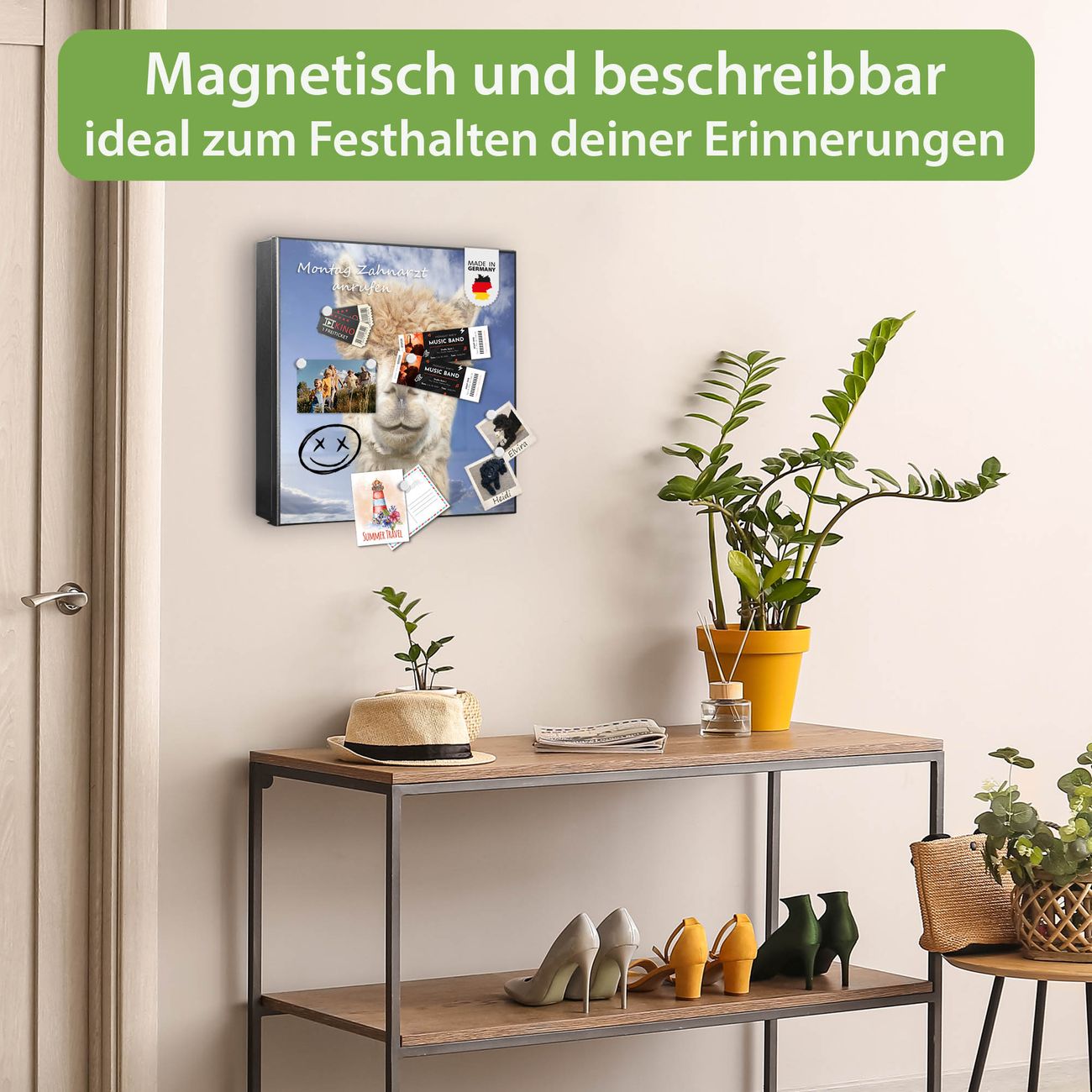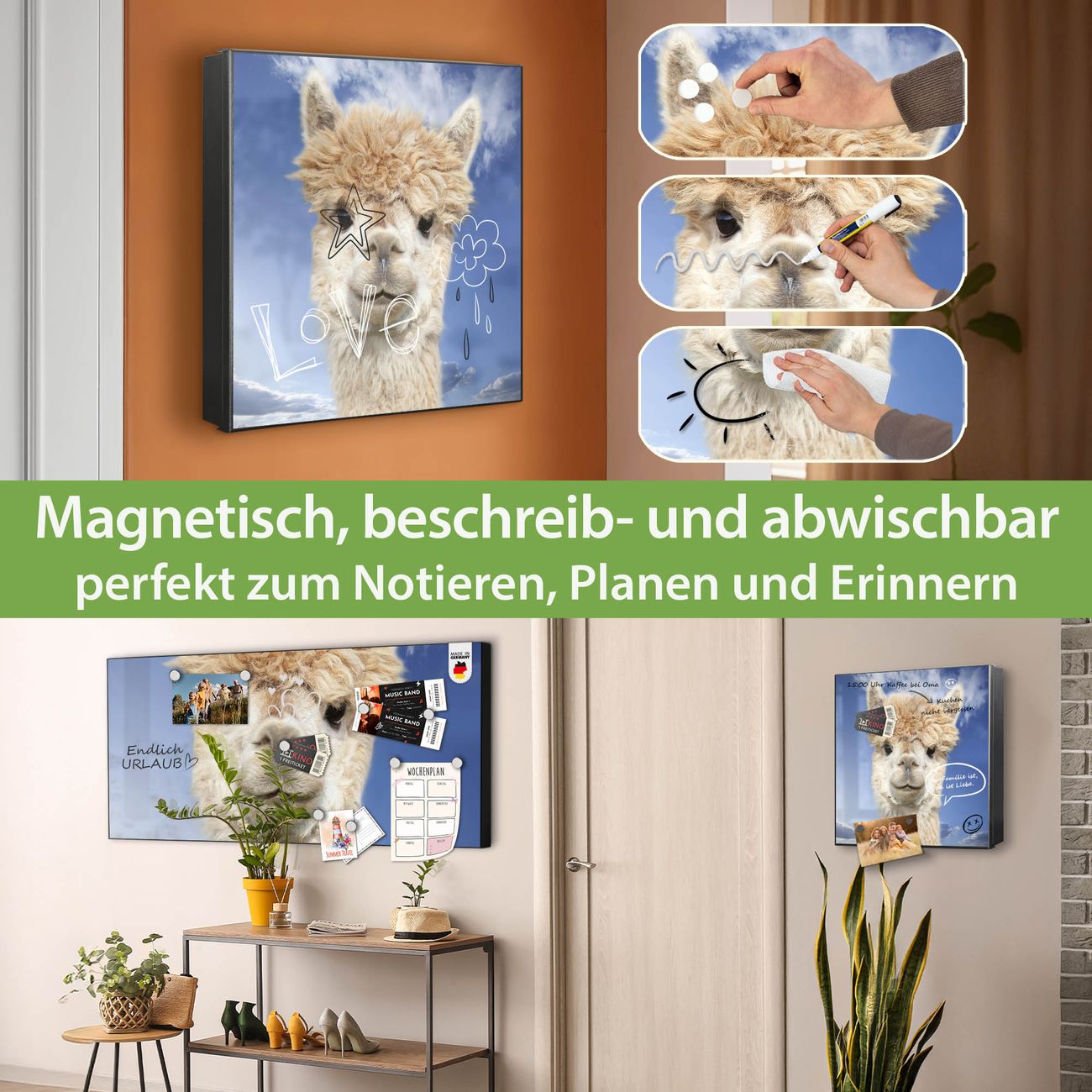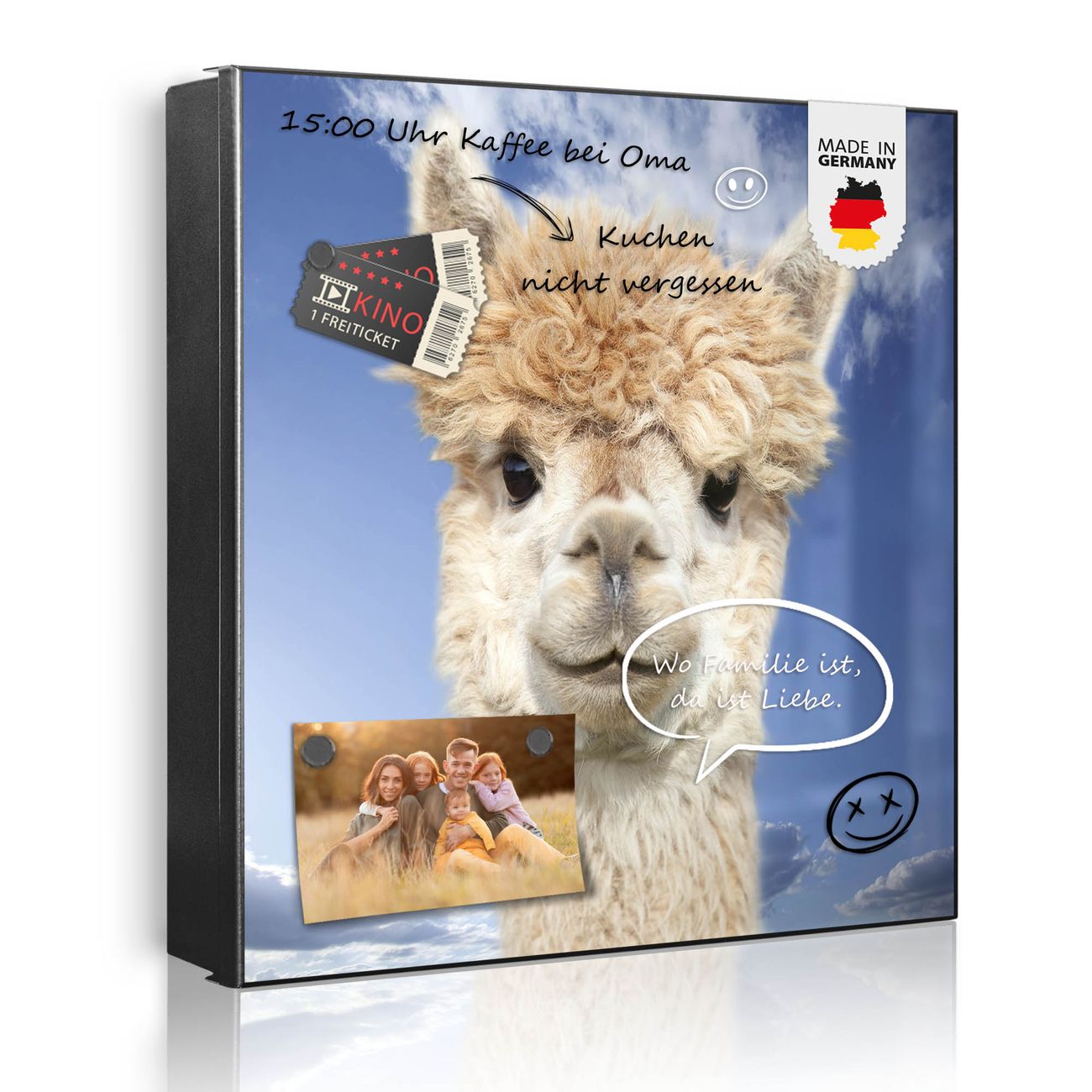 Bringe Ordnung und Eleganz in deinen Eingangsbereich mit dem banjado Schlüsselkasten Motiv Motiv Lama. Die moderne Schlüsselbox kombiniert funktionales Design mit hochwertiger Verarbeitung und wird so zu einem echten Hingucker in Flur, Büro oder Ferienwohnung. ✅ Stilvolle Schlüsselaufbewahrung mit Motiv Motiv Lama Der Design-Schlüsselkasten Motiv Motiv Lama bietet Platz für bis zu 32 Schlüssel, die auf 4 stabilen Reihen mit je 8 Haken übersichtlich verstaut werden. Mit seinen kompakten Maßen von 30 x 30 x 5 cm passt die Schlüsselbox perfekt auch in kleinere Räume. Der schwarz lackierte Stahlkorpus mit rechts angeschlagenem Türscharnier harmoniert mit gedruckten Folie auf der Front und fügt sich nahtlos in jedes Wohnambiente ein. Ob als Schlüsselorganizer für Zuhause oder als praktische Lösung für Büros, Praxen und Gewerbe, der banjado Schlüsselkasten sorgt für Ordnung und Übersicht. Dank der magnetischen, mit Kreidestiften beschreibbaren Folie auf der Front kannst du Notizen anheften oder Termine direkt auf der Oberfläche festhalten. Die Schlüsselbox Motiv Motiv Lama zur Wandmontage wird inklusive Befestigungsmaterial geliefert und ist schnell angebracht. So hast du deine Schlüssel jederzeit griffbereit und zugleich stilvoll verstaut. Mit diesem banjado Schlüsselkasten Motiv Motiv Lama kombinierst du praktische Aufbewahrung mit stilvollem Wohndesign. Ob privat oder geschäftlich, die Schlüsselbox sorgt für mehr Ordnung, Übersicht und ein wohnliches Ambiente.Vorteile im Überblick