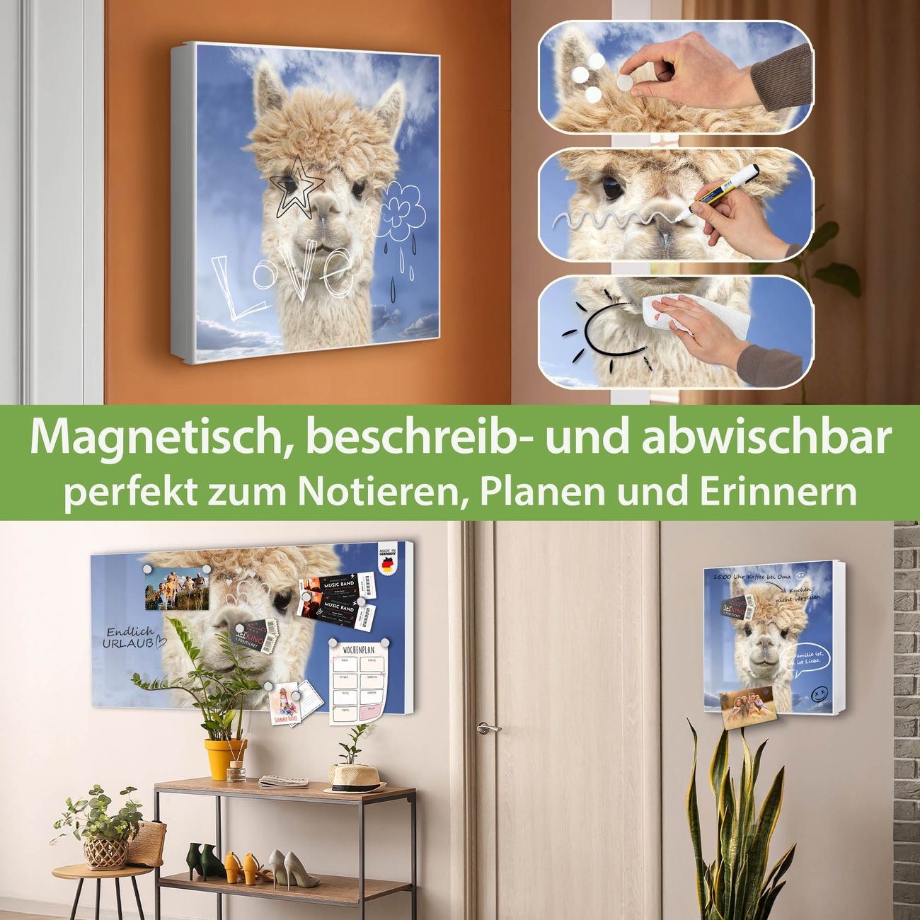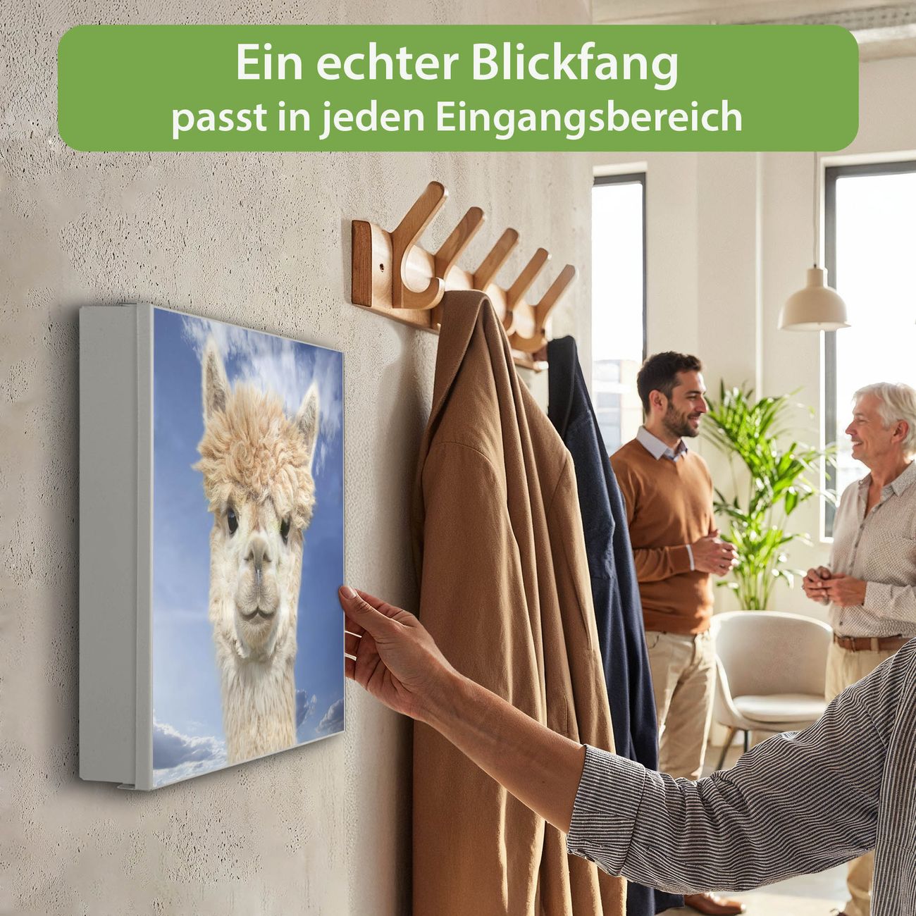 Bringe Ordnung und Eleganz in deinen Eingangsbereich mit dem banjado Schlüsselkasten Motiv Motiv Lama. Die moderne Schlüsselbox kombiniert funktionales Design mit hochwertiger Verarbeitung und wird so zu einem echten Hingucker in Flur, Büro oder Ferienwohnung. ✅ Stilvolle Schlüsselaufbewahrung mit Motiv Motiv Lama Der Design-Schlüsselkasten Motiv Motiv Lama bietet Platz für bis zu 32 Schlüssel, die auf 4 stabilen Reihen mit je 8 Haken übersichtlich verstaut werden. Mit seinen kompakten Maßen von 30 x 30 x 5 cm passt die Schlüsselbox perfekt auch in kleinere Räume. Der weiß lackierte Stahlkorpus mit links angeschlagenem Türscharnier harmoniert mit gedruckten Folie auf der Front und fügt sich nahtlos in jedes Wohnambiente ein. Ob als Schlüsselorganizer für Zuhause oder als praktische Lösung für Büros, Praxen und Gewerbe, der banjado Schlüsselkasten sorgt für Ordnung und Übersicht. Dank der magnetischen, mit Kreidestiften beschreibbaren Folie auf der Front kannst du Notizen anheften oder Termine direkt auf der Oberfläche festhalten. Die Schlüsselbox Motiv Motiv Lama zur Wandmontage wird inklusive Befestigungsmaterial geliefert und ist schnell angebracht. So hast du deine Schlüssel jederzeit griffbereit und zugleich stilvoll verstaut. Mit diesem banjado Schlüsselkasten Motiv Motiv Lama kombinierst du praktische Aufbewahrung mit stilvollem Wohndesign. Ob privat oder geschäftlich, die Schlüsselbox sorgt für mehr Ordnung, Übersicht und ein wohnliches Ambiente.Vorteile im Überblick