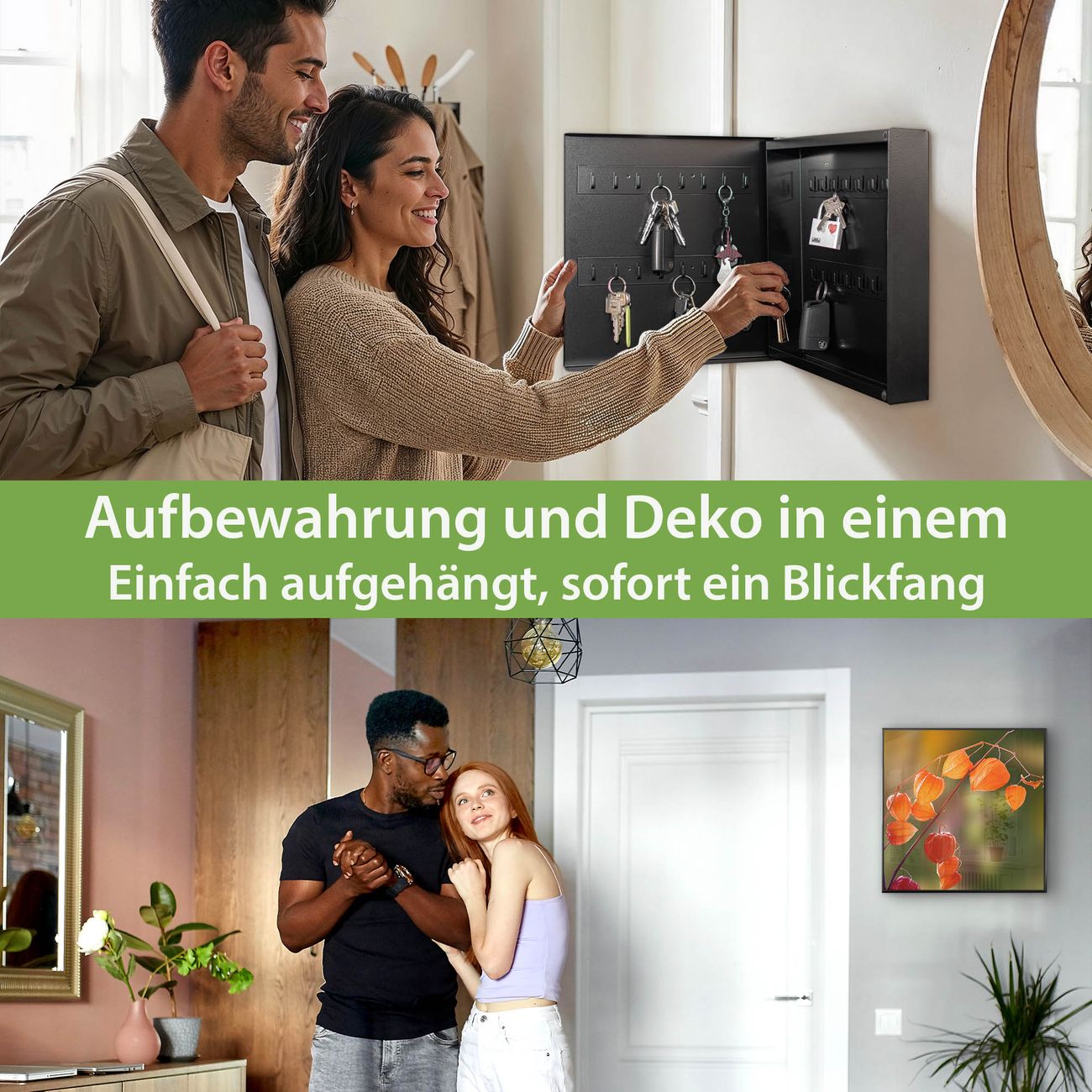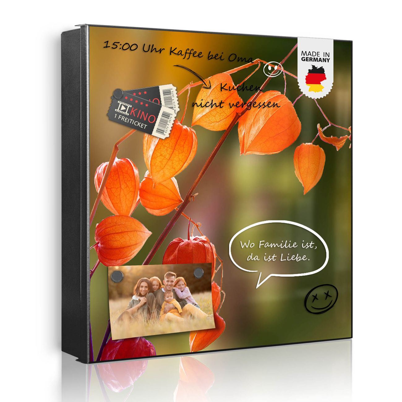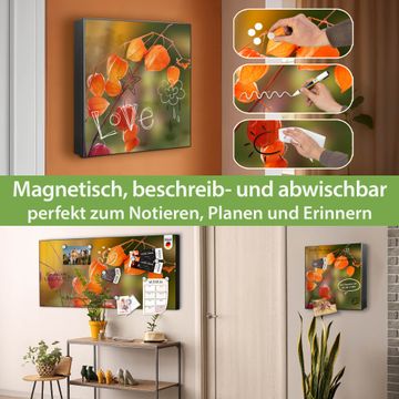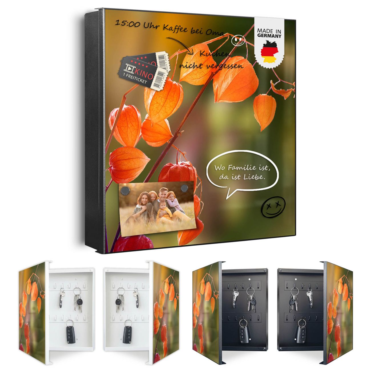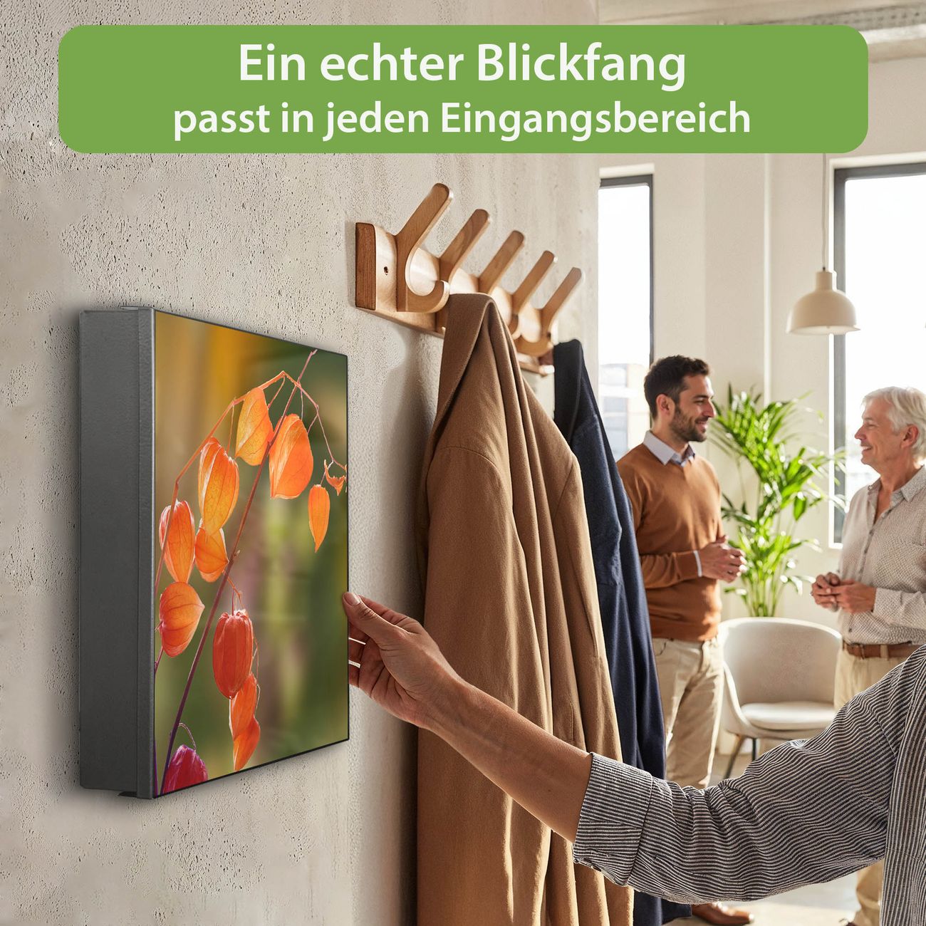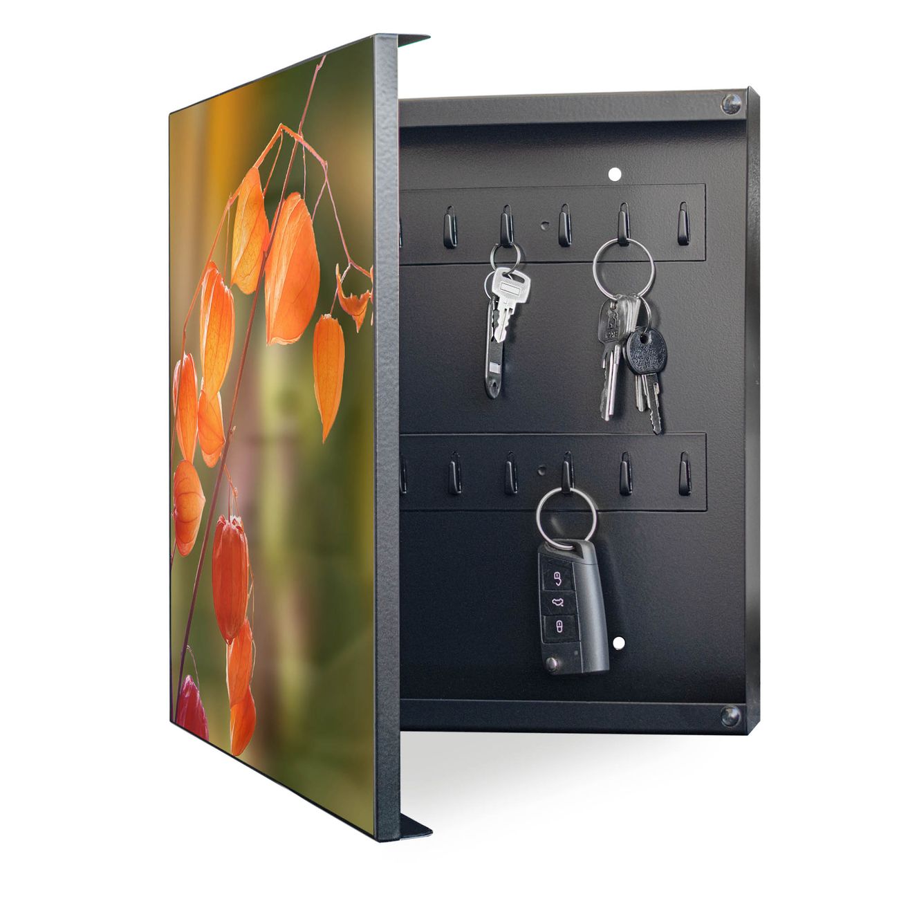 Bringe Ordnung und Eleganz in deinen Eingangsbereich mit dem banjado Schlüsselkasten Motiv Motiv Lampionblume. Die moderne Schlüsselbox kombiniert funktionales Design mit hochwertiger Verarbeitung und wird so zu einem echten Hingucker in Flur, Büro oder Ferienwohnung. ✅ Stilvolle Schlüsselaufbewahrung mit Motiv Motiv Lampionblume Der Design-Schlüsselkasten Motiv Motiv Lampionblume bietet Platz für bis zu 32 Schlüssel, die auf 4 stabilen Reihen mit je 8 Haken übersichtlich verstaut werden. Mit seinen kompakten Maßen von 30 x 30 x 5 cm passt die Schlüsselbox perfekt auch in kleinere Räume. Der schwarz lackierte Stahlkorpus mit links angeschlagenem Türscharnier harmoniert mit gedruckten Folie auf der Front und fügt sich nahtlos in jedes Wohnambiente ein. Ob als Schlüsselorganizer für Zuhause oder als praktische Lösung für Büros, Praxen und Gewerbe, der banjado Schlüsselkasten sorgt für Ordnung und Übersicht. Dank der magnetischen, mit Kreidestiften beschreibbaren Folie auf der Front kannst du Notizen anheften oder Termine direkt auf der Oberfläche festhalten. Die Schlüsselbox Motiv Motiv Lampionblume zur Wandmontage wird inklusive Befestigungsmaterial geliefert und ist schnell angebracht. So hast du deine Schlüssel jederzeit griffbereit und zugleich stilvoll verstaut. Mit diesem banjado Schlüsselkasten Motiv Motiv Lampionblume kombinierst du praktische Aufbewahrung mit stilvollem Wohndesign. Ob privat oder geschäftlich, die Schlüsselbox sorgt für mehr Ordnung, Übersicht und ein wohnliches Ambiente.Vorteile im Überblick