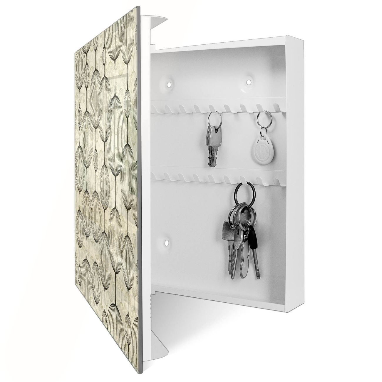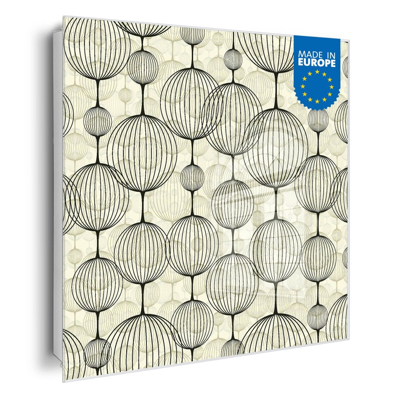 Bringe Ordnung und Eleganz in deinen Eingangsbereich mit dem banjado Schlüsselkasten Motiv Motiv Lampions. Die moderne Schlüsselbox kombiniert funktionales Design mit hochwertiger Verarbeitung und wird so zu einem echten Hingucker in Flur, Büro oder Ferienwohnung. ✅ Stilvolle Schlüsselaufbewahrung mit Glasfront im Motiv Motiv Lampions Der Design-Schlüsselkasten Motiv Motiv Lampions bietet Platz für bis zu 50 Schlüssel, die auf 5 stabilen Reihen mit je 10 Haken übersichtlich verstaut werden. Mit seinen kompakten Maßen von 30 x 30 x 5 cm passt die Schlüsselbox perfekt auch in kleinere Räume. Der weiß lackierte Stahlkorpus mit rechts angeschlagenem Türscharnier harmoniert mit der Glasfront und fügt sich nahtlos in jedes Wohnambiente ein. Ob als Schlüsselorganizer für Zuhause oder als praktische Lösung für Büros, Praxen und Gewerbe, der banjado Schlüsselkasten sorgt für Ordnung und Übersicht. Dank der magnetischen, mit Kreidestiften beschreibbaren Glasfront kannst du Notizen anheften oder Termine direkt auf der Oberfläche festhalten. Die Schlüsselbox Motiv Motiv Lampions zur Wandmontage wird inklusive Befestigungsmaterial geliefert und ist schnell angebracht. So hast du deine Schlüssel jederzeit griffbereit und zugleich stilvoll verstaut. Mit diesem banjado Schlüsselkasten Motiv Motiv Lampions kombinierst du praktische Aufbewahrung mit stilvollem Wohndesign. Ob privat oder geschäftlich, die Schlüsselbox sorgt für mehr Ordnung, Übersicht und ein wohnliches Ambiente.Vorteile im Überblick