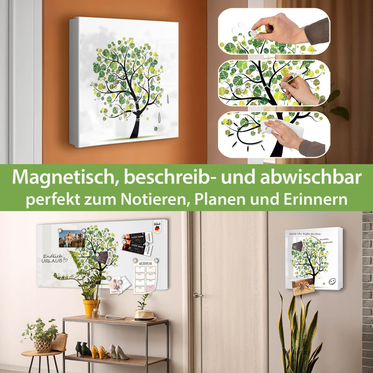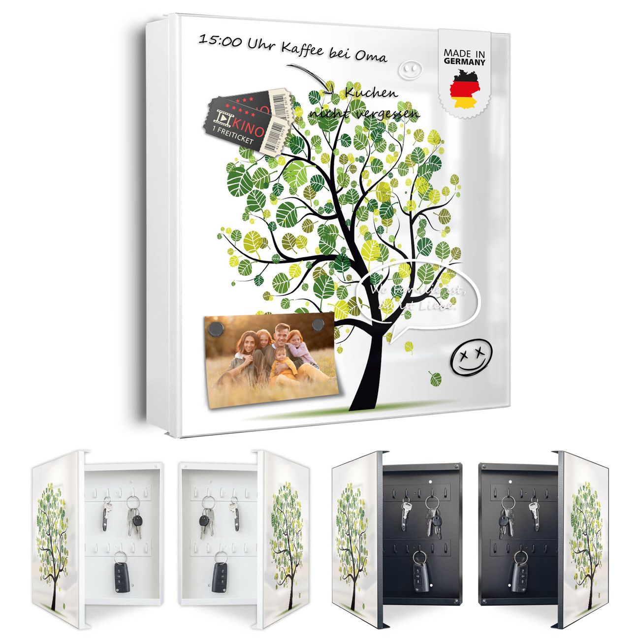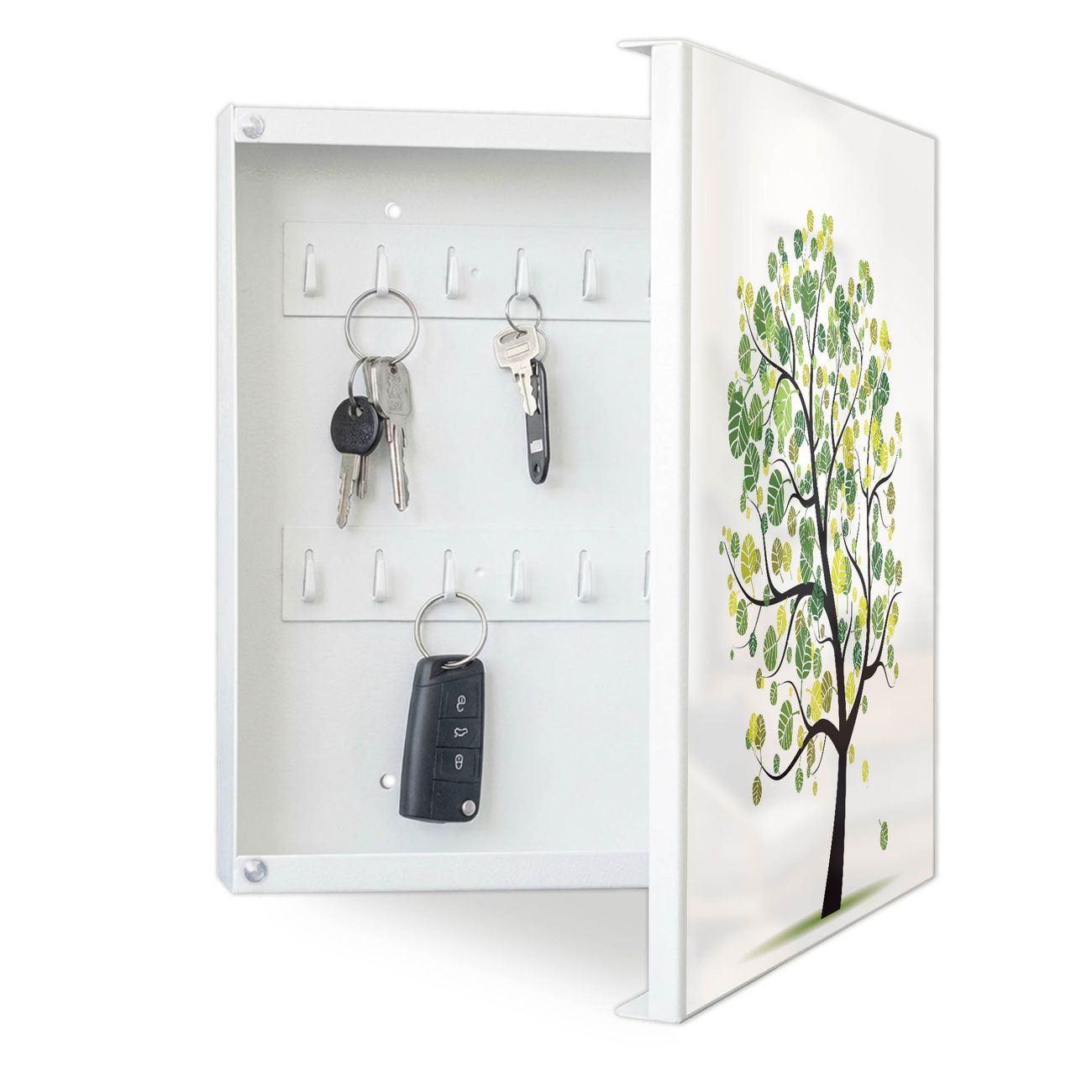 Bringe Ordnung und Eleganz in deinen Eingangsbereich mit dem banjado Schlüsselkasten Motiv Motiv Laubzauberbaum. Die moderne Schlüsselbox kombiniert funktionales Design mit hochwertiger Verarbeitung und wird so zu einem echten Hingucker in Flur, Büro oder Ferienwohnung. ✅ Stilvolle Schlüsselaufbewahrung mit Motiv Motiv Laubzauberbaum Der Design-Schlüsselkasten Motiv Motiv Laubzauberbaum bietet Platz für bis zu 32 Schlüssel, die auf 4 stabilen Reihen mit je 8 Haken übersichtlich verstaut werden. Mit seinen kompakten Maßen von 30 x 30 x 5 cm passt die Schlüsselbox perfekt auch in kleinere Räume. Der weiß lackierte Stahlkorpus mit rechts angeschlagenem Türscharnier harmoniert mit gedruckten Folie auf der Front und fügt sich nahtlos in jedes Wohnambiente ein. Ob als Schlüsselorganizer für Zuhause oder als praktische Lösung für Büros, Praxen und Gewerbe, der banjado Schlüsselkasten sorgt für Ordnung und Übersicht. Dank der magnetischen, mit Kreidestiften beschreibbaren Folie auf der Front kannst du Notizen anheften oder Termine direkt auf der Oberfläche festhalten. Die Schlüsselbox Motiv Motiv Laubzauberbaum zur Wandmontage wird inklusive Befestigungsmaterial geliefert und ist schnell angebracht. So hast du deine Schlüssel jederzeit griffbereit und zugleich stilvoll verstaut. Mit diesem banjado Schlüsselkasten Motiv Motiv Laubzauberbaum kombinierst du praktische Aufbewahrung mit stilvollem Wohndesign. Ob privat oder geschäftlich, die Schlüsselbox sorgt für mehr Ordnung, Übersicht und ein wohnliches Ambiente.Vorteile im Überblick