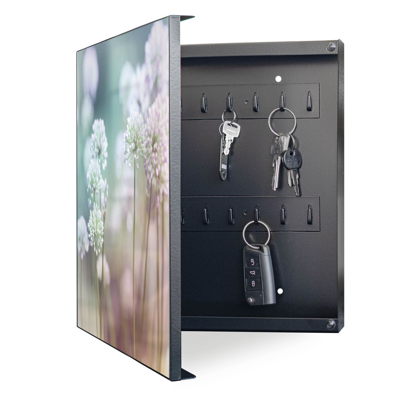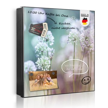 Bringe Ordnung und Eleganz in deinen Eingangsbereich mit dem banjado Schlüsselkasten Motiv Motiv Lauchblüte. Die moderne Schlüsselbox kombiniert funktionales Design mit hochwertiger Verarbeitung und wird so zu einem echten Hingucker in Flur, Büro oder Ferienwohnung. ✅ Stilvolle Schlüsselaufbewahrung mit Motiv Motiv Lauchblüte Der Design-Schlüsselkasten Motiv Motiv Lauchblüte bietet Platz für bis zu 32 Schlüssel, die auf 4 stabilen Reihen mit je 8 Haken übersichtlich verstaut werden. Mit seinen kompakten Maßen von 30 x 30 x 5 cm passt die Schlüsselbox perfekt auch in kleinere Räume. Der schwarz lackierte Stahlkorpus mit links angeschlagenem Türscharnier harmoniert mit gedruckten Folie auf der Front und fügt sich nahtlos in jedes Wohnambiente ein. Ob als Schlüsselorganizer für Zuhause oder als praktische Lösung für Büros, Praxen und Gewerbe, der banjado Schlüsselkasten sorgt für Ordnung und Übersicht. Dank der magnetischen, mit Kreidestiften beschreibbaren Folie auf der Front kannst du Notizen anheften oder Termine direkt auf der Oberfläche festhalten. Die Schlüsselbox Motiv Motiv Lauchblüte zur Wandmontage wird inklusive Befestigungsmaterial geliefert und ist schnell angebracht. So hast du deine Schlüssel jederzeit griffbereit und zugleich stilvoll verstaut. Mit diesem banjado Schlüsselkasten Motiv Motiv Lauchblüte kombinierst du praktische Aufbewahrung mit stilvollem Wohndesign. Ob privat oder geschäftlich, die Schlüsselbox sorgt für mehr Ordnung, Übersicht und ein wohnliches Ambiente.Vorteile im Überblick