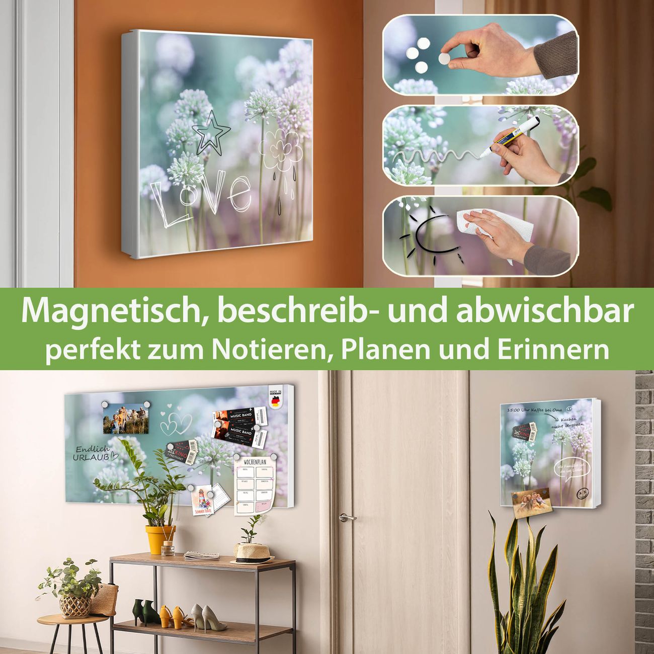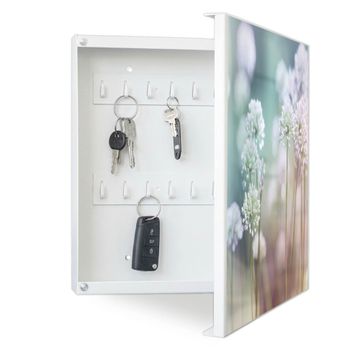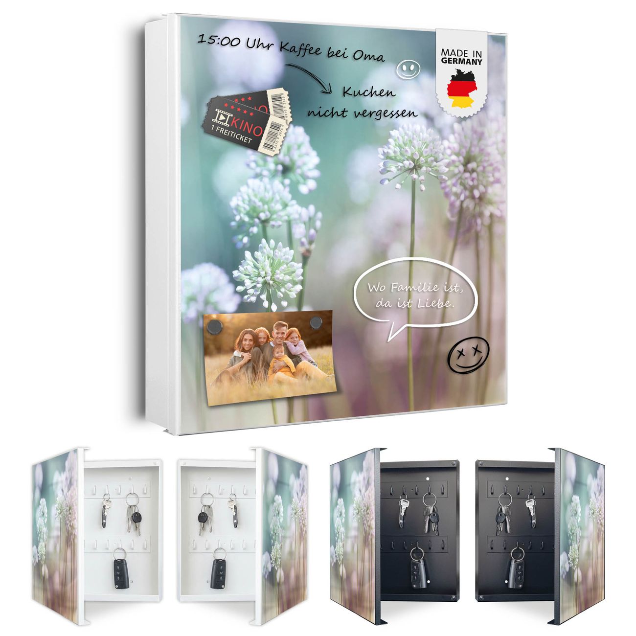 Bringe Ordnung und Eleganz in deinen Eingangsbereich mit dem banjado Schlüsselkasten Motiv Motiv Lauchblüte. Die moderne Schlüsselbox kombiniert funktionales Design mit hochwertiger Verarbeitung und wird so zu einem echten Hingucker in Flur, Büro oder Ferienwohnung. ✅ Stilvolle Schlüsselaufbewahrung mit Motiv Motiv Lauchblüte Der Design-Schlüsselkasten Motiv Motiv Lauchblüte bietet Platz für bis zu 32 Schlüssel, die auf 4 stabilen Reihen mit je 8 Haken übersichtlich verstaut werden. Mit seinen kompakten Maßen von 30 x 30 x 5 cm passt die Schlüsselbox perfekt auch in kleinere Räume. Der weiß lackierte Stahlkorpus mit rechts angeschlagenem Türscharnier harmoniert mit gedruckten Folie auf der Front und fügt sich nahtlos in jedes Wohnambiente ein. Ob als Schlüsselorganizer für Zuhause oder als praktische Lösung für Büros, Praxen und Gewerbe, der banjado Schlüsselkasten sorgt für Ordnung und Übersicht. Dank der magnetischen, mit Kreidestiften beschreibbaren Folie auf der Front kannst du Notizen anheften oder Termine direkt auf der Oberfläche festhalten. Die Schlüsselbox Motiv Motiv Lauchblüte zur Wandmontage wird inklusive Befestigungsmaterial geliefert und ist schnell angebracht. So hast du deine Schlüssel jederzeit griffbereit und zugleich stilvoll verstaut. Mit diesem banjado Schlüsselkasten Motiv Motiv Lauchblüte kombinierst du praktische Aufbewahrung mit stilvollem Wohndesign. Ob privat oder geschäftlich, die Schlüsselbox sorgt für mehr Ordnung, Übersicht und ein wohnliches Ambiente.Vorteile im Überblick