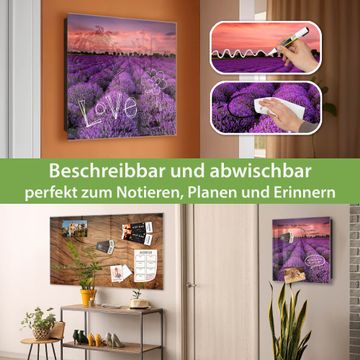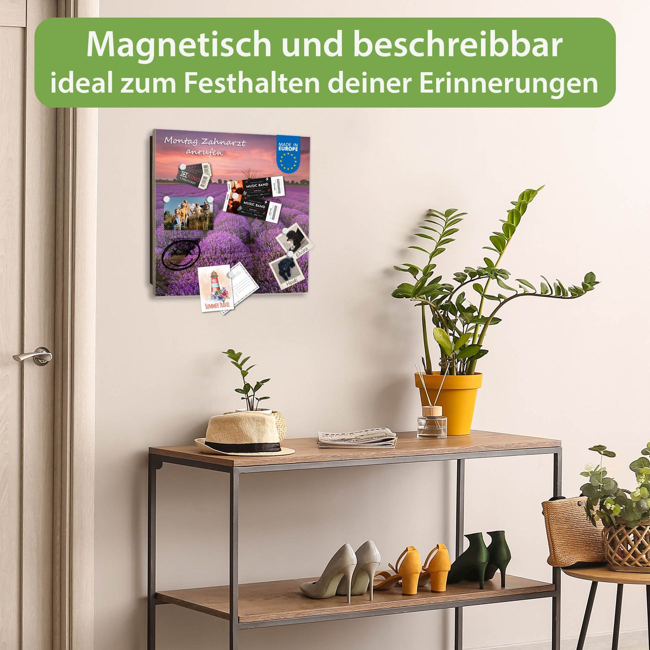 Bringe Ordnung und Eleganz in deinen Eingangsbereich mit dem banjado Schlüsselkasten Motiv Motiv Lavendelfeld. Die moderne Schlüsselbox kombiniert funktionales Design mit hochwertiger Verarbeitung und wird so zu einem echten Hingucker in Flur, Büro oder Ferienwohnung. ✅ Stilvolle Schlüsselaufbewahrung mit Glasfront im Motiv Motiv Lavendelfeld Der Design-Schlüsselkasten Motiv Motiv Lavendelfeld bietet Platz für bis zu 50 Schlüssel, die auf 5 stabilen Reihen mit je 10 Haken übersichtlich verstaut werden. Mit seinen kompakten Maßen von 30 x 30 x 5 cm passt die Schlüsselbox perfekt auch in kleinere Räume. Der schwarz lackierte Stahlkorpus mit rechts angeschlagenem Türscharnier harmoniert mit der Glasfront und fügt sich nahtlos in jedes Wohnambiente ein. Ob als Schlüsselorganizer für Zuhause oder als praktische Lösung für Büros, Praxen und Gewerbe, der banjado Schlüsselkasten sorgt für Ordnung und Übersicht. Dank der magnetischen, mit Kreidestiften beschreibbaren Glasfront kannst du Notizen anheften oder Termine direkt auf der Oberfläche festhalten. Die Schlüsselbox Motiv Motiv Lavendelfeld zur Wandmontage wird inklusive Befestigungsmaterial geliefert und ist schnell angebracht. So hast du deine Schlüssel jederzeit griffbereit und zugleich stilvoll verstaut. Mit diesem banjado Schlüsselkasten Motiv Motiv Lavendelfeld kombinierst du praktische Aufbewahrung mit stilvollem Wohndesign. Ob privat oder geschäftlich, die Schlüsselbox sorgt für mehr Ordnung, Übersicht und ein wohnliches Ambiente.Vorteile im Überblick