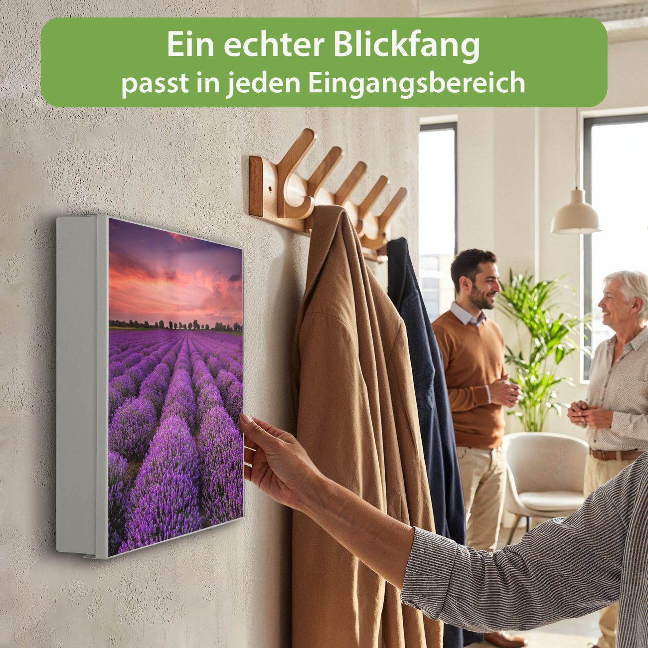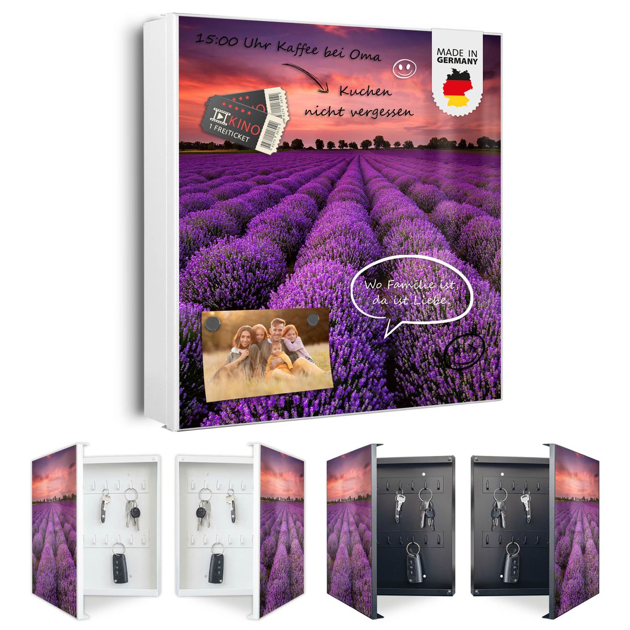 Bringe Ordnung und Eleganz in deinen Eingangsbereich mit dem banjado Schlüsselkasten Motiv Motiv Lavendelfeld. Die moderne Schlüsselbox kombiniert funktionales Design mit hochwertiger Verarbeitung und wird so zu einem echten Hingucker in Flur, Büro oder Ferienwohnung. ✅ Stilvolle Schlüsselaufbewahrung mit Motiv Motiv Lavendelfeld Der Design-Schlüsselkasten Motiv Motiv Lavendelfeld bietet Platz für bis zu 32 Schlüssel, die auf 4 stabilen Reihen mit je 8 Haken übersichtlich verstaut werden. Mit seinen kompakten Maßen von 30 x 30 x 5 cm passt die Schlüsselbox perfekt auch in kleinere Räume. Der weiß lackierte Stahlkorpus mit rechts angeschlagenem Türscharnier harmoniert mit gedruckten Folie auf der Front und fügt sich nahtlos in jedes Wohnambiente ein. Ob als Schlüsselorganizer für Zuhause oder als praktische Lösung für Büros, Praxen und Gewerbe, der banjado Schlüsselkasten sorgt für Ordnung und Übersicht. Dank der magnetischen, mit Kreidestiften beschreibbaren Folie auf der Front kannst du Notizen anheften oder Termine direkt auf der Oberfläche festhalten. Die Schlüsselbox Motiv Motiv Lavendelfeld zur Wandmontage wird inklusive Befestigungsmaterial geliefert und ist schnell angebracht. So hast du deine Schlüssel jederzeit griffbereit und zugleich stilvoll verstaut. Mit diesem banjado Schlüsselkasten Motiv Motiv Lavendelfeld kombinierst du praktische Aufbewahrung mit stilvollem Wohndesign. Ob privat oder geschäftlich, die Schlüsselbox sorgt für mehr Ordnung, Übersicht und ein wohnliches Ambiente.Vorteile im Überblick