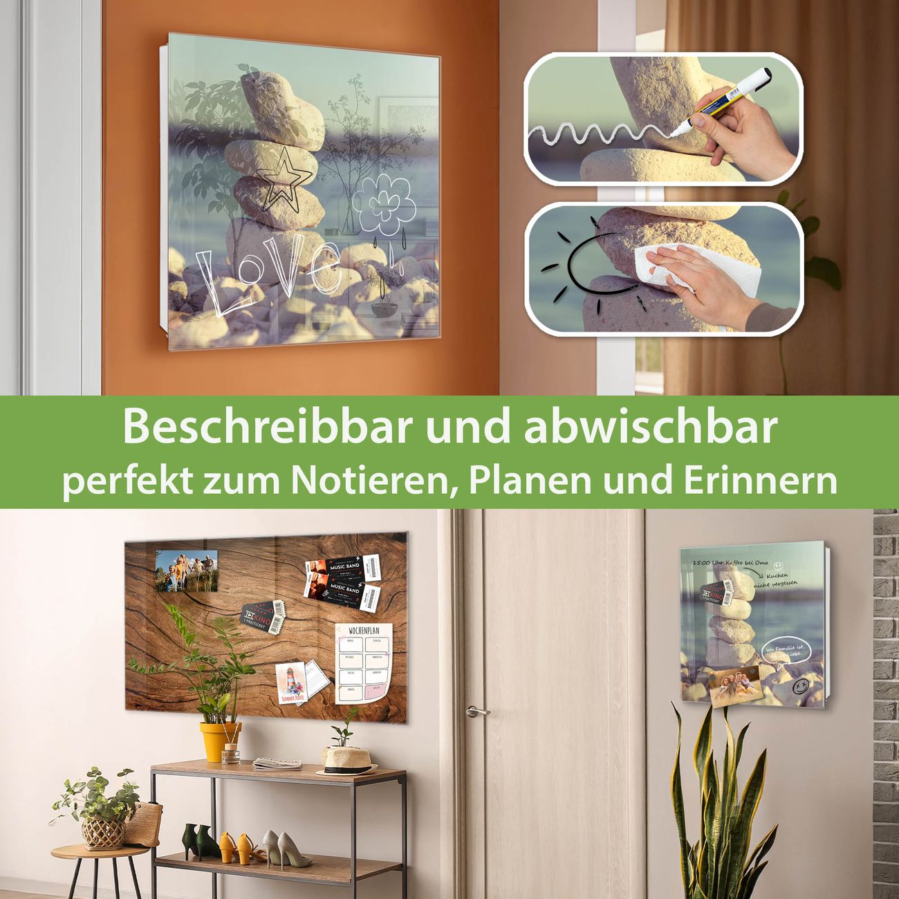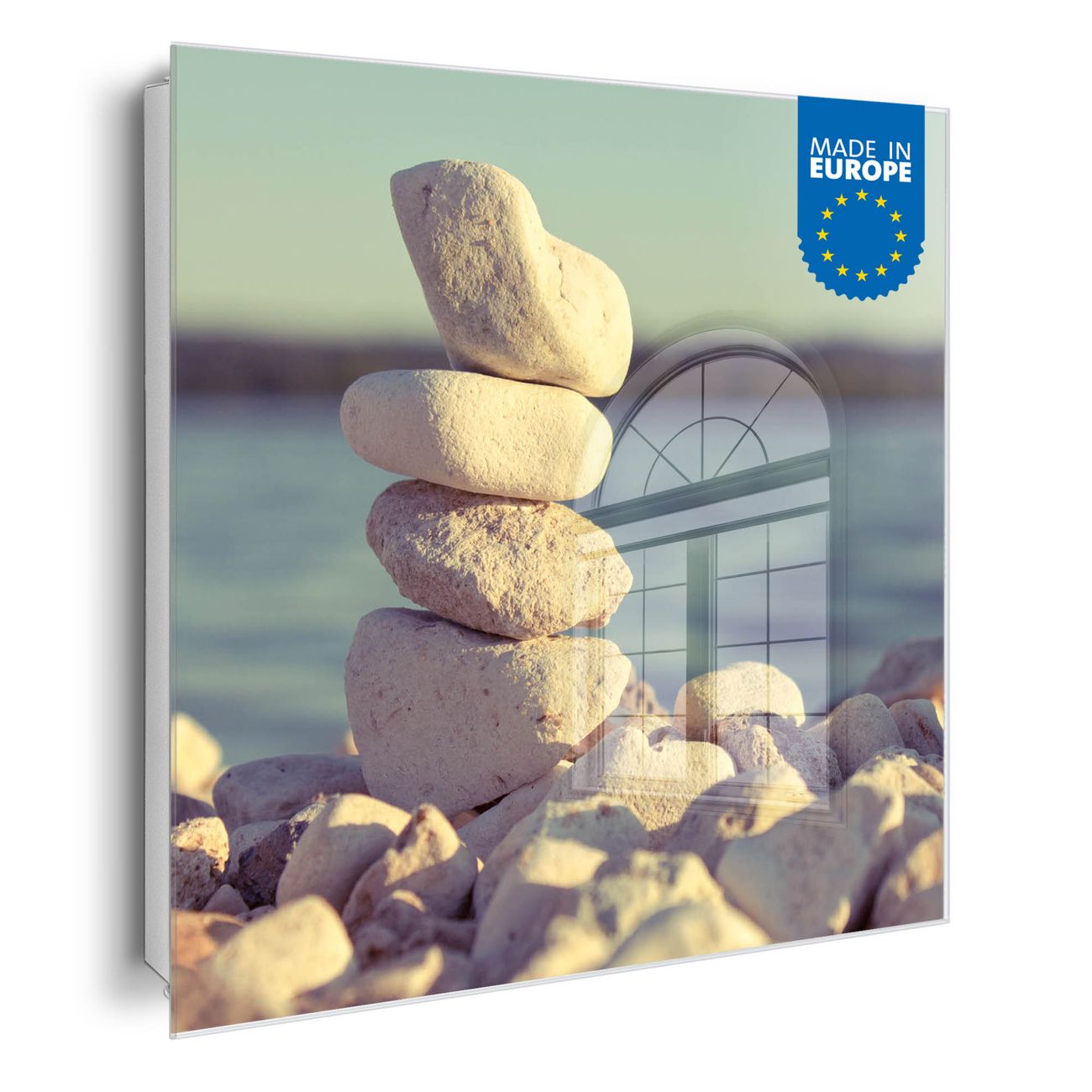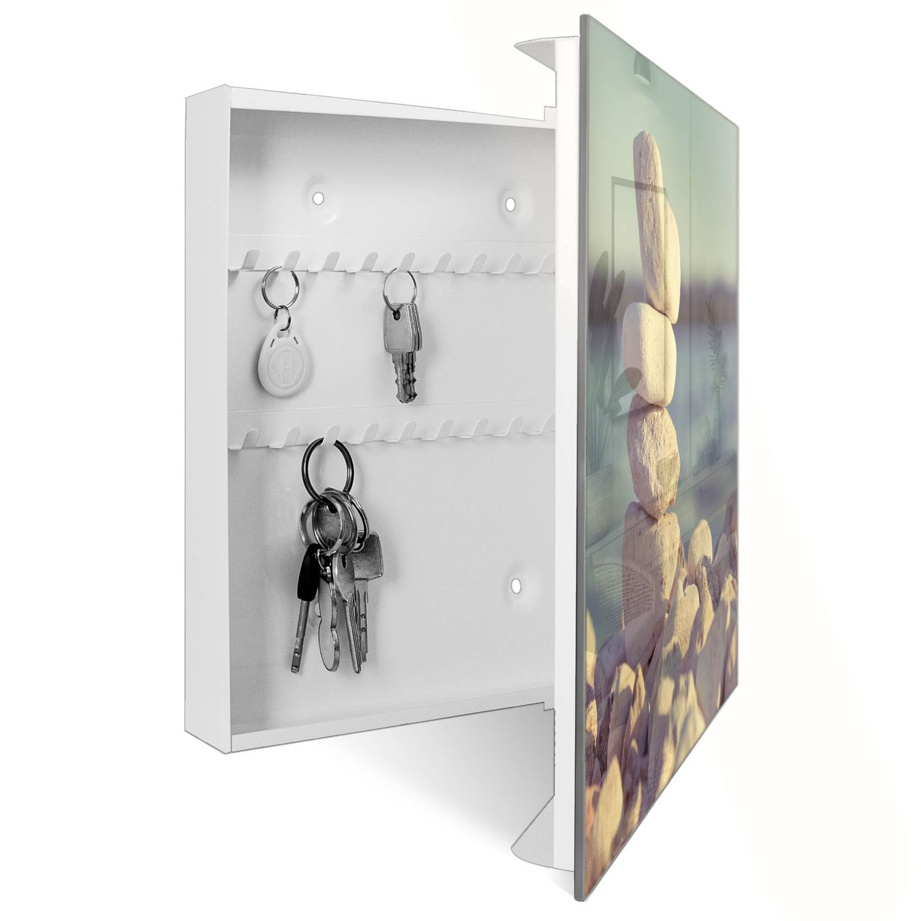 Bringe Ordnung und Eleganz in deinen Eingangsbereich mit dem banjado Schlüsselkasten Motiv Motiv Leichte Steine. Die moderne Schlüsselbox kombiniert funktionales Design mit hochwertiger Verarbeitung und wird so zu einem echten Hingucker in Flur, Büro oder Ferienwohnung. ✅ Stilvolle Schlüsselaufbewahrung mit Glasfront im Motiv Motiv Leichte Steine Der Design-Schlüsselkasten Motiv Motiv Leichte Steine bietet Platz für bis zu 50 Schlüssel, die auf 5 stabilen Reihen mit je 10 Haken übersichtlich verstaut werden. Mit seinen kompakten Maßen von 30 x 30 x 5 cm passt die Schlüsselbox perfekt auch in kleinere Räume. Der weiß lackierte Stahlkorpus mit rechts angeschlagenem Türscharnier harmoniert mit der Glasfront und fügt sich nahtlos in jedes Wohnambiente ein. Ob als Schlüsselorganizer für Zuhause oder als praktische Lösung für Büros, Praxen und Gewerbe, der banjado Schlüsselkasten sorgt für Ordnung und Übersicht. Dank der magnetischen, mit Kreidestiften beschreibbaren Glasfront kannst du Notizen anheften oder Termine direkt auf der Oberfläche festhalten. Die Schlüsselbox Motiv Motiv Leichte Steine zur Wandmontage wird inklusive Befestigungsmaterial geliefert und ist schnell angebracht. So hast du deine Schlüssel jederzeit griffbereit und zugleich stilvoll verstaut. Mit diesem banjado Schlüsselkasten Motiv Motiv Leichte Steine kombinierst du praktische Aufbewahrung mit stilvollem Wohndesign. Ob privat oder geschäftlich, die Schlüsselbox sorgt für mehr Ordnung, Übersicht und ein wohnliches Ambiente.Vorteile im Überblick