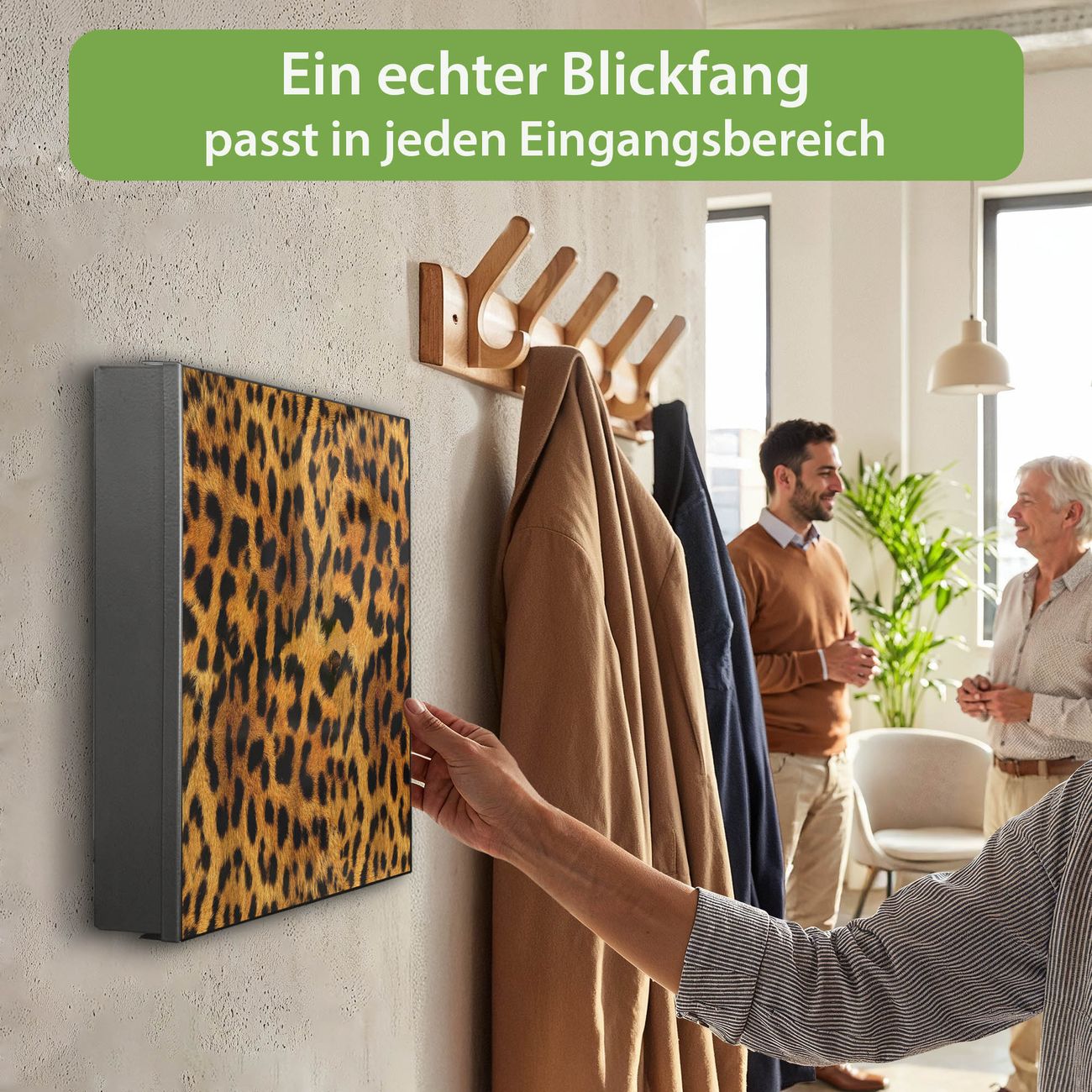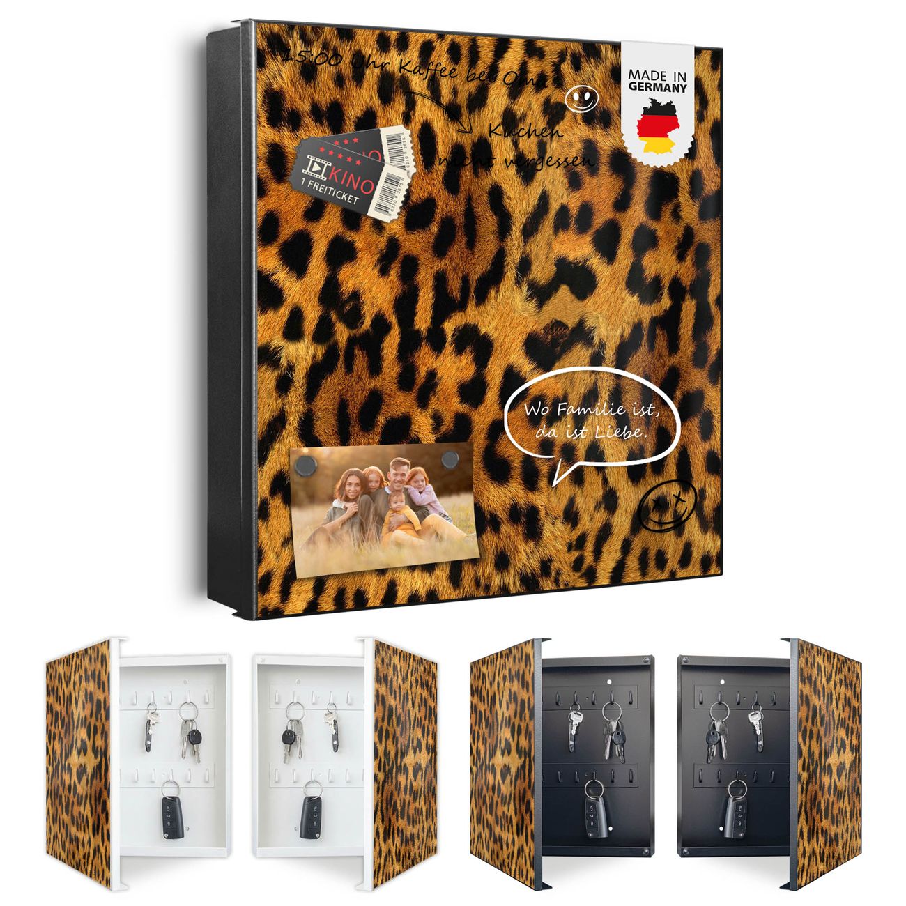 Bringe Ordnung und Eleganz in deinen Eingangsbereich mit dem banjado Schlüsselkasten Motiv Motiv Leopard. Die moderne Schlüsselbox kombiniert funktionales Design mit hochwertiger Verarbeitung und wird so zu einem echten Hingucker in Flur, Büro oder Ferienwohnung. ✅ Stilvolle Schlüsselaufbewahrung mit Motiv Motiv Leopard Der Design-Schlüsselkasten Motiv Motiv Leopard bietet Platz für bis zu 32 Schlüssel, die auf 4 stabilen Reihen mit je 8 Haken übersichtlich verstaut werden. Mit seinen kompakten Maßen von 30 x 30 x 5 cm passt die Schlüsselbox perfekt auch in kleinere Räume. Der schwarz lackierte Stahlkorpus mit links angeschlagenem Türscharnier harmoniert mit gedruckten Folie auf der Front und fügt sich nahtlos in jedes Wohnambiente ein. Ob als Schlüsselorganizer für Zuhause oder als praktische Lösung für Büros, Praxen und Gewerbe, der banjado Schlüsselkasten sorgt für Ordnung und Übersicht. Dank der magnetischen, mit Kreidestiften beschreibbaren Folie auf der Front kannst du Notizen anheften oder Termine direkt auf der Oberfläche festhalten. Die Schlüsselbox Motiv Motiv Leopard zur Wandmontage wird inklusive Befestigungsmaterial geliefert und ist schnell angebracht. So hast du deine Schlüssel jederzeit griffbereit und zugleich stilvoll verstaut. Mit diesem banjado Schlüsselkasten Motiv Motiv Leopard kombinierst du praktische Aufbewahrung mit stilvollem Wohndesign. Ob privat oder geschäftlich, die Schlüsselbox sorgt für mehr Ordnung, Übersicht und ein wohnliches Ambiente.Vorteile im Überblick