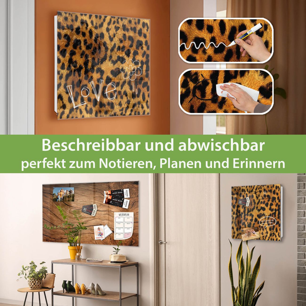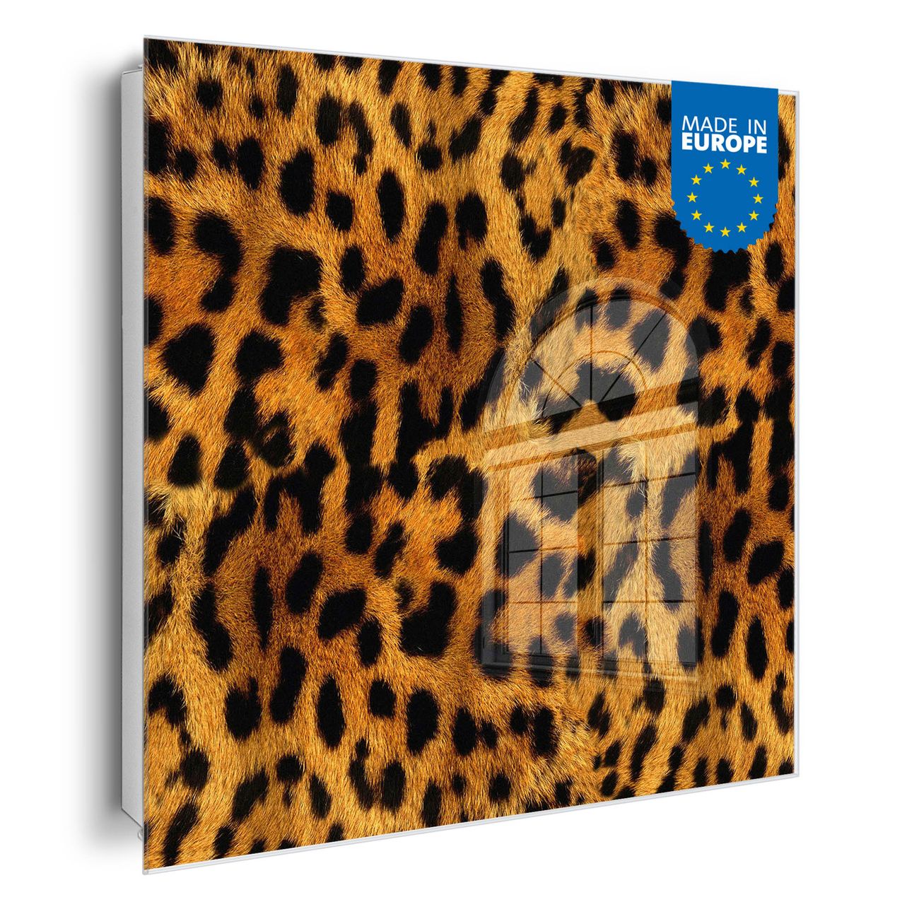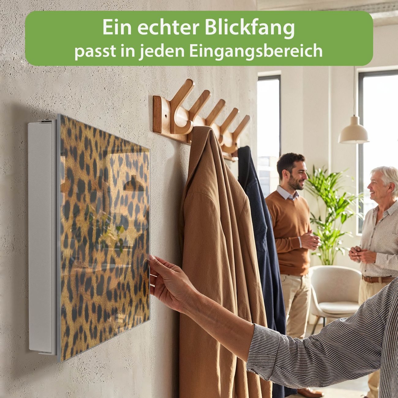 Bringe Ordnung und Eleganz in deinen Eingangsbereich mit dem banjado Schlüsselkasten Motiv Motiv Leopard. Die moderne Schlüsselbox kombiniert funktionales Design mit hochwertiger Verarbeitung und wird so zu einem echten Hingucker in Flur, Büro oder Ferienwohnung. ✅ Stilvolle Schlüsselaufbewahrung mit Glasfront im Motiv Motiv Leopard Der Design-Schlüsselkasten Motiv Motiv Leopard bietet Platz für bis zu 50 Schlüssel, die auf 5 stabilen Reihen mit je 10 Haken übersichtlich verstaut werden. Mit seinen kompakten Maßen von 30 x 30 x 5 cm passt die Schlüsselbox perfekt auch in kleinere Räume. Der weiß lackierte Stahlkorpus mit rechts angeschlagenem Türscharnier harmoniert mit der Glasfront und fügt sich nahtlos in jedes Wohnambiente ein. Ob als Schlüsselorganizer für Zuhause oder als praktische Lösung für Büros, Praxen und Gewerbe, der banjado Schlüsselkasten sorgt für Ordnung und Übersicht. Dank der magnetischen, mit Kreidestiften beschreibbaren Glasfront kannst du Notizen anheften oder Termine direkt auf der Oberfläche festhalten. Die Schlüsselbox Motiv Motiv Leopard zur Wandmontage wird inklusive Befestigungsmaterial geliefert und ist schnell angebracht. So hast du deine Schlüssel jederzeit griffbereit und zugleich stilvoll verstaut. Mit diesem banjado Schlüsselkasten Motiv Motiv Leopard kombinierst du praktische Aufbewahrung mit stilvollem Wohndesign. Ob privat oder geschäftlich, die Schlüsselbox sorgt für mehr Ordnung, Übersicht und ein wohnliches Ambiente.Vorteile im Überblick
