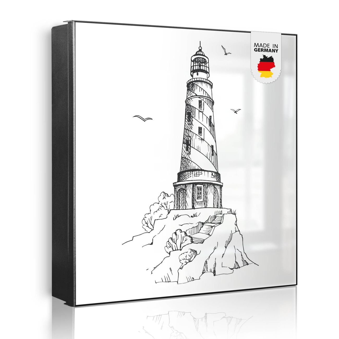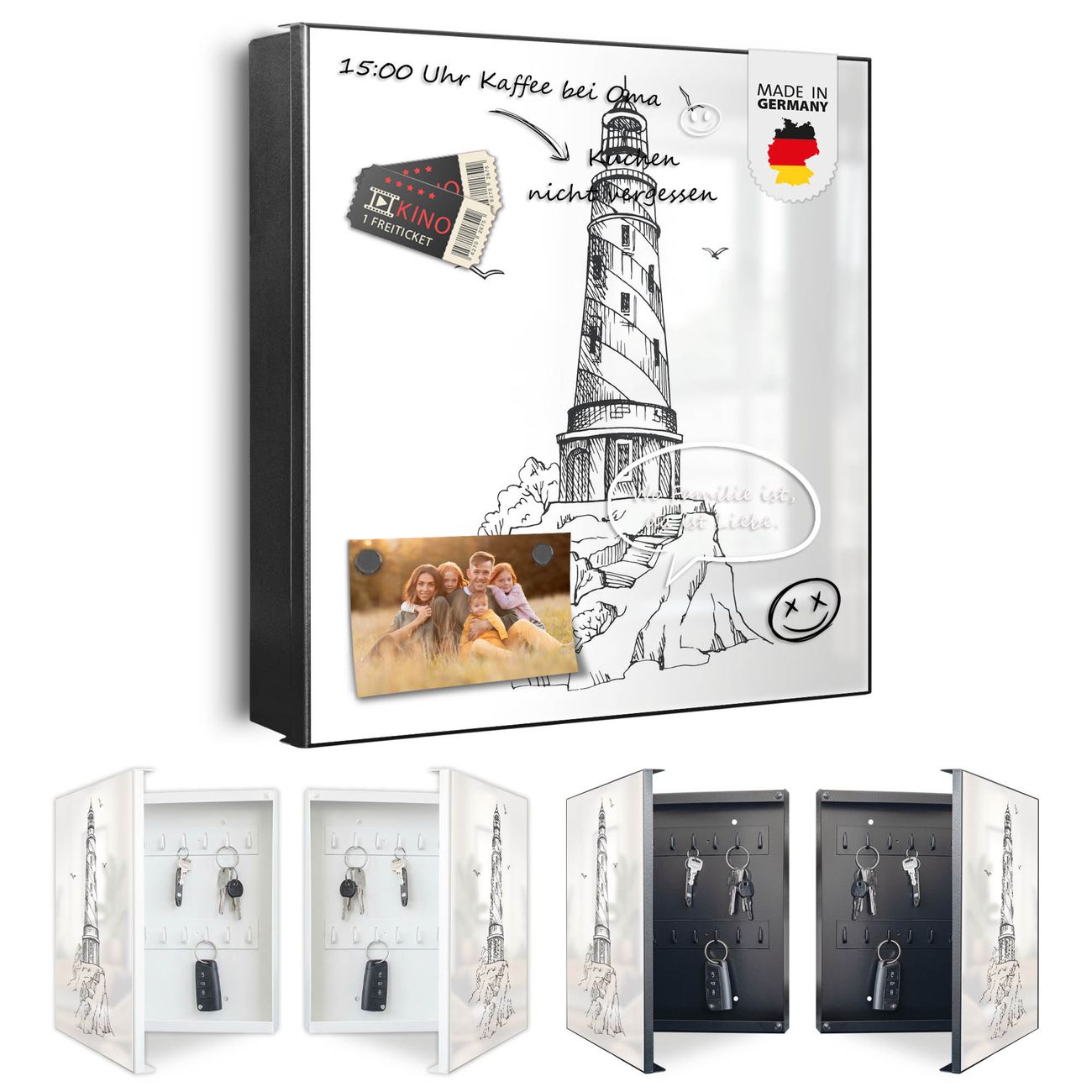 Bringe Ordnung und Eleganz in deinen Eingangsbereich mit dem banjado Schlüsselkasten Motiv Motiv Leuchtturm 7. Die moderne Schlüsselbox kombiniert funktionales Design mit hochwertiger Verarbeitung und wird so zu einem echten Hingucker in Flur, Büro oder Ferienwohnung. ✅ Stilvolle Schlüsselaufbewahrung mit Motiv Motiv Leuchtturm 7 Der Design-Schlüsselkasten Motiv Motiv Leuchtturm 7 bietet Platz für bis zu 32 Schlüssel, die auf 4 stabilen Reihen mit je 8 Haken übersichtlich verstaut werden. Mit seinen kompakten Maßen von 30 x 30 x 5 cm passt die Schlüsselbox perfekt auch in kleinere Räume. Der schwarz lackierte Stahlkorpus mit rechts angeschlagenem Türscharnier harmoniert mit gedruckten Folie auf der Front und fügt sich nahtlos in jedes Wohnambiente ein. Ob als Schlüsselorganizer für Zuhause oder als praktische Lösung für Büros, Praxen und Gewerbe, der banjado Schlüsselkasten sorgt für Ordnung und Übersicht. Dank der magnetischen, mit Kreidestiften beschreibbaren Folie auf der Front kannst du Notizen anheften oder Termine direkt auf der Oberfläche festhalten. Die Schlüsselbox Motiv Motiv Leuchtturm 7 zur Wandmontage wird inklusive Befestigungsmaterial geliefert und ist schnell angebracht. So hast du deine Schlüssel jederzeit griffbereit und zugleich stilvoll verstaut. Mit diesem banjado Schlüsselkasten Motiv Motiv Leuchtturm 7 kombinierst du praktische Aufbewahrung mit stilvollem Wohndesign. Ob privat oder geschäftlich, die Schlüsselbox sorgt für mehr Ordnung, Übersicht und ein wohnliches Ambiente.Vorteile im Überblick