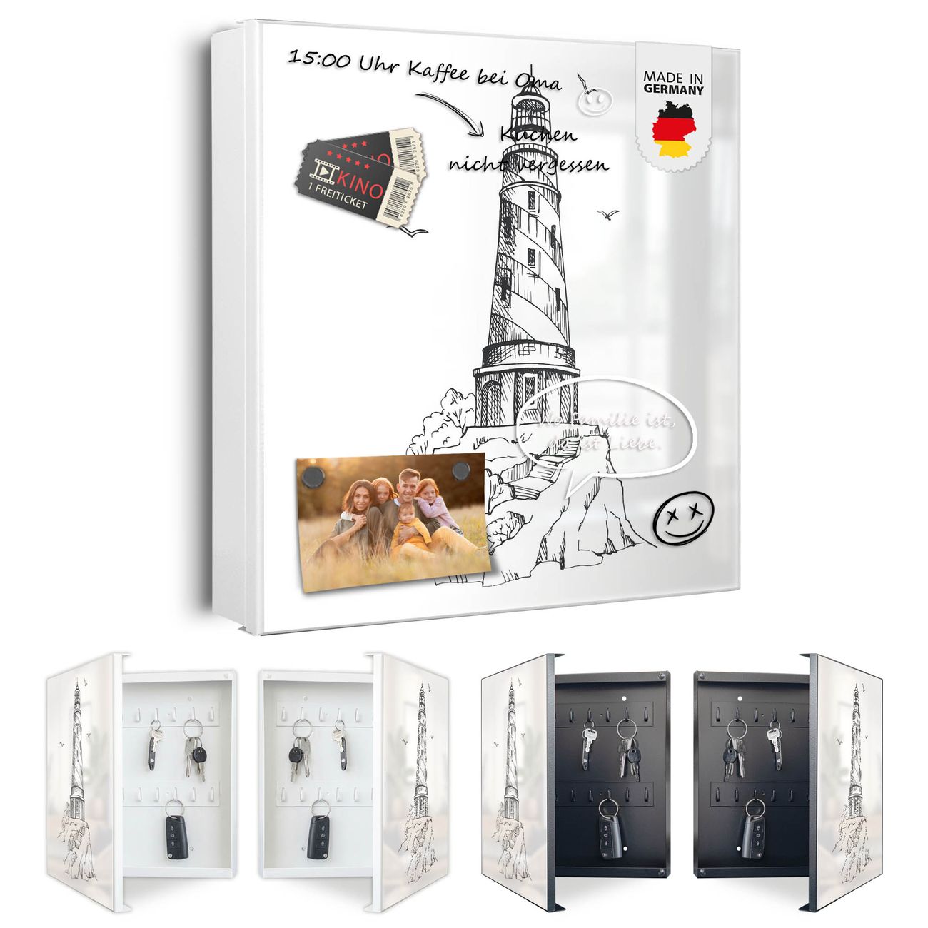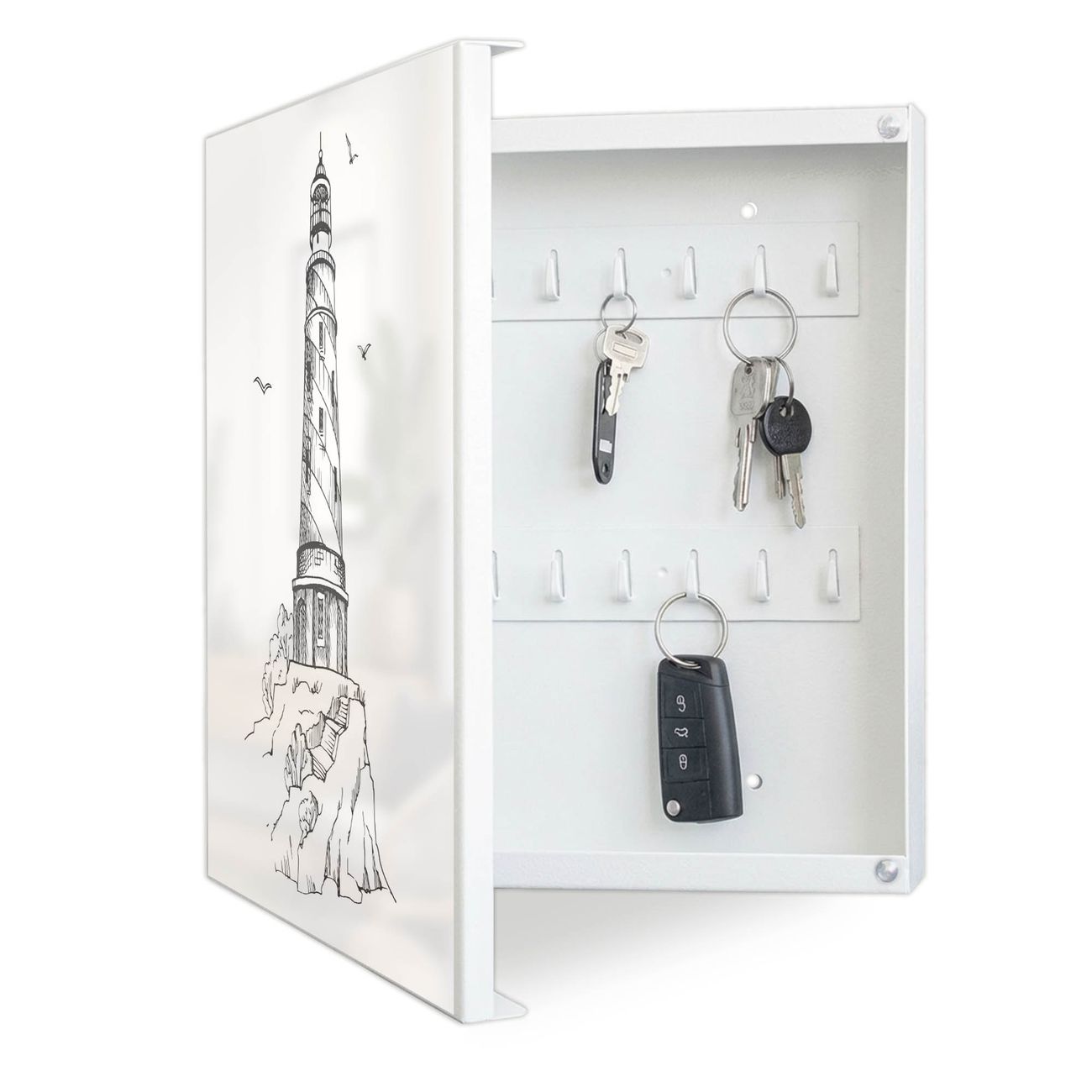 Bringe Ordnung und Eleganz in deinen Eingangsbereich mit dem banjado Schlüsselkasten Motiv Motiv Leuchtturm 7. Die moderne Schlüsselbox kombiniert funktionales Design mit hochwertiger Verarbeitung und wird so zu einem echten Hingucker in Flur, Büro oder Ferienwohnung. ✅ Stilvolle Schlüsselaufbewahrung mit Motiv Motiv Leuchtturm 7 Der Design-Schlüsselkasten Motiv Motiv Leuchtturm 7 bietet Platz für bis zu 32 Schlüssel, die auf 4 stabilen Reihen mit je 8 Haken übersichtlich verstaut werden. Mit seinen kompakten Maßen von 30 x 30 x 5 cm passt die Schlüsselbox perfekt auch in kleinere Räume. Der weiß lackierte Stahlkorpus mit links angeschlagenem Türscharnier harmoniert mit gedruckten Folie auf der Front und fügt sich nahtlos in jedes Wohnambiente ein. Ob als Schlüsselorganizer für Zuhause oder als praktische Lösung für Büros, Praxen und Gewerbe, der banjado Schlüsselkasten sorgt für Ordnung und Übersicht. Dank der magnetischen, mit Kreidestiften beschreibbaren Folie auf der Front kannst du Notizen anheften oder Termine direkt auf der Oberfläche festhalten. Die Schlüsselbox Motiv Motiv Leuchtturm 7 zur Wandmontage wird inklusive Befestigungsmaterial geliefert und ist schnell angebracht. So hast du deine Schlüssel jederzeit griffbereit und zugleich stilvoll verstaut. Mit diesem banjado Schlüsselkasten Motiv Motiv Leuchtturm 7 kombinierst du praktische Aufbewahrung mit stilvollem Wohndesign. Ob privat oder geschäftlich, die Schlüsselbox sorgt für mehr Ordnung, Übersicht und ein wohnliches Ambiente.Vorteile im Überblick