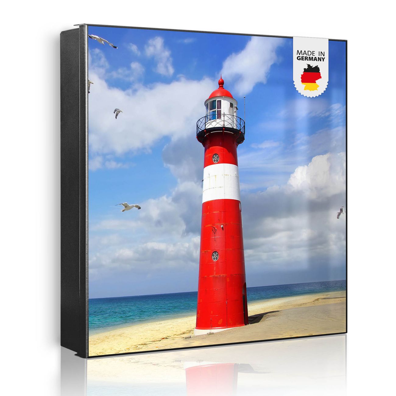 Bringe Ordnung und Eleganz in deinen Eingangsbereich mit dem banjado Schlüsselkasten Motiv Motiv Leuchtturm Westkapelle. Die moderne Schlüsselbox kombiniert funktionales Design mit hochwertiger Verarbeitung und wird so zu einem echten Hingucker in Flur, Büro oder Ferienwohnung. ✅ Stilvolle Schlüsselaufbewahrung mit Motiv Motiv Leuchtturm Westkapelle Der Design-Schlüsselkasten Motiv Motiv Leuchtturm Westkapelle bietet Platz für bis zu 32 Schlüssel, die auf 4 stabilen Reihen mit je 8 Haken übersichtlich verstaut werden. Mit seinen kompakten Maßen von 30 x 30 x 5 cm passt die Schlüsselbox perfekt auch in kleinere Räume. Der schwarz lackierte Stahlkorpus mit rechts angeschlagenem Türscharnier harmoniert mit gedruckten Folie auf der Front und fügt sich nahtlos in jedes Wohnambiente ein. Ob als Schlüsselorganizer für Zuhause oder als praktische Lösung für Büros, Praxen und Gewerbe, der banjado Schlüsselkasten sorgt für Ordnung und Übersicht. Dank der magnetischen, mit Kreidestiften beschreibbaren Folie auf der Front kannst du Notizen anheften oder Termine direkt auf der Oberfläche festhalten. Die Schlüsselbox Motiv Motiv Leuchtturm Westkapelle zur Wandmontage wird inklusive Befestigungsmaterial geliefert und ist schnell angebracht. So hast du deine Schlüssel jederzeit griffbereit und zugleich stilvoll verstaut. Mit diesem banjado Schlüsselkasten Motiv Motiv Leuchtturm Westkapelle kombinierst du praktische Aufbewahrung mit stilvollem Wohndesign. Ob privat oder geschäftlich, die Schlüsselbox sorgt für mehr Ordnung, Übersicht und ein wohnliches Ambiente.Vorteile im Überblick