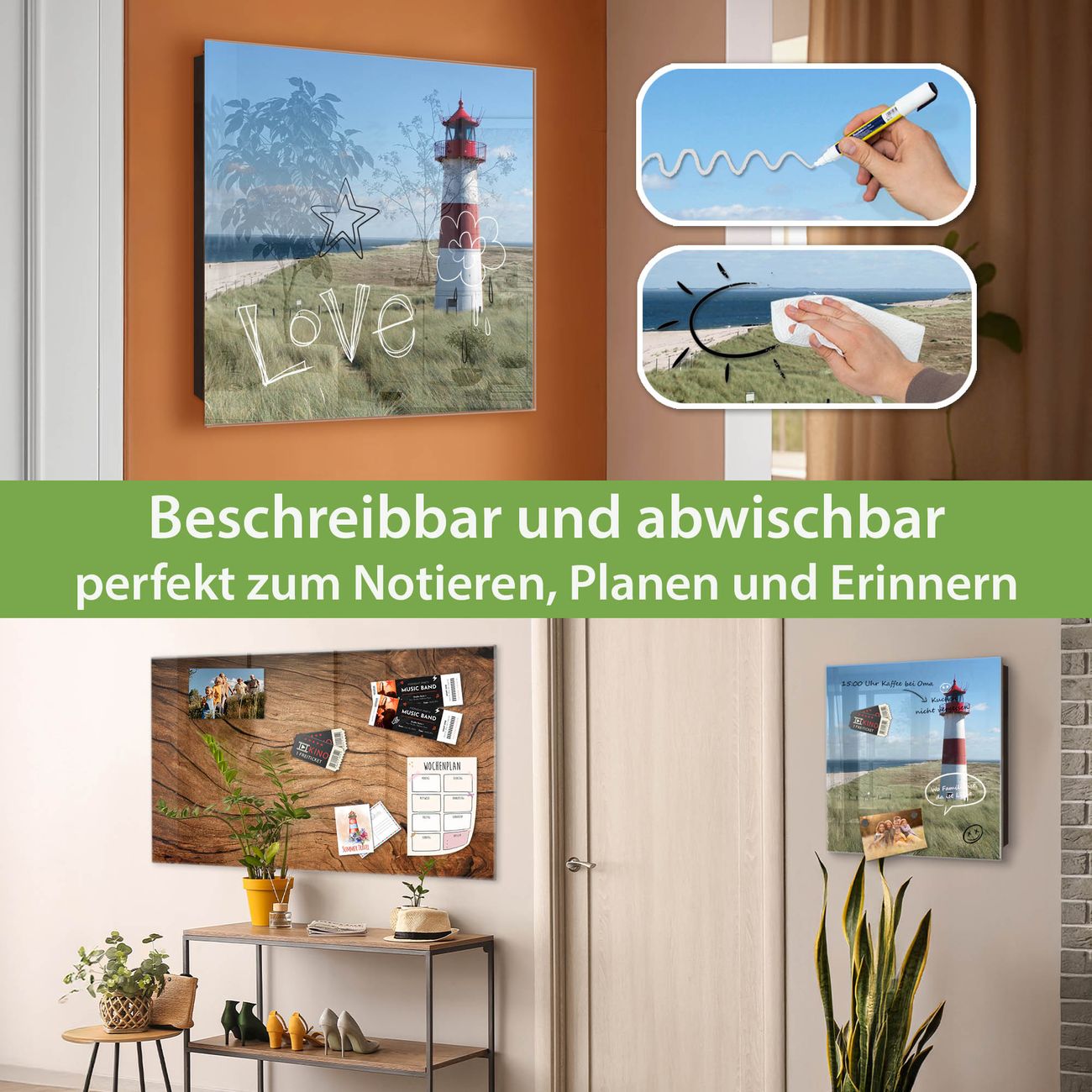 ✅ Magnetisch und mit Kreidestift beschreibbar, gehärtetes Glas, links angeschlagene TürOrdnung und Design in einem