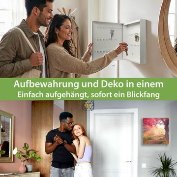 Bringe Ordnung und Eleganz in deinen Eingangsbereich mit dem banjado Schlüsselkasten Motiv Motiv Lichtung Im Herbst. Die moderne Schlüsselbox kombiniert funktionales Design mit hochwertiger Verarbeitung und wird so zu einem echten Hingucker in Flur, Büro oder Ferienwohnung. ✅ Stilvolle Schlüsselaufbewahrung mit Glasfront im Motiv Motiv Lichtung Im Herbst Der Design-Schlüsselkasten Motiv Motiv Lichtung Im Herbst bietet Platz für bis zu 50 Schlüssel, die auf 5 stabilen Reihen mit je 10 Haken übersichtlich verstaut werden. Mit seinen kompakten Maßen von 30 x 30 x 5 cm passt die Schlüsselbox perfekt auch in kleinere Räume. Der weiß lackierte Stahlkorpus mit rechts angeschlagenem Türscharnier harmoniert mit der Glasfront und fügt sich nahtlos in jedes Wohnambiente ein. Ob als Schlüsselorganizer für Zuhause oder als praktische Lösung für Büros, Praxen und Gewerbe, der banjado Schlüsselkasten sorgt für Ordnung und Übersicht. Dank der magnetischen, mit Kreidestiften beschreibbaren Glasfront kannst du Notizen anheften oder Termine direkt auf der Oberfläche festhalten. Die Schlüsselbox Motiv Motiv Lichtung Im Herbst zur Wandmontage wird inklusive Befestigungsmaterial geliefert und ist schnell angebracht. So hast du deine Schlüssel jederzeit griffbereit und zugleich stilvoll verstaut. Mit diesem banjado Schlüsselkasten Motiv Motiv Lichtung Im Herbst kombinierst du praktische Aufbewahrung mit stilvollem Wohndesign. Ob privat oder geschäftlich, die Schlüsselbox sorgt für mehr Ordnung, Übersicht und ein wohnliches Ambiente.Vorteile im Überblick