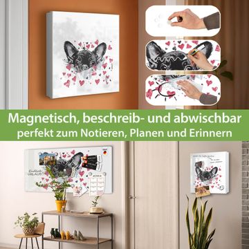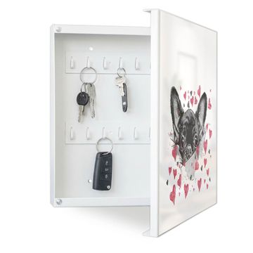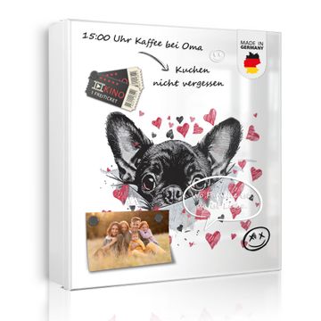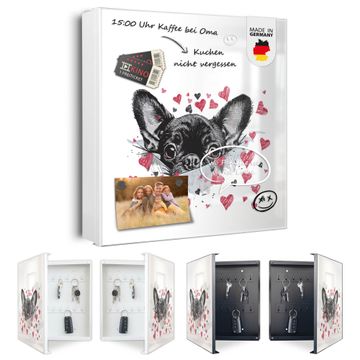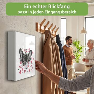 Bringe Ordnung und Eleganz in deinen Eingangsbereich mit dem banjado Schlüsselkasten Motiv Motiv Hund mit Herzen. Die moderne Schlüsselbox kombiniert funktionales Design mit hochwertiger Verarbeitung und wird so zu einem echten Hingucker in Flur, Büro oder Ferienwohnung. ✅ Stilvolle Schlüsselaufbewahrung mit Motiv Motiv Hund mit Herzen Der Design-Schlüsselkasten Motiv Motiv Hund mit Herzen bietet Platz für bis zu 32 Schlüssel, die auf 4 stabilen Reihen mit je 8 Haken übersichtlich verstaut werden. Mit seinen kompakten Maßen von 30 x 30 x 5 cm passt die Schlüsselbox perfekt auch in kleinere Räume. Der weiß lackierte Stahlkorpus mit rechts angeschlagenem Türscharnier harmoniert mit gedruckten Folie auf der Front und fügt sich nahtlos in jedes Wohnambiente ein. Ob als Schlüsselorganizer für Zuhause oder als praktische Lösung für Büros, Praxen und Gewerbe, der banjado Schlüsselkasten sorgt für Ordnung und Übersicht. Dank der magnetischen, mit Kreidestiften beschreibbaren Folie auf der Front kannst du Notizen anheften oder Termine direkt auf der Oberfläche festhalten. Die Schlüsselbox Motiv Motiv Hund mit Herzen zur Wandmontage wird inklusive Befestigungsmaterial geliefert und ist schnell angebracht. So hast du deine Schlüssel jederzeit griffbereit und zugleich stilvoll verstaut. Mit diesem banjado Schlüsselkasten Motiv Motiv Hund mit Herzen kombinierst du praktische Aufbewahrung mit stilvollem Wohndesign. Ob privat oder geschäftlich, die Schlüsselbox sorgt für mehr Ordnung, Übersicht und ein wohnliches Ambiente.Vorteile im Überblick