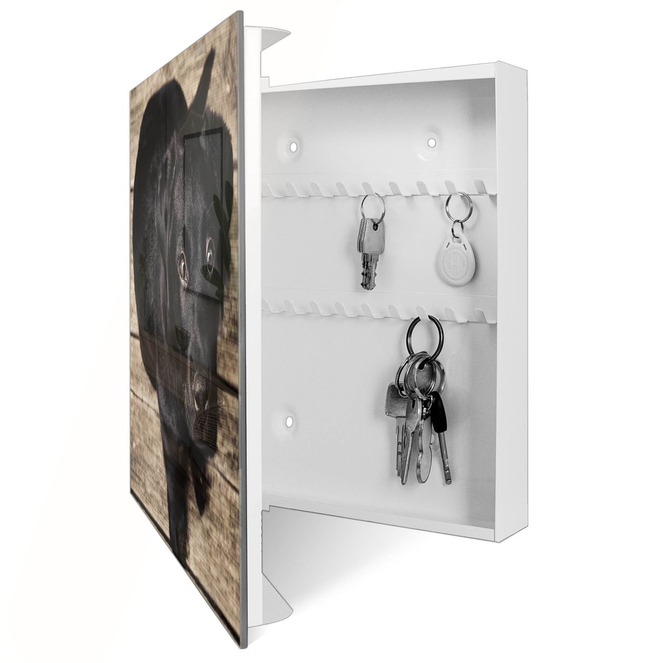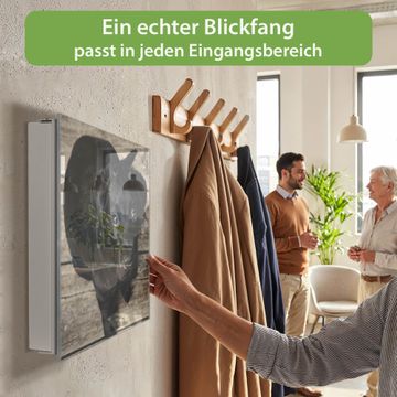 Bringe Ordnung und Eleganz in deinen Eingangsbereich mit dem banjado Schlüsselkasten Motiv Motiv Lieselotte. Die moderne Schlüsselbox kombiniert funktionales Design mit hochwertiger Verarbeitung und wird so zu einem echten Hingucker in Flur, Büro oder Ferienwohnung. ✅ Stilvolle Schlüsselaufbewahrung mit Glasfront im Motiv Motiv Lieselotte Der Design-Schlüsselkasten Motiv Motiv Lieselotte bietet Platz für bis zu 50 Schlüssel, die auf 5 stabilen Reihen mit je 10 Haken übersichtlich verstaut werden. Mit seinen kompakten Maßen von 30 x 30 x 5 cm passt die Schlüsselbox perfekt auch in kleinere Räume. Der weiß lackierte Stahlkorpus mit rechts angeschlagenem Türscharnier harmoniert mit der Glasfront und fügt sich nahtlos in jedes Wohnambiente ein. Ob als Schlüsselorganizer für Zuhause oder als praktische Lösung für Büros, Praxen und Gewerbe, der banjado Schlüsselkasten sorgt für Ordnung und Übersicht. Dank der magnetischen, mit Kreidestiften beschreibbaren Glasfront kannst du Notizen anheften oder Termine direkt auf der Oberfläche festhalten. Die Schlüsselbox Motiv Motiv Lieselotte zur Wandmontage wird inklusive Befestigungsmaterial geliefert und ist schnell angebracht. So hast du deine Schlüssel jederzeit griffbereit und zugleich stilvoll verstaut. Mit diesem banjado Schlüsselkasten Motiv Motiv Lieselotte kombinierst du praktische Aufbewahrung mit stilvollem Wohndesign. Ob privat oder geschäftlich, die Schlüsselbox sorgt für mehr Ordnung, Übersicht und ein wohnliches Ambiente.Vorteile im Überblick