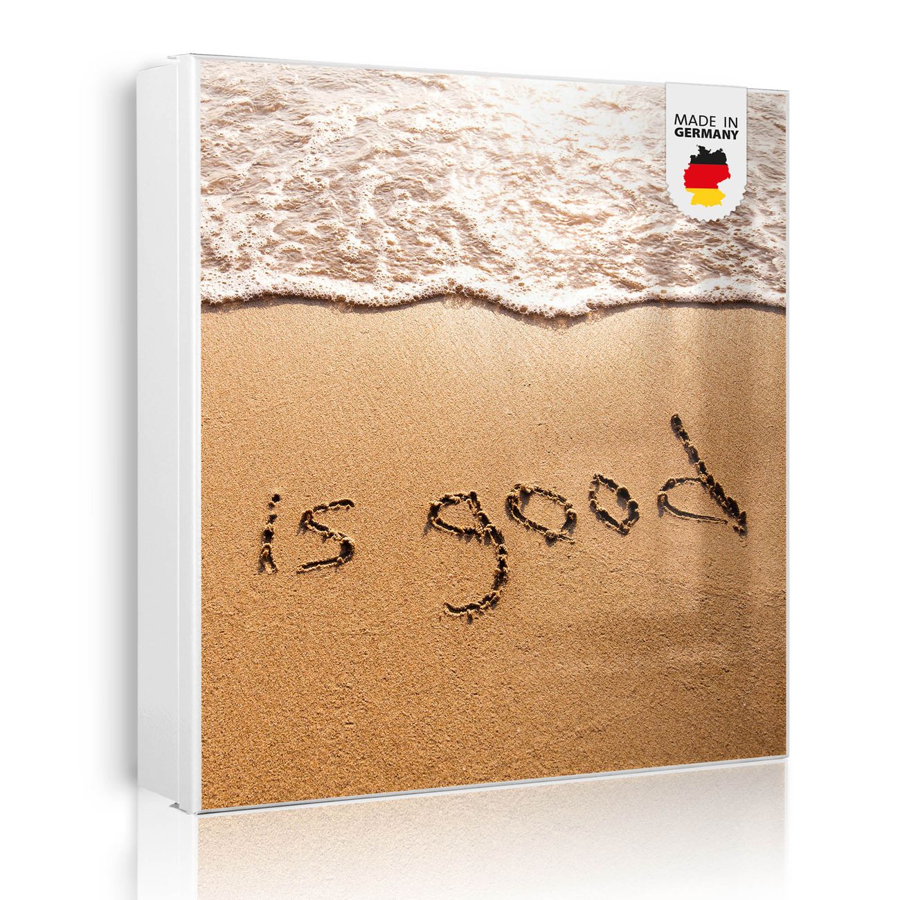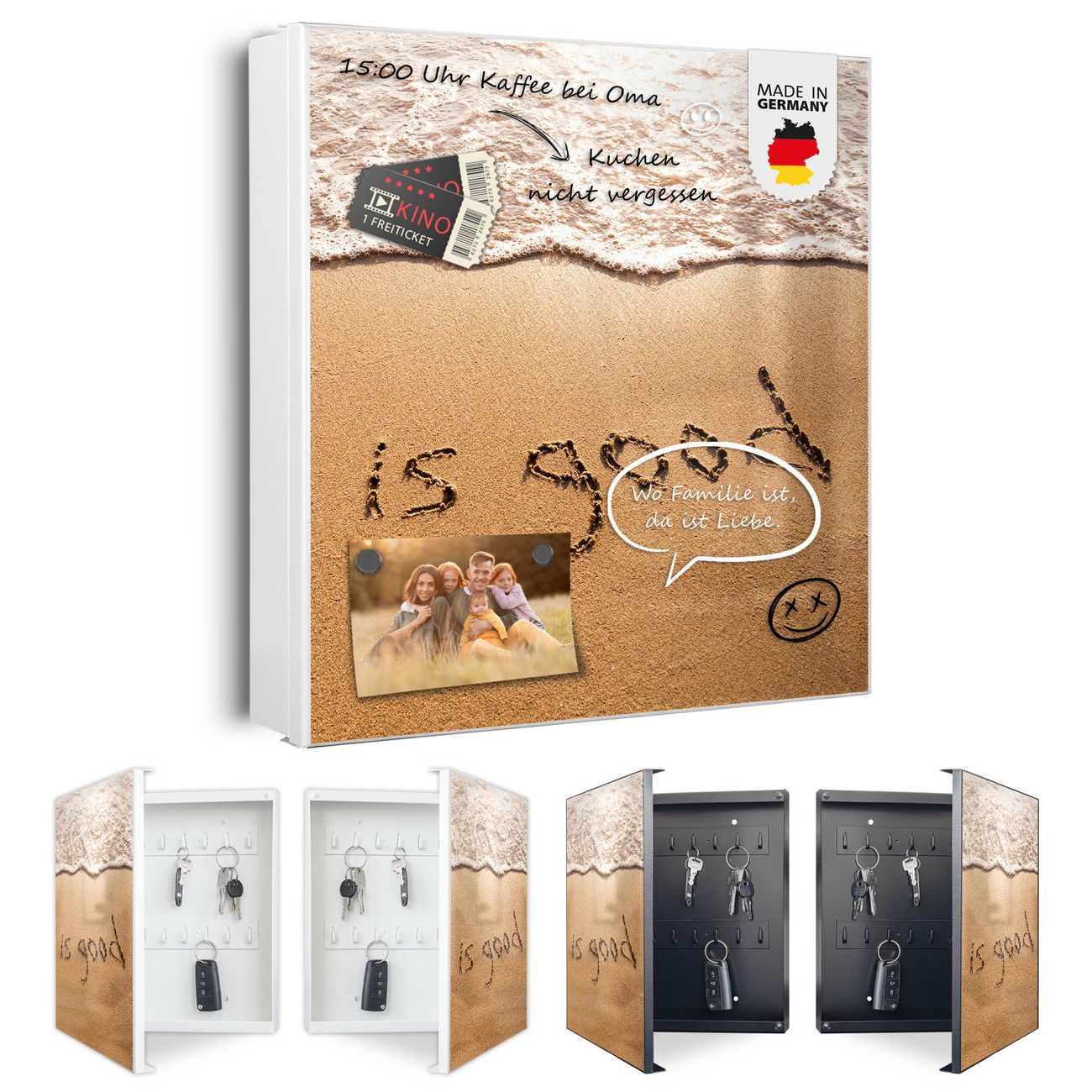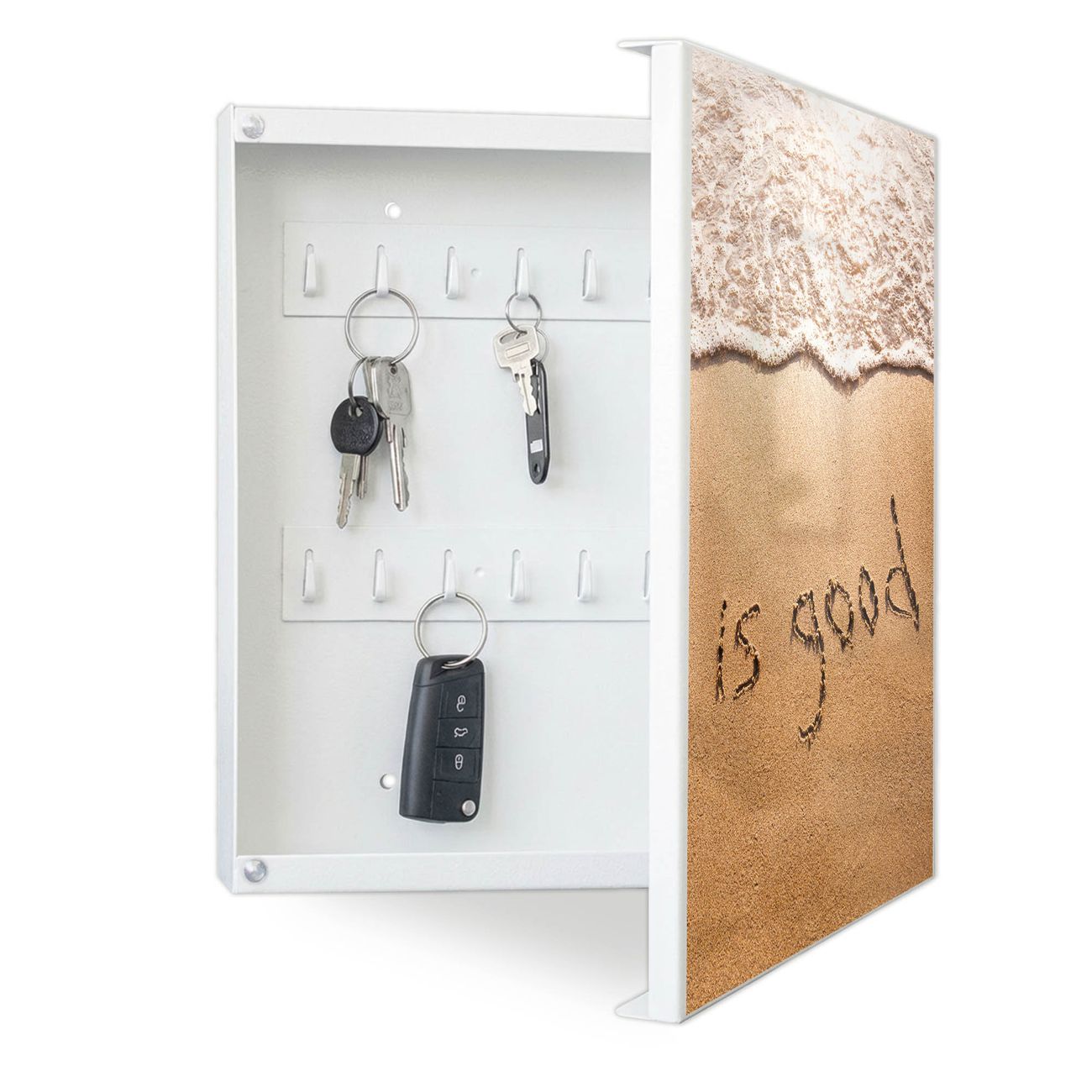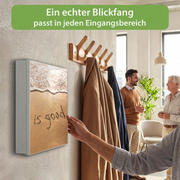 Bringe Ordnung und Eleganz in deinen Eingangsbereich mit dem banjado Schlüsselkasten Motiv Motiv Strand Text. Die moderne Schlüsselbox kombiniert funktionales Design mit hochwertiger Verarbeitung und wird so zu einem echten Hingucker in Flur, Büro oder Ferienwohnung. ✅ Stilvolle Schlüsselaufbewahrung mit Motiv Motiv Strand Text Der Design-Schlüsselkasten Motiv Motiv Strand Text bietet Platz für bis zu 32 Schlüssel, die auf 4 stabilen Reihen mit je 8 Haken übersichtlich verstaut werden. Mit seinen kompakten Maßen von 30 x 30 x 5 cm passt die Schlüsselbox perfekt auch in kleinere Räume. Der weiß lackierte Stahlkorpus mit rechts angeschlagenem Türscharnier harmoniert mit gedruckten Folie auf der Front und fügt sich nahtlos in jedes Wohnambiente ein. Ob als Schlüsselorganizer für Zuhause oder als praktische Lösung für Büros, Praxen und Gewerbe, der banjado Schlüsselkasten sorgt für Ordnung und Übersicht. Dank der magnetischen, mit Kreidestiften beschreibbaren Folie auf der Front kannst du Notizen anheften oder Termine direkt auf der Oberfläche festhalten. Die Schlüsselbox Motiv Motiv Strand Text zur Wandmontage wird inklusive Befestigungsmaterial geliefert und ist schnell angebracht. So hast du deine Schlüssel jederzeit griffbereit und zugleich stilvoll verstaut. Mit diesem banjado Schlüsselkasten Motiv Motiv Strand Text kombinierst du praktische Aufbewahrung mit stilvollem Wohndesign. Ob privat oder geschäftlich, die Schlüsselbox sorgt für mehr Ordnung, Übersicht und ein wohnliches Ambiente.Vorteile im Überblick