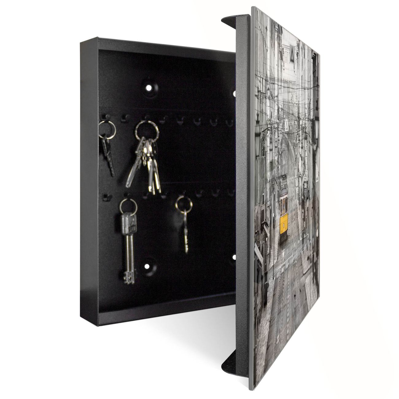 Bringe Ordnung und Eleganz in deinen Eingangsbereich mit dem banjado Schlüsselkasten Motiv Motiv Lissabon. Die moderne Schlüsselbox kombiniert funktionales Design mit hochwertiger Verarbeitung und wird so zu einem echten Hingucker in Flur, Büro oder Ferienwohnung. ✅ Stilvolle Schlüsselaufbewahrung mit Glasfront im Motiv Motiv Lissabon Der Design-Schlüsselkasten Motiv Motiv Lissabon bietet Platz für bis zu 50 Schlüssel, die auf 5 stabilen Reihen mit je 10 Haken übersichtlich verstaut werden. Mit seinen kompakten Maßen von 30 x 30 x 5 cm passt die Schlüsselbox perfekt auch in kleinere Räume. Der schwarz lackierte Stahlkorpus mit rechts angeschlagenem Türscharnier harmoniert mit der Glasfront und fügt sich nahtlos in jedes Wohnambiente ein. Ob als Schlüsselorganizer für Zuhause oder als praktische Lösung für Büros, Praxen und Gewerbe, der banjado Schlüsselkasten sorgt für Ordnung und Übersicht. Dank der magnetischen, mit Kreidestiften beschreibbaren Glasfront kannst du Notizen anheften oder Termine direkt auf der Oberfläche festhalten. Die Schlüsselbox Motiv Motiv Lissabon zur Wandmontage wird inklusive Befestigungsmaterial geliefert und ist schnell angebracht. So hast du deine Schlüssel jederzeit griffbereit und zugleich stilvoll verstaut. Mit diesem banjado Schlüsselkasten Motiv Motiv Lissabon kombinierst du praktische Aufbewahrung mit stilvollem Wohndesign. Ob privat oder geschäftlich, die Schlüsselbox sorgt für mehr Ordnung, Übersicht und ein wohnliches Ambiente.Vorteile im Überblick