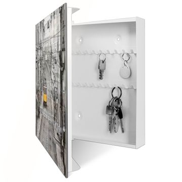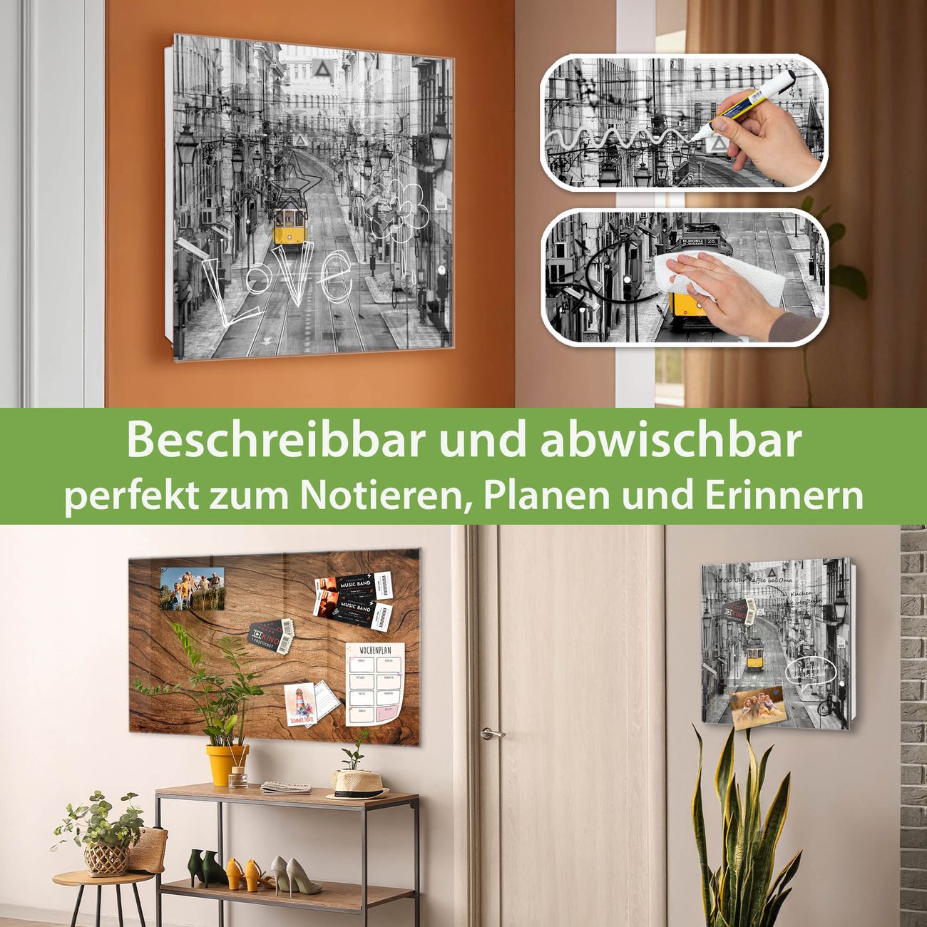 Bringe Ordnung und Eleganz in deinen Eingangsbereich mit dem banjado Schlüsselkasten Motiv Motiv Lissabon. Die moderne Schlüsselbox kombiniert funktionales Design mit hochwertiger Verarbeitung und wird so zu einem echten Hingucker in Flur, Büro oder Ferienwohnung. ✅ Stilvolle Schlüsselaufbewahrung mit Glasfront im Motiv Motiv Lissabon Der Design-Schlüsselkasten Motiv Motiv Lissabon bietet Platz für bis zu 50 Schlüssel, die auf 5 stabilen Reihen mit je 10 Haken übersichtlich verstaut werden. Mit seinen kompakten Maßen von 30 x 30 x 5 cm passt die Schlüsselbox perfekt auch in kleinere Räume. Der weiß lackierte Stahlkorpus mit rechts angeschlagenem Türscharnier harmoniert mit der Glasfront und fügt sich nahtlos in jedes Wohnambiente ein. Ob als Schlüsselorganizer für Zuhause oder als praktische Lösung für Büros, Praxen und Gewerbe, der banjado Schlüsselkasten sorgt für Ordnung und Übersicht. Dank der magnetischen, mit Kreidestiften beschreibbaren Glasfront kannst du Notizen anheften oder Termine direkt auf der Oberfläche festhalten. Die Schlüsselbox Motiv Motiv Lissabon zur Wandmontage wird inklusive Befestigungsmaterial geliefert und ist schnell angebracht. So hast du deine Schlüssel jederzeit griffbereit und zugleich stilvoll verstaut. Mit diesem banjado Schlüsselkasten Motiv Motiv Lissabon kombinierst du praktische Aufbewahrung mit stilvollem Wohndesign. Ob privat oder geschäftlich, die Schlüsselbox sorgt für mehr Ordnung, Übersicht und ein wohnliches Ambiente.Vorteile im Überblick