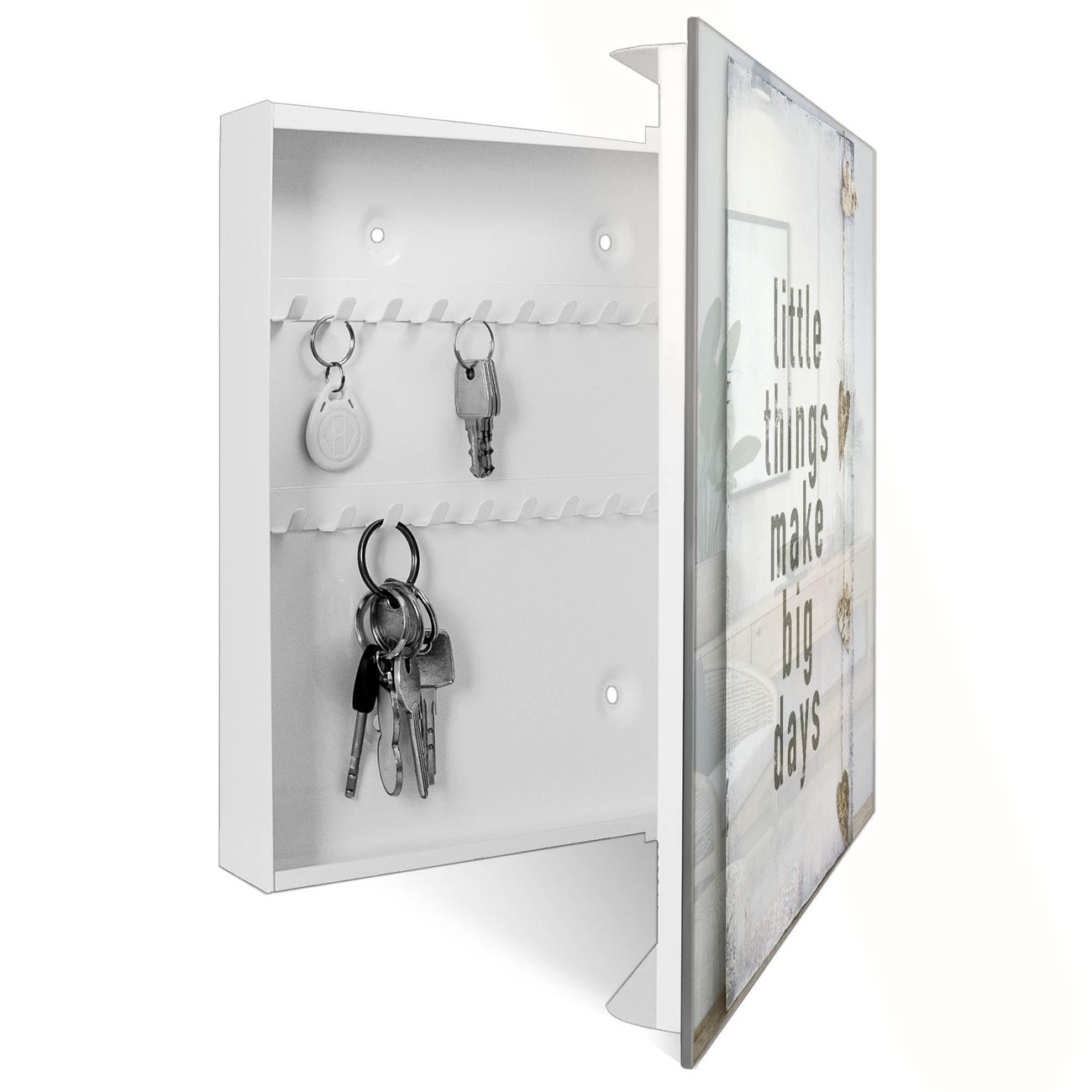 Bringe Ordnung und Eleganz in deinen Eingangsbereich mit dem banjado Schlüsselkasten Motiv Motiv Little Things. Die moderne Schlüsselbox kombiniert funktionales Design mit hochwertiger Verarbeitung und wird so zu einem echten Hingucker in Flur, Büro oder Ferienwohnung. ✅ Stilvolle Schlüsselaufbewahrung mit Glasfront im Motiv Motiv Little Things Der Design-Schlüsselkasten Motiv Motiv Little Things bietet Platz für bis zu 50 Schlüssel, die auf 5 stabilen Reihen mit je 10 Haken übersichtlich verstaut werden. Mit seinen kompakten Maßen von 30 x 30 x 5 cm passt die Schlüsselbox perfekt auch in kleinere Räume. Der weiß lackierte Stahlkorpus mit rechts angeschlagenem Türscharnier harmoniert mit der Glasfront und fügt sich nahtlos in jedes Wohnambiente ein. Ob als Schlüsselorganizer für Zuhause oder als praktische Lösung für Büros, Praxen und Gewerbe, der banjado Schlüsselkasten sorgt für Ordnung und Übersicht. Dank der magnetischen, mit Kreidestiften beschreibbaren Glasfront kannst du Notizen anheften oder Termine direkt auf der Oberfläche festhalten. Die Schlüsselbox Motiv Motiv Little Things zur Wandmontage wird inklusive Befestigungsmaterial geliefert und ist schnell angebracht. So hast du deine Schlüssel jederzeit griffbereit und zugleich stilvoll verstaut. Mit diesem banjado Schlüsselkasten Motiv Motiv Little Things kombinierst du praktische Aufbewahrung mit stilvollem Wohndesign. Ob privat oder geschäftlich, die Schlüsselbox sorgt für mehr Ordnung, Übersicht und ein wohnliches Ambiente.Vorteile im Überblick
