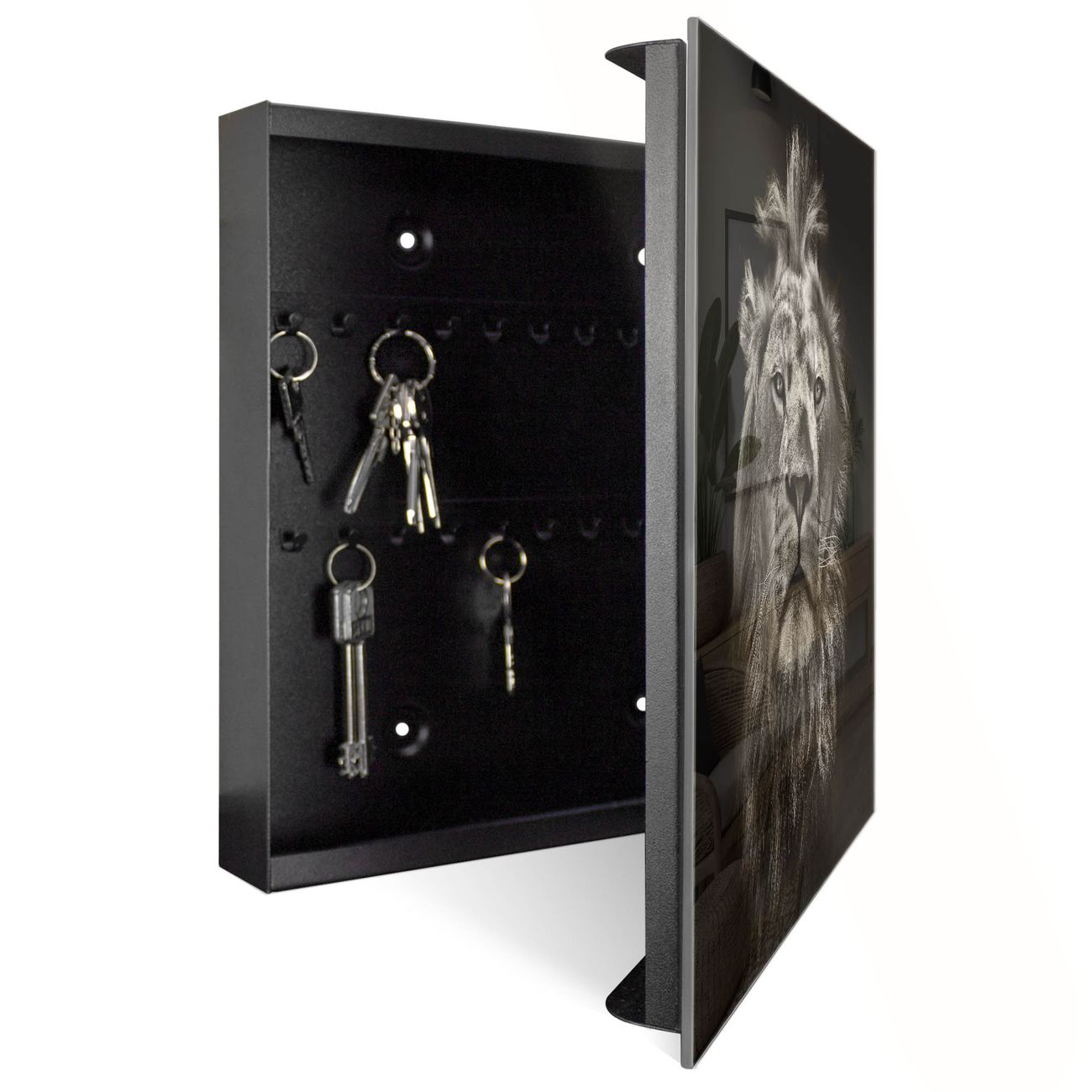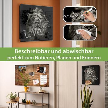 Bringe Ordnung und Eleganz in deinen Eingangsbereich mit dem banjado Schlüsselkasten Motiv Motiv Löwe Porträt. Die moderne Schlüsselbox kombiniert funktionales Design mit hochwertiger Verarbeitung und wird so zu einem echten Hingucker in Flur, Büro oder Ferienwohnung. ✅ Stilvolle Schlüsselaufbewahrung mit Glasfront im Motiv Motiv Löwe Porträt Der Design-Schlüsselkasten Motiv Motiv Löwe Porträt bietet Platz für bis zu 50 Schlüssel, die auf 5 stabilen Reihen mit je 10 Haken übersichtlich verstaut werden. Mit seinen kompakten Maßen von 30 x 30 x 5 cm passt die Schlüsselbox perfekt auch in kleinere Räume. Der schwarz lackierte Stahlkorpus mit rechts angeschlagenem Türscharnier harmoniert mit der Glasfront und fügt sich nahtlos in jedes Wohnambiente ein. Ob als Schlüsselorganizer für Zuhause oder als praktische Lösung für Büros, Praxen und Gewerbe, der banjado Schlüsselkasten sorgt für Ordnung und Übersicht. Dank der magnetischen, mit Kreidestiften beschreibbaren Glasfront kannst du Notizen anheften oder Termine direkt auf der Oberfläche festhalten. Die Schlüsselbox Motiv Motiv Löwe Porträt zur Wandmontage wird inklusive Befestigungsmaterial geliefert und ist schnell angebracht. So hast du deine Schlüssel jederzeit griffbereit und zugleich stilvoll verstaut. Mit diesem banjado Schlüsselkasten Motiv Motiv Löwe Porträt kombinierst du praktische Aufbewahrung mit stilvollem Wohndesign. Ob privat oder geschäftlich, die Schlüsselbox sorgt für mehr Ordnung, Übersicht und ein wohnliches Ambiente.Vorteile im Überblick