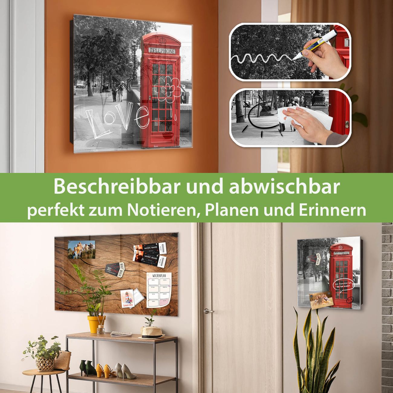 Bringe Ordnung und Eleganz in deinen Eingangsbereich mit dem banjado Schlüsselkasten Motiv Motiv London Red Telephone. Die moderne Schlüsselbox kombiniert funktionales Design mit hochwertiger Verarbeitung und wird so zu einem echten Hingucker in Flur, Büro oder Ferienwohnung. ✅ Stilvolle Schlüsselaufbewahrung mit Glasfront im Motiv Motiv London Red Telephone Der Design-Schlüsselkasten Motiv Motiv London Red Telephone bietet Platz für bis zu 50 Schlüssel, die auf 5 stabilen Reihen mit je 10 Haken übersichtlich verstaut werden. Mit seinen kompakten Maßen von 30 x 30 x 5 cm passt die Schlüsselbox perfekt auch in kleinere Räume. Der schwarz lackierte Stahlkorpus mit rechts angeschlagenem Türscharnier harmoniert mit der Glasfront und fügt sich nahtlos in jedes Wohnambiente ein. Ob als Schlüsselorganizer für Zuhause oder als praktische Lösung für Büros, Praxen und Gewerbe, der banjado Schlüsselkasten sorgt für Ordnung und Übersicht. Dank der magnetischen, mit Kreidestiften beschreibbaren Glasfront kannst du Notizen anheften oder Termine direkt auf der Oberfläche festhalten. Die Schlüsselbox Motiv Motiv London Red Telephone zur Wandmontage wird inklusive Befestigungsmaterial geliefert und ist schnell angebracht. So hast du deine Schlüssel jederzeit griffbereit und zugleich stilvoll verstaut. Mit diesem banjado Schlüsselkasten Motiv Motiv London Red Telephone kombinierst du praktische Aufbewahrung mit stilvollem Wohndesign. Ob privat oder geschäftlich, die Schlüsselbox sorgt für mehr Ordnung, Übersicht und ein wohnliches Ambiente.Vorteile im Überblick