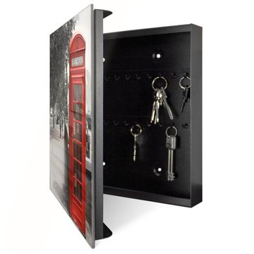 Bringe Ordnung und Eleganz in deinen Eingangsbereich mit dem banjado Schlüsselkasten Motiv Motiv London Red Telephone. Die moderne Schlüsselbox kombiniert funktionales Design mit hochwertiger Verarbeitung und wird so zu einem echten Hingucker in Flur, Büro oder Ferienwohnung. ✅ Stilvolle Schlüsselaufbewahrung mit Glasfront im Motiv Motiv London Red Telephone Der Design-Schlüsselkasten Motiv Motiv London Red Telephone bietet Platz für bis zu 50 Schlüssel, die auf 5 stabilen Reihen mit je 10 Haken übersichtlich verstaut werden. Mit seinen kompakten Maßen von 30 x 30 x 5 cm passt die Schlüsselbox perfekt auch in kleinere Räume. Der schwarz lackierte Stahlkorpus mit rechts angeschlagenem Türscharnier harmoniert mit der Glasfront und fügt sich nahtlos in jedes Wohnambiente ein. Ob als Schlüsselorganizer für Zuhause oder als praktische Lösung für Büros, Praxen und Gewerbe, der banjado Schlüsselkasten sorgt für Ordnung und Übersicht. Dank der magnetischen, mit Kreidestiften beschreibbaren Glasfront kannst du Notizen anheften oder Termine direkt auf der Oberfläche festhalten. Die Schlüsselbox Motiv Motiv London Red Telephone zur Wandmontage wird inklusive Befestigungsmaterial geliefert und ist schnell angebracht. So hast du deine Schlüssel jederzeit griffbereit und zugleich stilvoll verstaut. Mit diesem banjado Schlüsselkasten Motiv Motiv London Red Telephone kombinierst du praktische Aufbewahrung mit stilvollem Wohndesign. Ob privat oder geschäftlich, die Schlüsselbox sorgt für mehr Ordnung, Übersicht und ein wohnliches Ambiente.Vorteile im Überblick