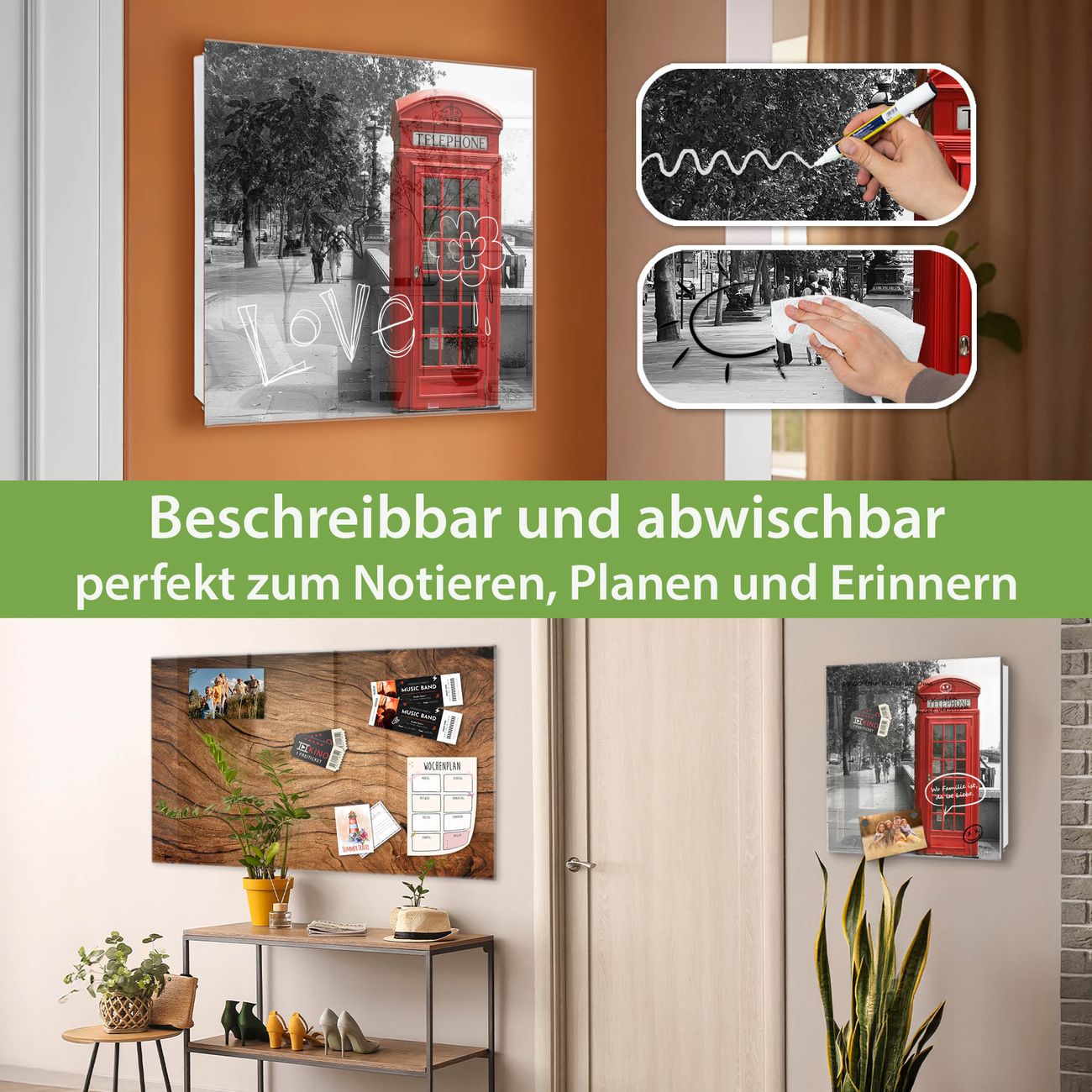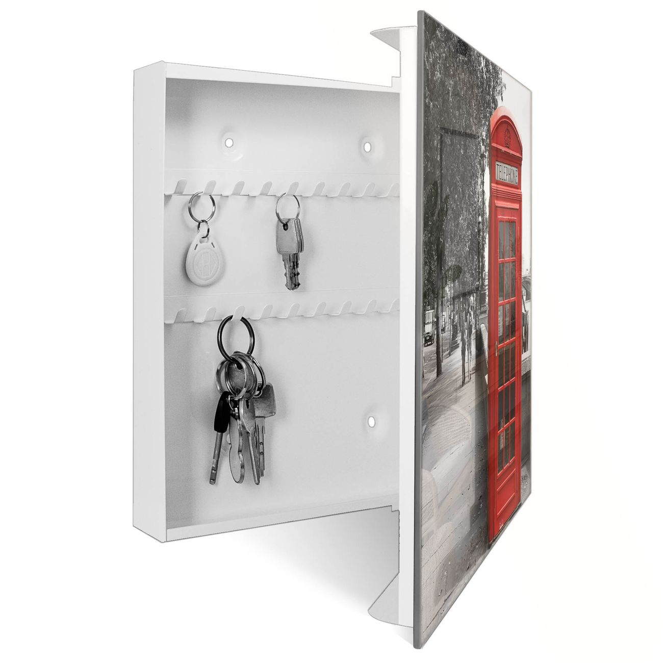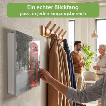 Bringe Ordnung und Eleganz in deinen Eingangsbereich mit dem banjado Schlüsselkasten Motiv Motiv London Red Telephone. Die moderne Schlüsselbox kombiniert funktionales Design mit hochwertiger Verarbeitung und wird so zu einem echten Hingucker in Flur, Büro oder Ferienwohnung. ✅ Stilvolle Schlüsselaufbewahrung mit Glasfront im Motiv Motiv London Red Telephone Der Design-Schlüsselkasten Motiv Motiv London Red Telephone bietet Platz für bis zu 50 Schlüssel, die auf 5 stabilen Reihen mit je 10 Haken übersichtlich verstaut werden. Mit seinen kompakten Maßen von 30 x 30 x 5 cm passt die Schlüsselbox perfekt auch in kleinere Räume. Der weiß lackierte Stahlkorpus mit rechts angeschlagenem Türscharnier harmoniert mit der Glasfront und fügt sich nahtlos in jedes Wohnambiente ein. Ob als Schlüsselorganizer für Zuhause oder als praktische Lösung für Büros, Praxen und Gewerbe, der banjado Schlüsselkasten sorgt für Ordnung und Übersicht. Dank der magnetischen, mit Kreidestiften beschreibbaren Glasfront kannst du Notizen anheften oder Termine direkt auf der Oberfläche festhalten. Die Schlüsselbox Motiv Motiv London Red Telephone zur Wandmontage wird inklusive Befestigungsmaterial geliefert und ist schnell angebracht. So hast du deine Schlüssel jederzeit griffbereit und zugleich stilvoll verstaut. Mit diesem banjado Schlüsselkasten Motiv Motiv London Red Telephone kombinierst du praktische Aufbewahrung mit stilvollem Wohndesign. Ob privat oder geschäftlich, die Schlüsselbox sorgt für mehr Ordnung, Übersicht und ein wohnliches Ambiente.Vorteile im Überblick