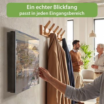 Bringe Ordnung und Eleganz in deinen Eingangsbereich mit dem banjado Schlüsselkasten Motiv Motiv London. Die moderne Schlüsselbox kombiniert funktionales Design mit hochwertiger Verarbeitung und wird so zu einem echten Hingucker in Flur, Büro oder Ferienwohnung. ✅ Stilvolle Schlüsselaufbewahrung mit Glasfront im Motiv Motiv London Der Design-Schlüsselkasten Motiv Motiv London bietet Platz für bis zu 50 Schlüssel, die auf 5 stabilen Reihen mit je 10 Haken übersichtlich verstaut werden. Mit seinen kompakten Maßen von 30 x 30 x 5 cm passt die Schlüsselbox perfekt auch in kleinere Räume. Der schwarz lackierte Stahlkorpus mit rechts angeschlagenem Türscharnier harmoniert mit der Glasfront und fügt sich nahtlos in jedes Wohnambiente ein. Ob als Schlüsselorganizer für Zuhause oder als praktische Lösung für Büros, Praxen und Gewerbe, der banjado Schlüsselkasten sorgt für Ordnung und Übersicht. Dank der magnetischen, mit Kreidestiften beschreibbaren Glasfront kannst du Notizen anheften oder Termine direkt auf der Oberfläche festhalten. Die Schlüsselbox Motiv Motiv London zur Wandmontage wird inklusive Befestigungsmaterial geliefert und ist schnell angebracht. So hast du deine Schlüssel jederzeit griffbereit und zugleich stilvoll verstaut. Mit diesem banjado Schlüsselkasten Motiv Motiv London kombinierst du praktische Aufbewahrung mit stilvollem Wohndesign. Ob privat oder geschäftlich, die Schlüsselbox sorgt für mehr Ordnung, Übersicht und ein wohnliches Ambiente.Vorteile im Überblick