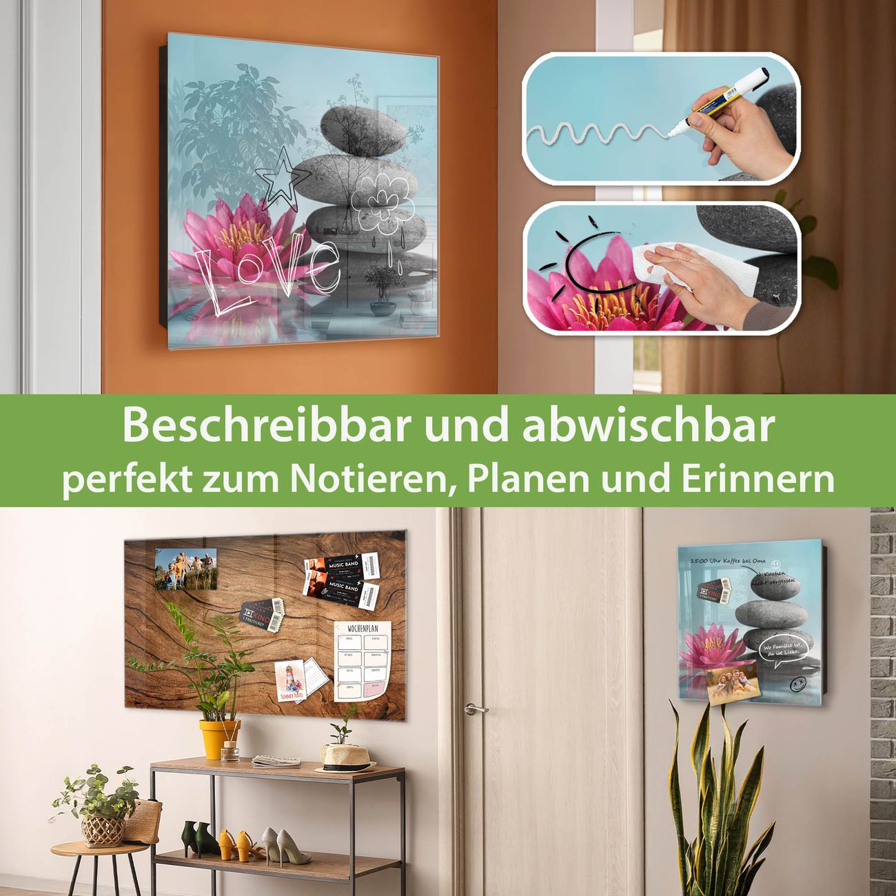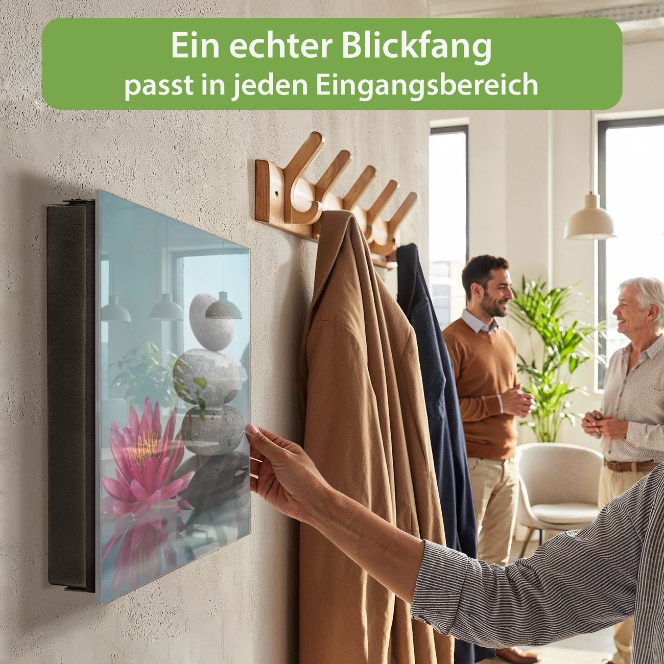 Bringe Ordnung und Eleganz in deinen Eingangsbereich mit dem banjado Schlüsselkasten Motiv Motiv Lotus Und Steine . Die moderne Schlüsselbox kombiniert funktionales Design mit hochwertiger Verarbeitung und wird so zu einem echten Hingucker in Flur, Büro oder Ferienwohnung. ✅ Stilvolle Schlüsselaufbewahrung mit Glasfront im Motiv Motiv Lotus Und Steine Der Design-Schlüsselkasten Motiv Motiv Lotus Und Steine bietet Platz für bis zu 50 Schlüssel, die auf 5 stabilen Reihen mit je 10 Haken übersichtlich verstaut werden. Mit seinen kompakten Maßen von 30 x 30 x 5 cm passt die Schlüsselbox perfekt auch in kleinere Räume. Der schwarz lackierte Stahlkorpus mit rechts angeschlagenem Türscharnier harmoniert mit der Glasfront und fügt sich nahtlos in jedes Wohnambiente ein. Ob als Schlüsselorganizer für Zuhause oder als praktische Lösung für Büros, Praxen und Gewerbe, der banjado Schlüsselkasten sorgt für Ordnung und Übersicht. Dank der magnetischen, mit Kreidestiften beschreibbaren Glasfront kannst du Notizen anheften oder Termine direkt auf der Oberfläche festhalten. Die Schlüsselbox Motiv Motiv Lotus Und Steine zur Wandmontage wird inklusive Befestigungsmaterial geliefert und ist schnell angebracht. So hast du deine Schlüssel jederzeit griffbereit und zugleich stilvoll verstaut. Mit diesem banjado Schlüsselkasten Motiv Motiv Lotus Und Steine kombinierst du praktische Aufbewahrung mit stilvollem Wohndesign. Ob privat oder geschäftlich, die Schlüsselbox sorgt für mehr Ordnung, Übersicht und ein wohnliches Ambiente.Vorteile im Überblick
