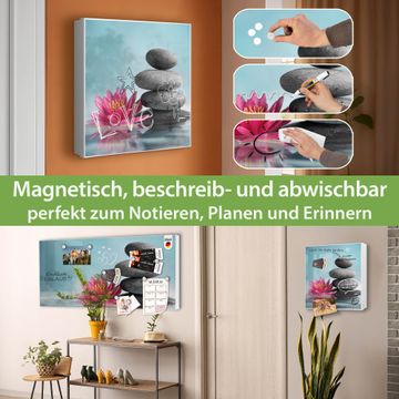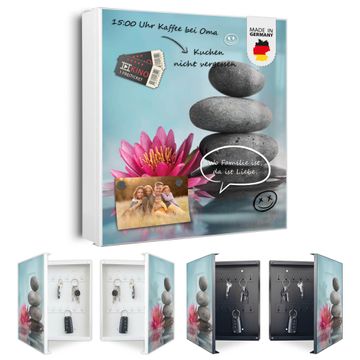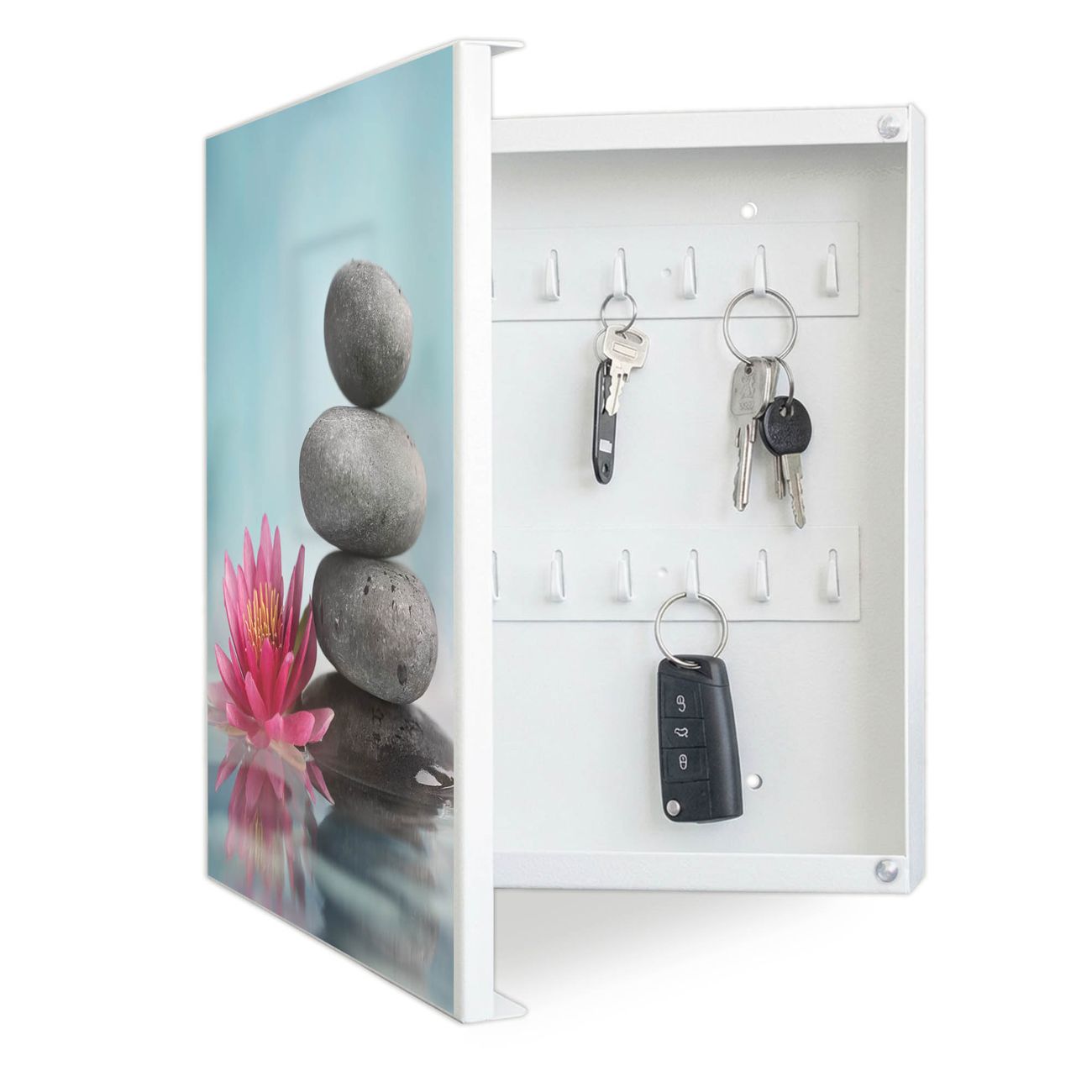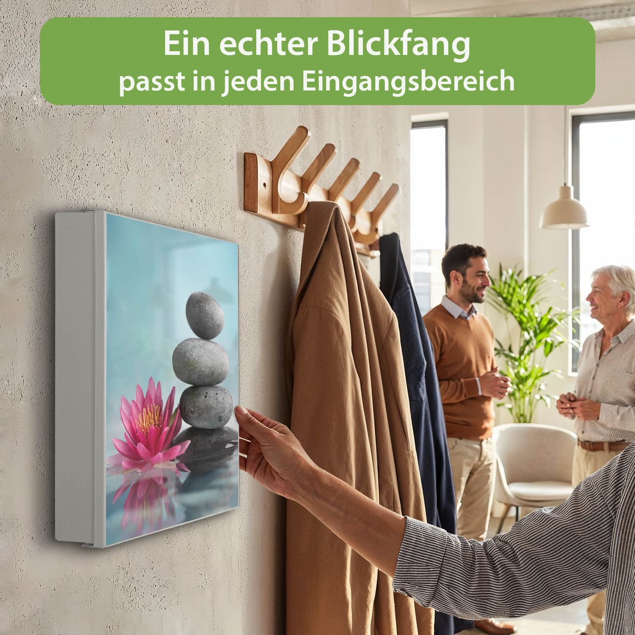 Bringe Ordnung und Eleganz in deinen Eingangsbereich mit dem banjado Schlüsselkasten Motiv Motiv Lotus Und Steine . Die moderne Schlüsselbox kombiniert funktionales Design mit hochwertiger Verarbeitung und wird so zu einem echten Hingucker in Flur, Büro oder Ferienwohnung. ✅ Stilvolle Schlüsselaufbewahrung mit Motiv Motiv Lotus Und Steine Der Design-Schlüsselkasten Motiv Motiv Lotus Und Steine bietet Platz für bis zu 32 Schlüssel, die auf 4 stabilen Reihen mit je 8 Haken übersichtlich verstaut werden. Mit seinen kompakten Maßen von 30 x 30 x 5 cm passt die Schlüsselbox perfekt auch in kleinere Räume. Der weiß lackierte Stahlkorpus mit links angeschlagenem Türscharnier harmoniert mit gedruckten Folie auf der Front und fügt sich nahtlos in jedes Wohnambiente ein. Ob als Schlüsselorganizer für Zuhause oder als praktische Lösung für Büros, Praxen und Gewerbe, der banjado Schlüsselkasten sorgt für Ordnung und Übersicht. Dank der magnetischen, mit Kreidestiften beschreibbaren Folie auf der Front kannst du Notizen anheften oder Termine direkt auf der Oberfläche festhalten. Die Schlüsselbox Motiv Motiv Lotus Und Steine zur Wandmontage wird inklusive Befestigungsmaterial geliefert und ist schnell angebracht. So hast du deine Schlüssel jederzeit griffbereit und zugleich stilvoll verstaut. Mit diesem banjado Schlüsselkasten Motiv Motiv Lotus Und Steine kombinierst du praktische Aufbewahrung mit stilvollem Wohndesign. Ob privat oder geschäftlich, die Schlüsselbox sorgt für mehr Ordnung, Übersicht und ein wohnliches Ambiente.Vorteile im Überblick