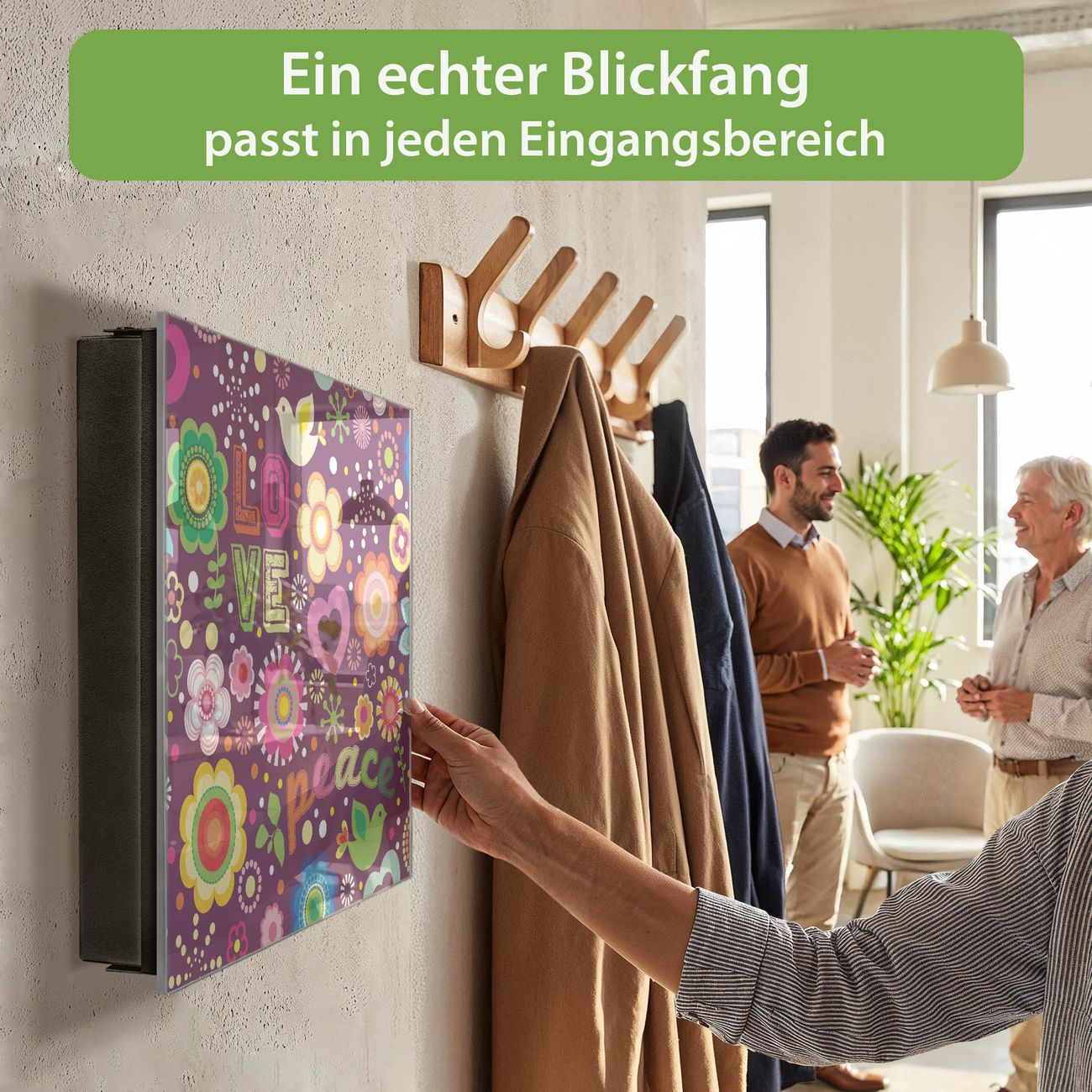 Bringe Ordnung und Eleganz in deinen Eingangsbereich mit dem banjado Schlüsselkasten Motiv Motiv Love and Peace. Die moderne Schlüsselbox kombiniert funktionales Design mit hochwertiger Verarbeitung und wird so zu einem echten Hingucker in Flur, Büro oder Ferienwohnung. ✅ Stilvolle Schlüsselaufbewahrung mit Glasfront im Motiv Motiv Love and Peace Der Design-Schlüsselkasten Motiv Motiv Love and Peace bietet Platz für bis zu 50 Schlüssel, die auf 5 stabilen Reihen mit je 10 Haken übersichtlich verstaut werden. Mit seinen kompakten Maßen von 30 x 30 x 5 cm passt die Schlüsselbox perfekt auch in kleinere Räume. Der schwarz lackierte Stahlkorpus mit rechts angeschlagenem Türscharnier harmoniert mit der Glasfront und fügt sich nahtlos in jedes Wohnambiente ein. Ob als Schlüsselorganizer für Zuhause oder als praktische Lösung für Büros, Praxen und Gewerbe, der banjado Schlüsselkasten sorgt für Ordnung und Übersicht. Dank der magnetischen, mit Kreidestiften beschreibbaren Glasfront kannst du Notizen anheften oder Termine direkt auf der Oberfläche festhalten. Die Schlüsselbox Motiv Motiv Love and Peace zur Wandmontage wird inklusive Befestigungsmaterial geliefert und ist schnell angebracht. So hast du deine Schlüssel jederzeit griffbereit und zugleich stilvoll verstaut. Mit diesem banjado Schlüsselkasten Motiv Motiv Love and Peace kombinierst du praktische Aufbewahrung mit stilvollem Wohndesign. Ob privat oder geschäftlich, die Schlüsselbox sorgt für mehr Ordnung, Übersicht und ein wohnliches Ambiente.Vorteile im Überblick
