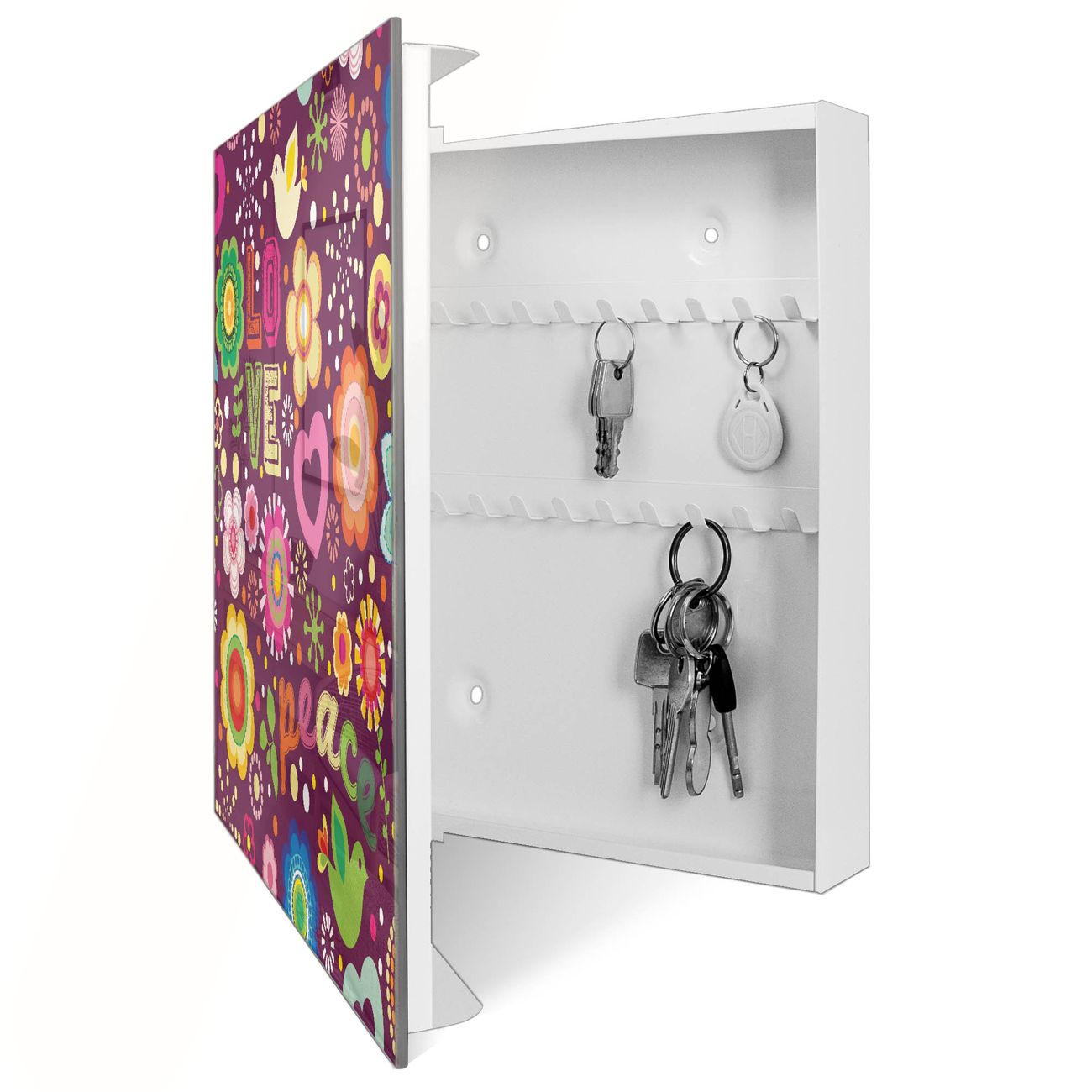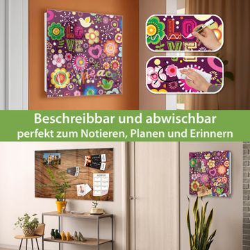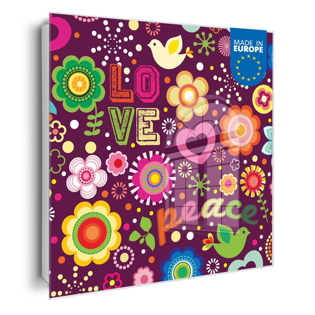 Bringe Ordnung und Eleganz in deinen Eingangsbereich mit dem banjado Schlüsselkasten Motiv Motiv Love and Peace. Die moderne Schlüsselbox kombiniert funktionales Design mit hochwertiger Verarbeitung und wird so zu einem echten Hingucker in Flur, Büro oder Ferienwohnung. ✅ Stilvolle Schlüsselaufbewahrung mit Glasfront im Motiv Motiv Love and Peace Der Design-Schlüsselkasten Motiv Motiv Love and Peace bietet Platz für bis zu 50 Schlüssel, die auf 5 stabilen Reihen mit je 10 Haken übersichtlich verstaut werden. Mit seinen kompakten Maßen von 30 x 30 x 5 cm passt die Schlüsselbox perfekt auch in kleinere Räume. Der weiß lackierte Stahlkorpus mit rechts angeschlagenem Türscharnier harmoniert mit der Glasfront und fügt sich nahtlos in jedes Wohnambiente ein. Ob als Schlüsselorganizer für Zuhause oder als praktische Lösung für Büros, Praxen und Gewerbe, der banjado Schlüsselkasten sorgt für Ordnung und Übersicht. Dank der magnetischen, mit Kreidestiften beschreibbaren Glasfront kannst du Notizen anheften oder Termine direkt auf der Oberfläche festhalten. Die Schlüsselbox Motiv Motiv Love and Peace zur Wandmontage wird inklusive Befestigungsmaterial geliefert und ist schnell angebracht. So hast du deine Schlüssel jederzeit griffbereit und zugleich stilvoll verstaut. Mit diesem banjado Schlüsselkasten Motiv Motiv Love and Peace kombinierst du praktische Aufbewahrung mit stilvollem Wohndesign. Ob privat oder geschäftlich, die Schlüsselbox sorgt für mehr Ordnung, Übersicht und ein wohnliches Ambiente.Vorteile im Überblick
