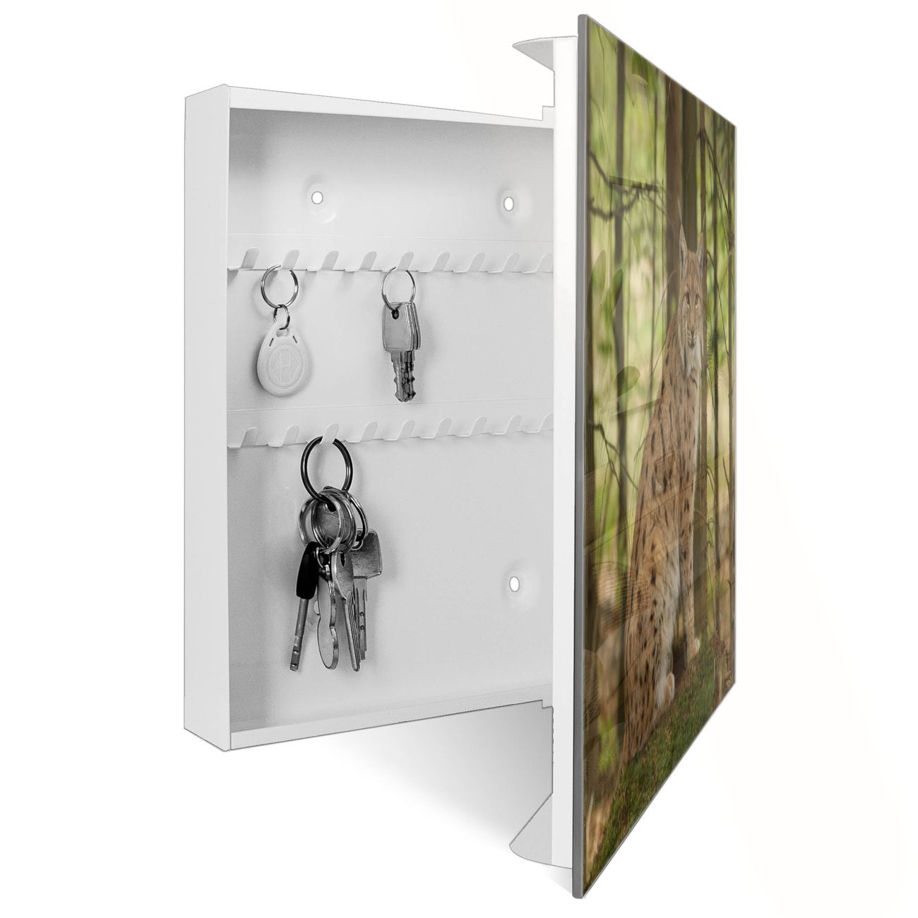 Bringe Ordnung und Eleganz in deinen Eingangsbereich mit dem banjado Schlüsselkasten Motiv Motiv Luchs. Die moderne Schlüsselbox kombiniert funktionales Design mit hochwertiger Verarbeitung und wird so zu einem echten Hingucker in Flur, Büro oder Ferienwohnung. ✅ Stilvolle Schlüsselaufbewahrung mit Glasfront im Motiv Motiv Luchs Der Design-Schlüsselkasten Motiv Motiv Luchs bietet Platz für bis zu 50 Schlüssel, die auf 5 stabilen Reihen mit je 10 Haken übersichtlich verstaut werden. Mit seinen kompakten Maßen von 30 x 30 x 5 cm passt die Schlüsselbox perfekt auch in kleinere Räume. Der weiß lackierte Stahlkorpus mit rechts angeschlagenem Türscharnier harmoniert mit der Glasfront und fügt sich nahtlos in jedes Wohnambiente ein. Ob als Schlüsselorganizer für Zuhause oder als praktische Lösung für Büros, Praxen und Gewerbe, der banjado Schlüsselkasten sorgt für Ordnung und Übersicht. Dank der magnetischen, mit Kreidestiften beschreibbaren Glasfront kannst du Notizen anheften oder Termine direkt auf der Oberfläche festhalten. Die Schlüsselbox Motiv Motiv Luchs zur Wandmontage wird inklusive Befestigungsmaterial geliefert und ist schnell angebracht. So hast du deine Schlüssel jederzeit griffbereit und zugleich stilvoll verstaut. Mit diesem banjado Schlüsselkasten Motiv Motiv Luchs kombinierst du praktische Aufbewahrung mit stilvollem Wohndesign. Ob privat oder geschäftlich, die Schlüsselbox sorgt für mehr Ordnung, Übersicht und ein wohnliches Ambiente.Vorteile im Überblick