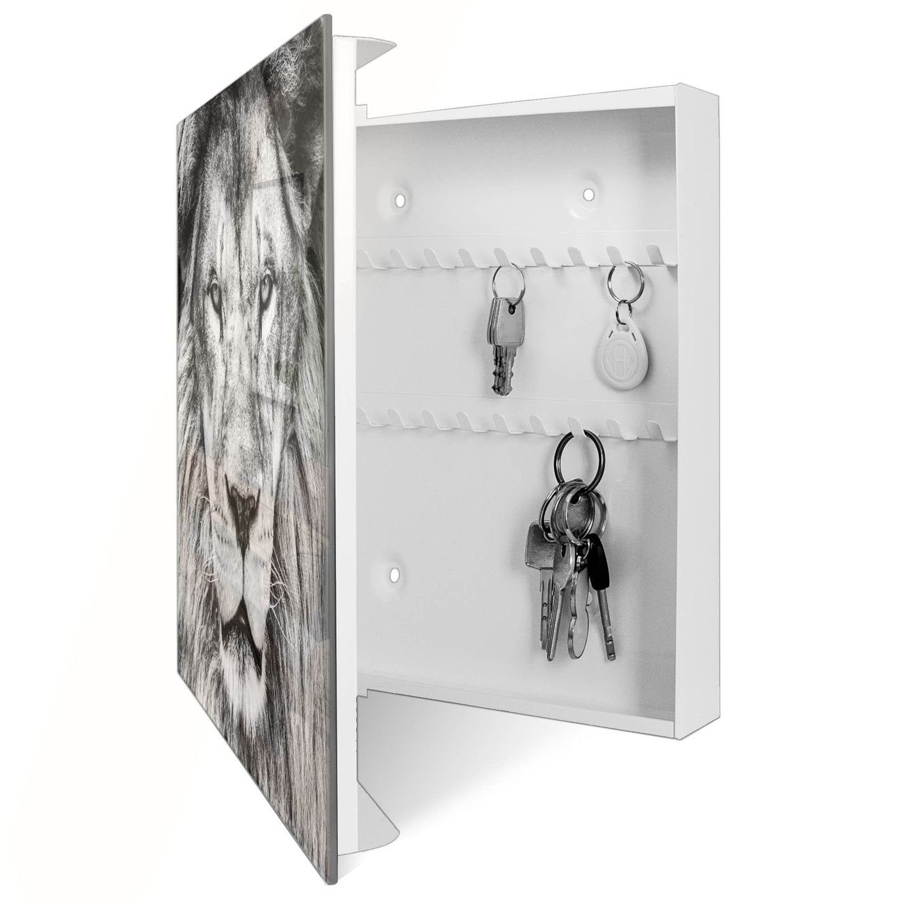 Bringe Ordnung und Eleganz in deinen Eingangsbereich mit dem banjado Schlüsselkasten Motiv Motiv Ludwig. Die moderne Schlüsselbox kombiniert funktionales Design mit hochwertiger Verarbeitung und wird so zu einem echten Hingucker in Flur, Büro oder Ferienwohnung. ✅ Stilvolle Schlüsselaufbewahrung mit Glasfront im Motiv Motiv Ludwig Der Design-Schlüsselkasten Motiv Motiv Ludwig bietet Platz für bis zu 50 Schlüssel, die auf 5 stabilen Reihen mit je 10 Haken übersichtlich verstaut werden. Mit seinen kompakten Maßen von 30 x 30 x 5 cm passt die Schlüsselbox perfekt auch in kleinere Räume. Der weiß lackierte Stahlkorpus mit rechts angeschlagenem Türscharnier harmoniert mit der Glasfront und fügt sich nahtlos in jedes Wohnambiente ein. Ob als Schlüsselorganizer für Zuhause oder als praktische Lösung für Büros, Praxen und Gewerbe, der banjado Schlüsselkasten sorgt für Ordnung und Übersicht. Dank der magnetischen, mit Kreidestiften beschreibbaren Glasfront kannst du Notizen anheften oder Termine direkt auf der Oberfläche festhalten. Die Schlüsselbox Motiv Motiv Ludwig zur Wandmontage wird inklusive Befestigungsmaterial geliefert und ist schnell angebracht. So hast du deine Schlüssel jederzeit griffbereit und zugleich stilvoll verstaut. Mit diesem banjado Schlüsselkasten Motiv Motiv Ludwig kombinierst du praktische Aufbewahrung mit stilvollem Wohndesign. Ob privat oder geschäftlich, die Schlüsselbox sorgt für mehr Ordnung, Übersicht und ein wohnliches Ambiente.Vorteile im Überblick
