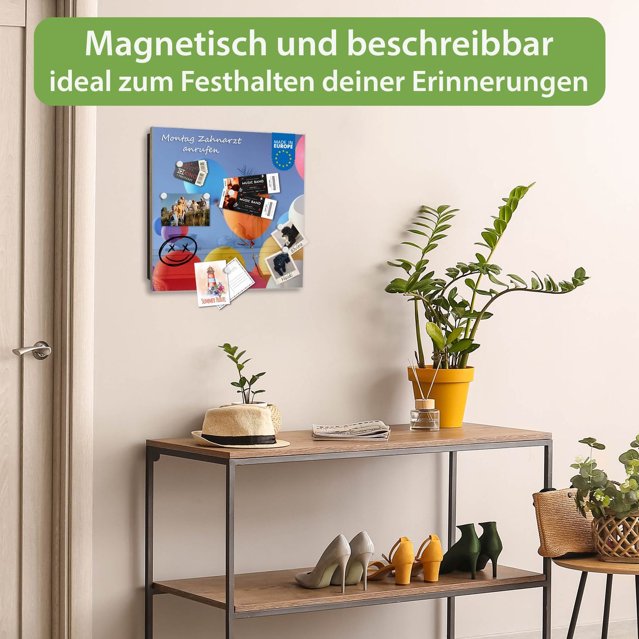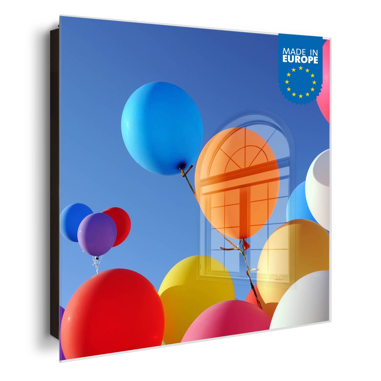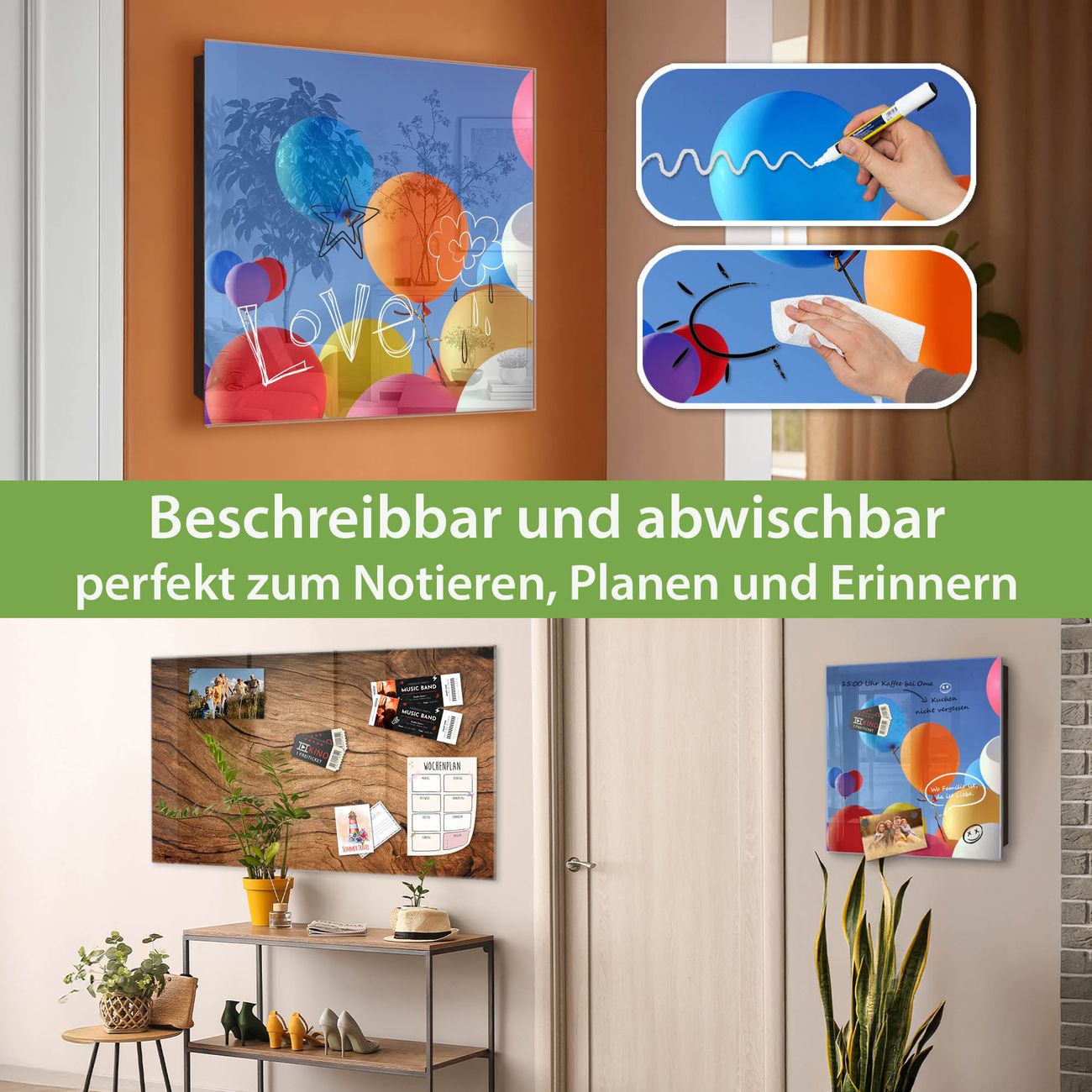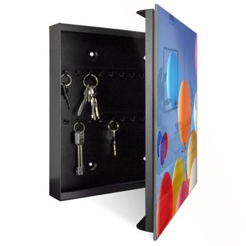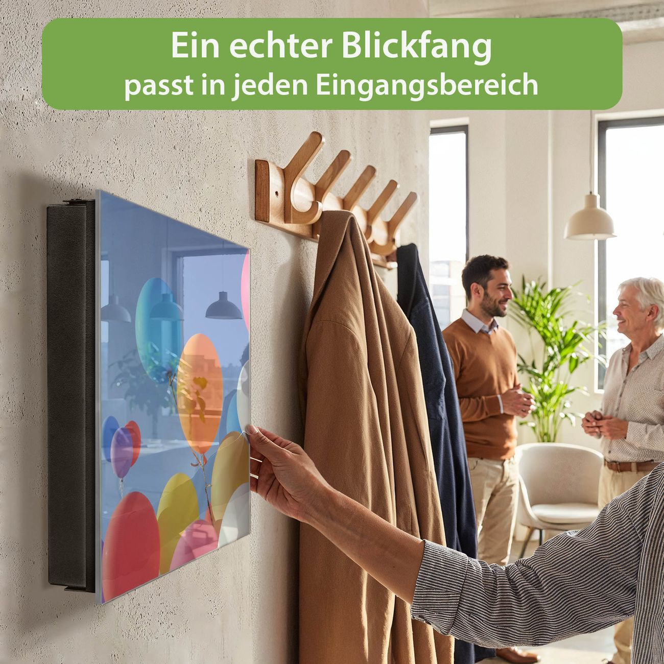 Bringe Ordnung und Eleganz in deinen Eingangsbereich mit dem banjado Schlüsselkasten Motiv Motiv Luftballons. Die moderne Schlüsselbox kombiniert funktionales Design mit hochwertiger Verarbeitung und wird so zu einem echten Hingucker in Flur, Büro oder Ferienwohnung. ✅ Stilvolle Schlüsselaufbewahrung mit Glasfront im Motiv Motiv Luftballons Der Design-Schlüsselkasten Motiv Motiv Luftballons bietet Platz für bis zu 50 Schlüssel, die auf 5 stabilen Reihen mit je 10 Haken übersichtlich verstaut werden. Mit seinen kompakten Maßen von 30 x 30 x 5 cm passt die Schlüsselbox perfekt auch in kleinere Räume. Der schwarz lackierte Stahlkorpus mit rechts angeschlagenem Türscharnier harmoniert mit der Glasfront und fügt sich nahtlos in jedes Wohnambiente ein. Ob als Schlüsselorganizer für Zuhause oder als praktische Lösung für Büros, Praxen und Gewerbe, der banjado Schlüsselkasten sorgt für Ordnung und Übersicht. Dank der magnetischen, mit Kreidestiften beschreibbaren Glasfront kannst du Notizen anheften oder Termine direkt auf der Oberfläche festhalten. Die Schlüsselbox Motiv Motiv Luftballons zur Wandmontage wird inklusive Befestigungsmaterial geliefert und ist schnell angebracht. So hast du deine Schlüssel jederzeit griffbereit und zugleich stilvoll verstaut. Mit diesem banjado Schlüsselkasten Motiv Motiv Luftballons kombinierst du praktische Aufbewahrung mit stilvollem Wohndesign. Ob privat oder geschäftlich, die Schlüsselbox sorgt für mehr Ordnung, Übersicht und ein wohnliches Ambiente.Vorteile im Überblick