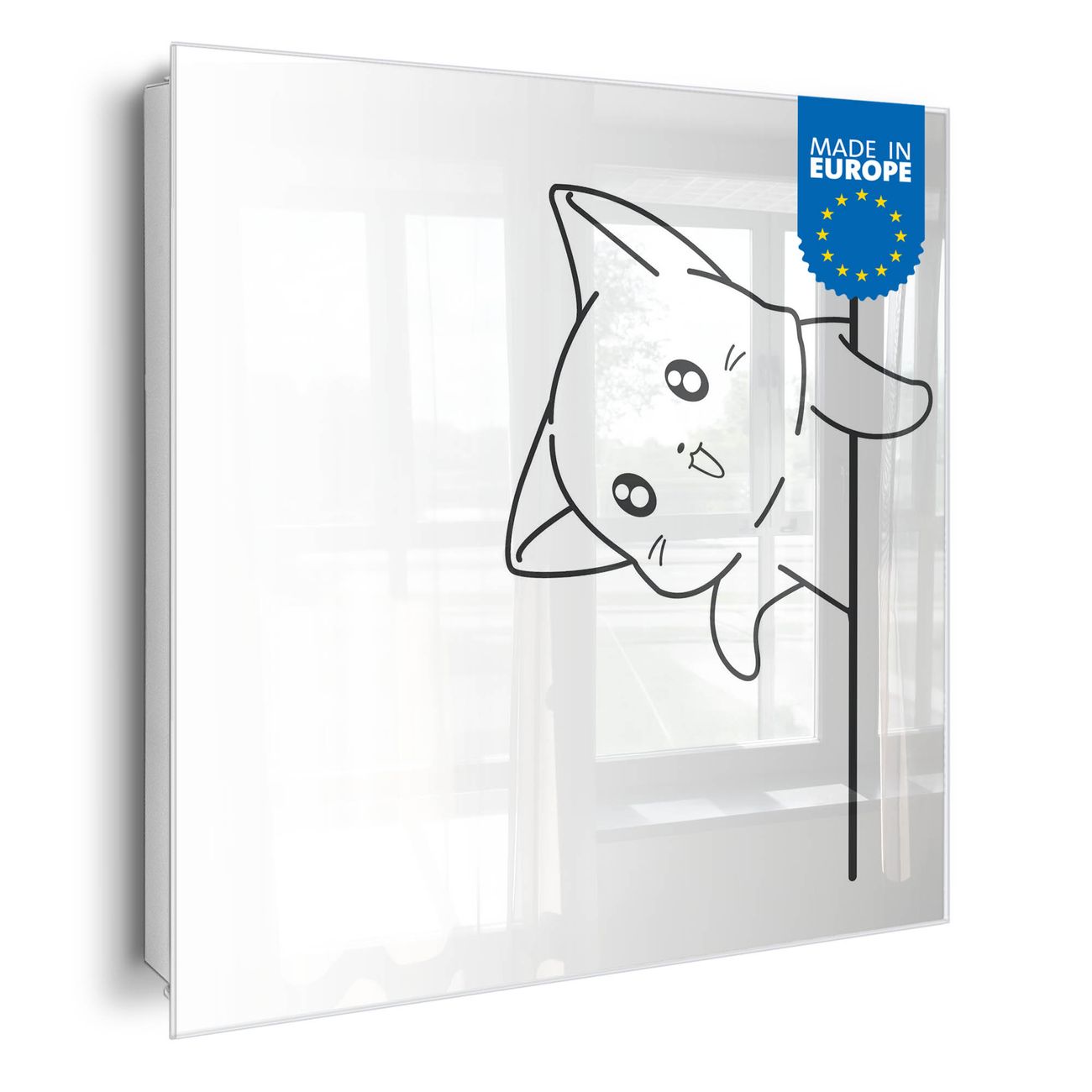 Bringe Ordnung und Eleganz in deinen Eingangsbereich mit dem banjado Schlüsselkasten Motiv Motiv Lustige Katze am Rand. Die moderne Schlüsselbox kombiniert funktionales Design mit hochwertiger Verarbeitung und wird so zu einem echten Hingucker in Flur, Büro oder Ferienwohnung. ✅ Stilvolle Schlüsselaufbewahrung mit Glasfront im Motiv Motiv Lustige Katze am Rand Der Design-Schlüsselkasten Motiv Motiv Lustige Katze am Rand bietet Platz für bis zu 50 Schlüssel, die auf 5 stabilen Reihen mit je 10 Haken übersichtlich verstaut werden. Mit seinen kompakten Maßen von 30 x 30 x 5 cm passt die Schlüsselbox perfekt auch in kleinere Räume. Der weiß lackierte Stahlkorpus mit rechts angeschlagenem Türscharnier harmoniert mit der Glasfront und fügt sich nahtlos in jedes Wohnambiente ein. Ob als Schlüsselorganizer für Zuhause oder als praktische Lösung für Büros, Praxen und Gewerbe, der banjado Schlüsselkasten sorgt für Ordnung und Übersicht. Dank der magnetischen, mit Kreidestiften beschreibbaren Glasfront kannst du Notizen anheften oder Termine direkt auf der Oberfläche festhalten. Die Schlüsselbox Motiv Motiv Lustige Katze am Rand zur Wandmontage wird inklusive Befestigungsmaterial geliefert und ist schnell angebracht. So hast du deine Schlüssel jederzeit griffbereit und zugleich stilvoll verstaut. Mit diesem banjado Schlüsselkasten Motiv Motiv Lustige Katze am Rand kombinierst du praktische Aufbewahrung mit stilvollem Wohndesign. Ob privat oder geschäftlich, die Schlüsselbox sorgt für mehr Ordnung, Übersicht und ein wohnliches Ambiente.Vorteile im Überblick